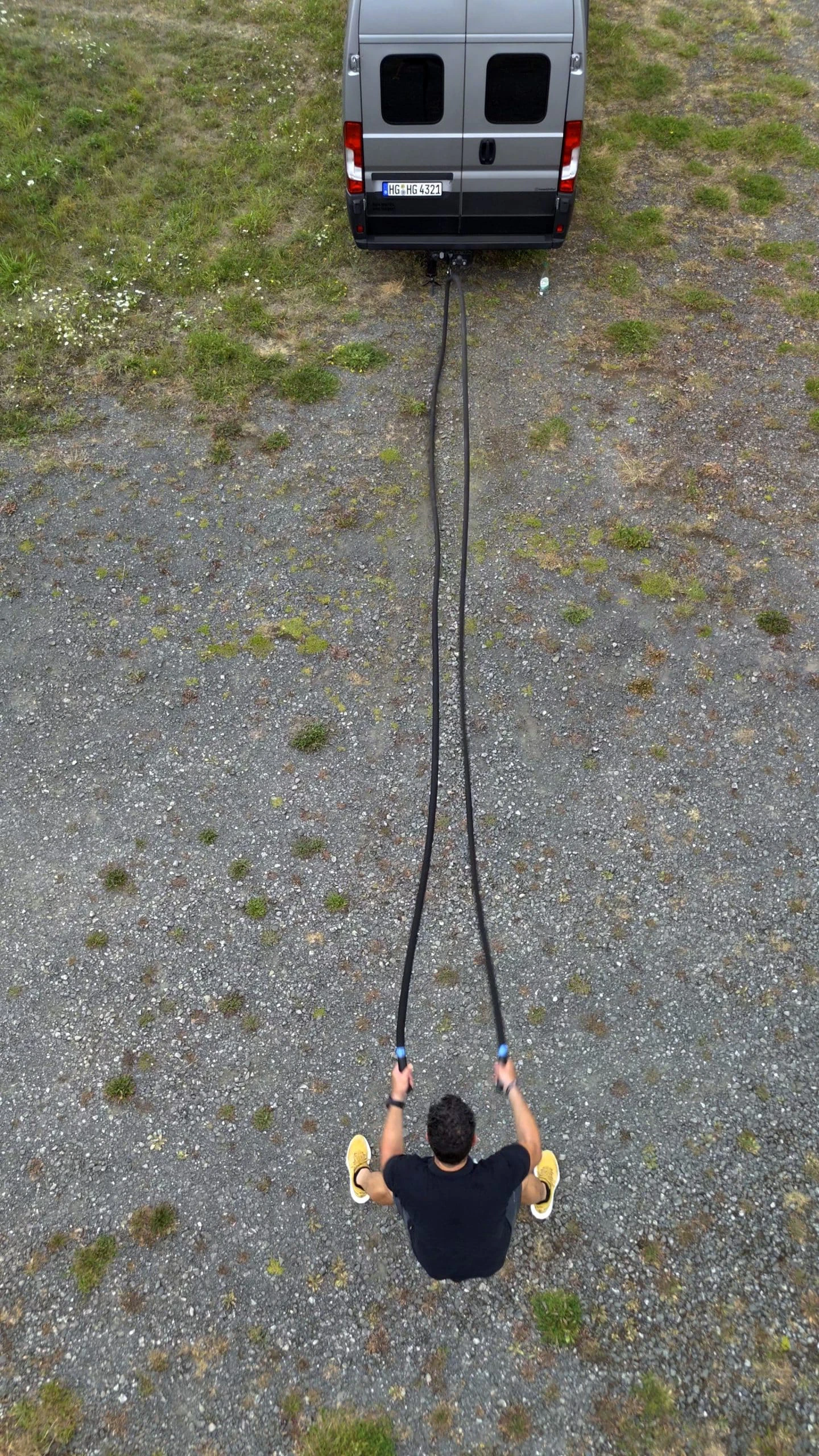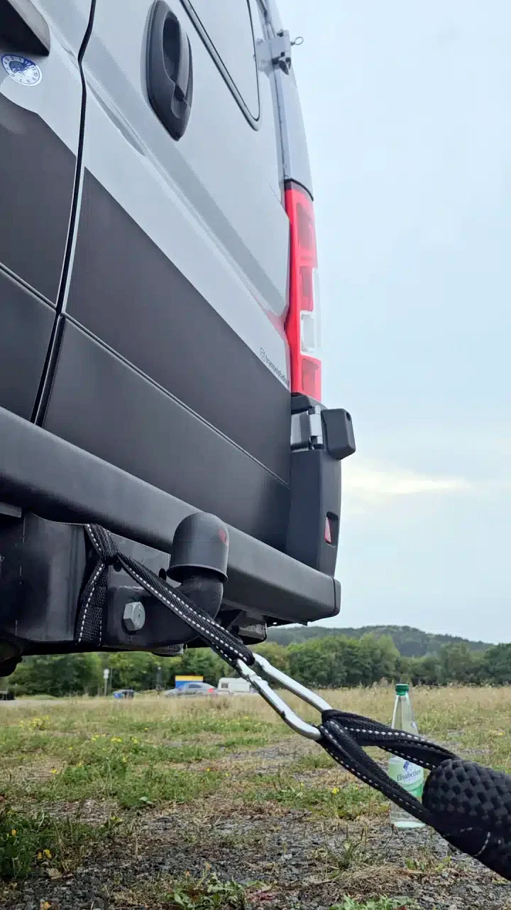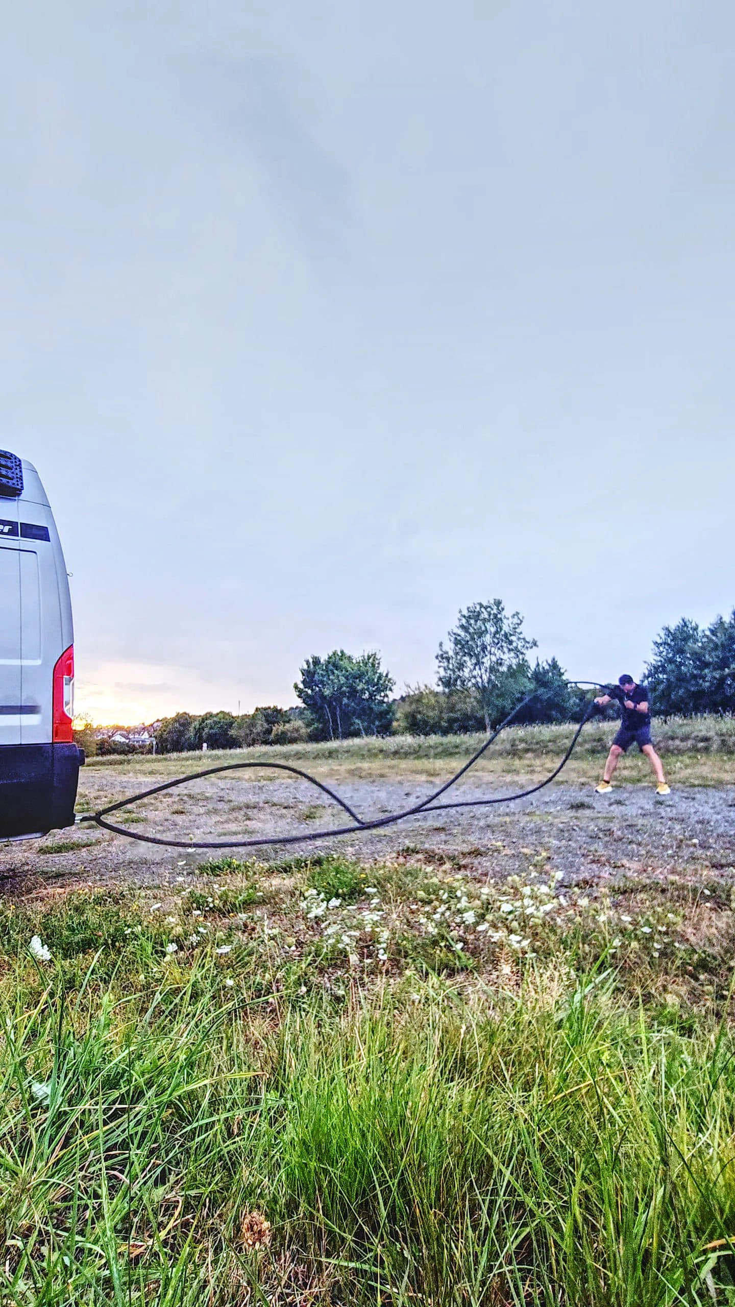 Das Training mit dem 12-kg-Seil war intensiver als erwartet. Die hohe Belastung sorgt dafür, dass Arme, Schultern, Rumpf und Beine gleichermaßen gefordert werden – ein effektives Ganzkörpertraining, das schnell an die eigenen Grenzen bringt. Wichtig: Für Workouts am Camper sollte man mindestens acht Meter Platz hinter dem Fahrzeug einplanen.