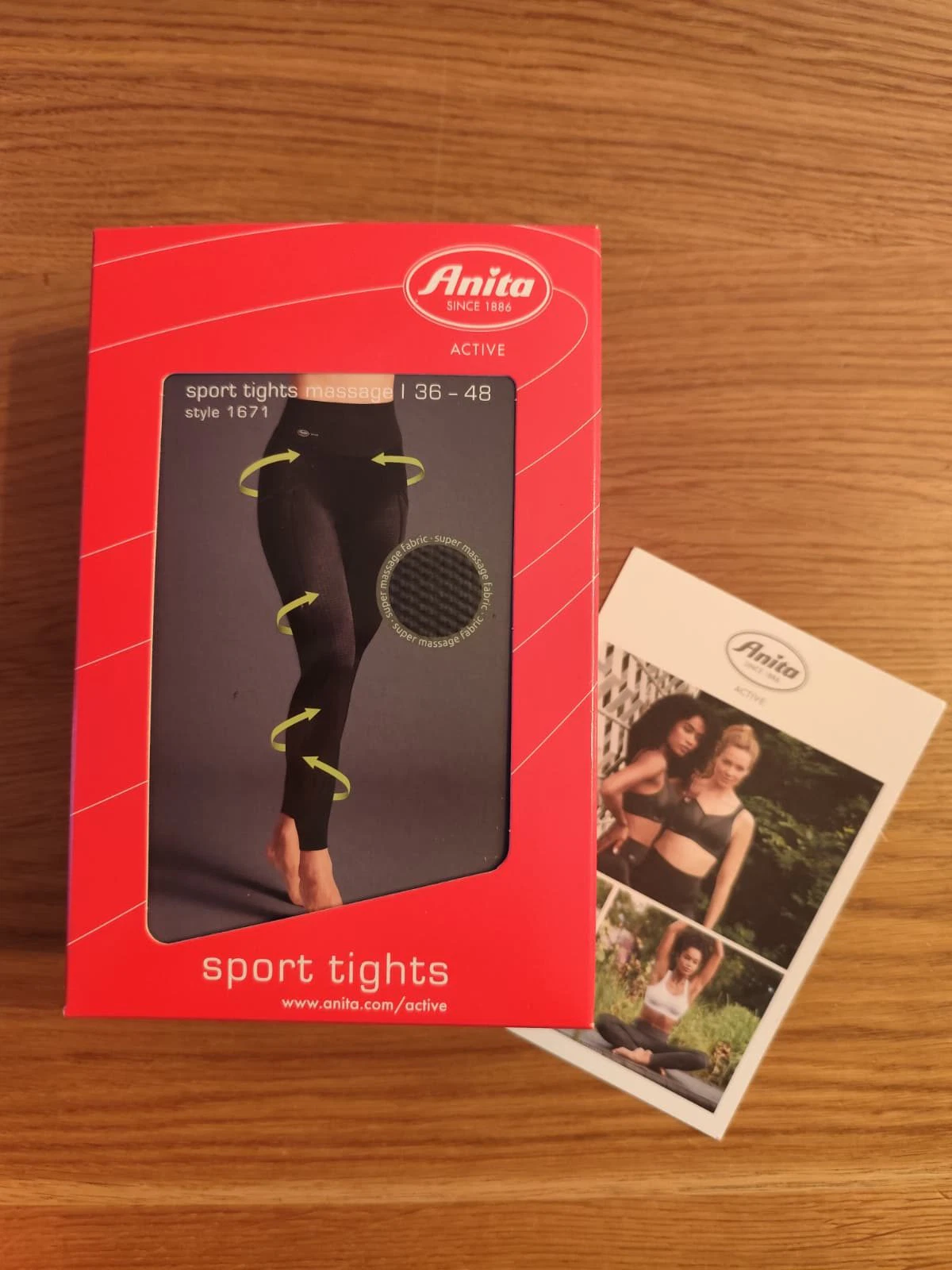 Die Sport Tights Massage von Anita® wird in einer ansprechenden Umverpackung geliefert. Beim Auspacken machen die Sport-Leggings einen hochwertigen Eindruck – das Material fühlt sich fest, elastisch und robust an. Die Farbgebung ist ein sportlich-elegantes Schwarz. Die Hose gibt es noch in einer zweiten Farbgebung Pulse, schwarz mit goldenem Muster. Auffallend ist ein weiches, breites Bundband. Auf beiden Seiten befinden sich Taschen auf Höhe der Oberschenkel, die genügend Platz für ein Handy oder Riegel / Gels bieten. Der Beinabschluss zeigt keine Bündchen. Insgesamt entsteht ein guter erster Eindruck der Sport-Leggings, die Funktion und Tragekomfort gut verbindet.