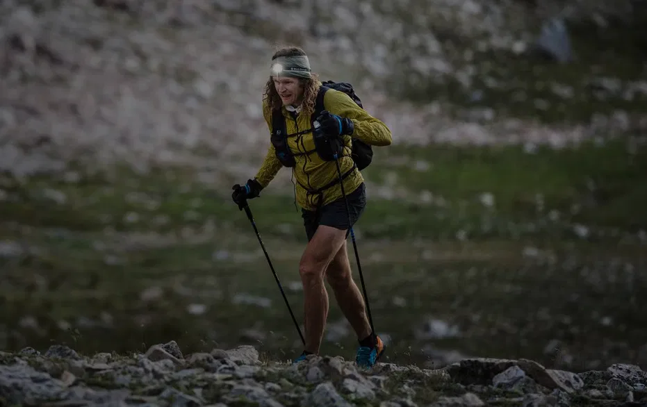 An der Front sind seitengleich jeweils eine größere Netztasche für 500-600-ml-Flasks sowie davor zwei kleinere Netztaschen für Riegel oder Gels angebracht. In einer dieser beiden kleineren Netztaschen befindet sich die obligatorische Signalpfeife. Oberhalb dieser beiden Netztaschen gibt es jeweils eine mittelgroße Tasche, welche mit einem Reißverschluss verschließbar ist. Hier passen ebenfalls Riegel und Gels rein. Für ein Smartphone findet sich an der Front, wenn große Flasks transportiert werden, kein Platz. Die zwei Brustgurte zum Verschließen des BD Distance 8 an der Front sind höhen- und weitenverstellbar. An den beiden Flanken befinden sich die Zugsysteme für die Anpassung des Laufrucksacks. Das Hauptfach kann ausschließlich von oben durch eine große Öffnung geöffnet und befüllt werden. Der Verschluss hierfür ist ein Zugsystem, das einfach zu bedienen ist. Darüber wird noch zum “Abdichten” ein trapezförmiger Abschluss gelegt und mit einem Haken geschlossen. Das Innere des Hauptfachs verfügt über eine Trennwand aus Netzgewebe und eine Halterung für eine Trinkblase mit bis zu 2 L Volumen. Davor ist das eigentliche Hauptfach, was laut Hersteller 8 L fasst. In dem findet ganz locker alles Platz, was man für einen Tag auf den Trails oder beim Wandern benötigt, also ganz locker die übliche Pflichtausrüstung für einen Ultratrail und vieles mehr. Zusätzlich befindet sich im Hauptfach noch ein Sicherheitsfach mit Reißverschluss für Geldbeutel und Schlüssel. An den Seiten ist zusätzlich noch jeweils über ca. ⅔ des Hauptfachs ein Kordelzugsystem angebracht, unter dem man noch eine Jacke oder ein Seil oder ähnliches verstauen kann. An sich ist dieses Zugsystem für zwei Sachen geeignet. Zum einen zum Verkleinern des Hauptfachs, wenn dieses nicht gänzlich gefüllt ist und zum anderen zum Transport von Eispickel, Eisaxt oder ähnlichem. Zusätzlich ist zwischen Hauptfach und der robusten “Außenhaut” noch auf jeder Seite ein Fach zum Verstauen der Stöcke vorgesehen. Der Vollständigkeit halber sei noch erwähnt, dass man an der Unterseite des Stockfachs eine kleine Öffnung vorfindet, aus der man einen Haken zur Fixierung der oben erwähnten Eisgeräte nutzen kann. An der Unterseite des Hauptfachs ist noch eine größere Schlaufe zum zusätzlichen Transport von z. B. einer Isomatte o.ä. angebracht.