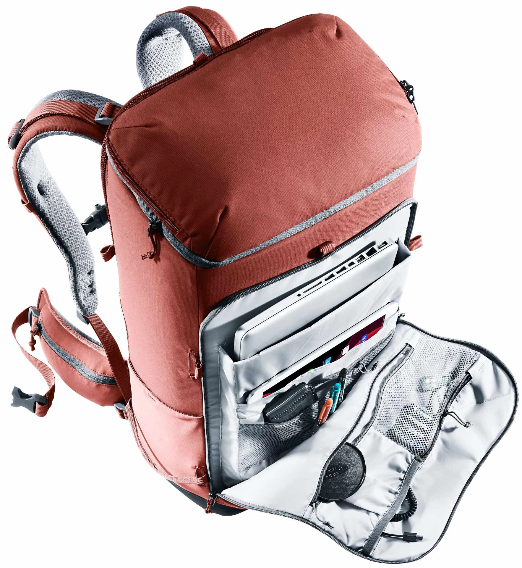 Der Rucksack ist frei von polyfluorierten Chemikalien. Deuter gibt an, dadurch die Verwendung von umweltschädlichen Substanzen, die Umwelt und Gesundheit belasten, zu reduzieren. Stattdessen verwendet deuter nun gesundheitlich unbedenkliche und umweltverträgliche DWR (Durable Water Repellency) Imprägnierung. Zudem ist das Garn des Hauptmaterials zu 100% aus recyceltem Material gefertigt.