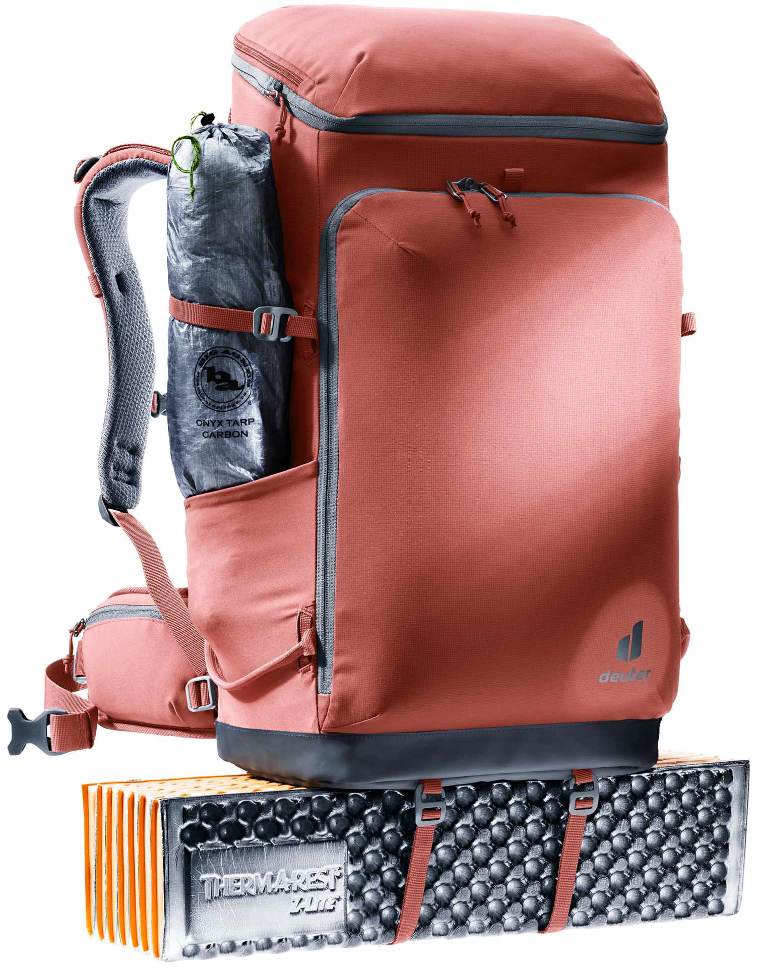 Abstellortes erleichtert. Es gibt den Rucksack in zwei unterschiedlichen Farben, wobei das zur Verfügung gestellte Testmodell in einem schlichten Schwarz gehalten ist. Als Alternative steht die deutlich auffälligere Farbe „Redwood“ zur Auswahl, wobei Gero froh war, ein schwarzes Modell durch die Eifel tragen zu dürfen. Dank der festen Wände und des Rundprofilrahmens aus Federstahl behält der Rucksack auch im leeren Zustand seine Quaderform und beeindruckt schon beim Auspacken mit seiner beachtlichen Größe von 36 x 60 x 25 cm (Außenmaße). Dabei fühlt sich der Rucksack mit seinen knapp 2,2 kg leicht an. Die Zuladungsempfehlung von deuter sind 6 bis 10 kg.