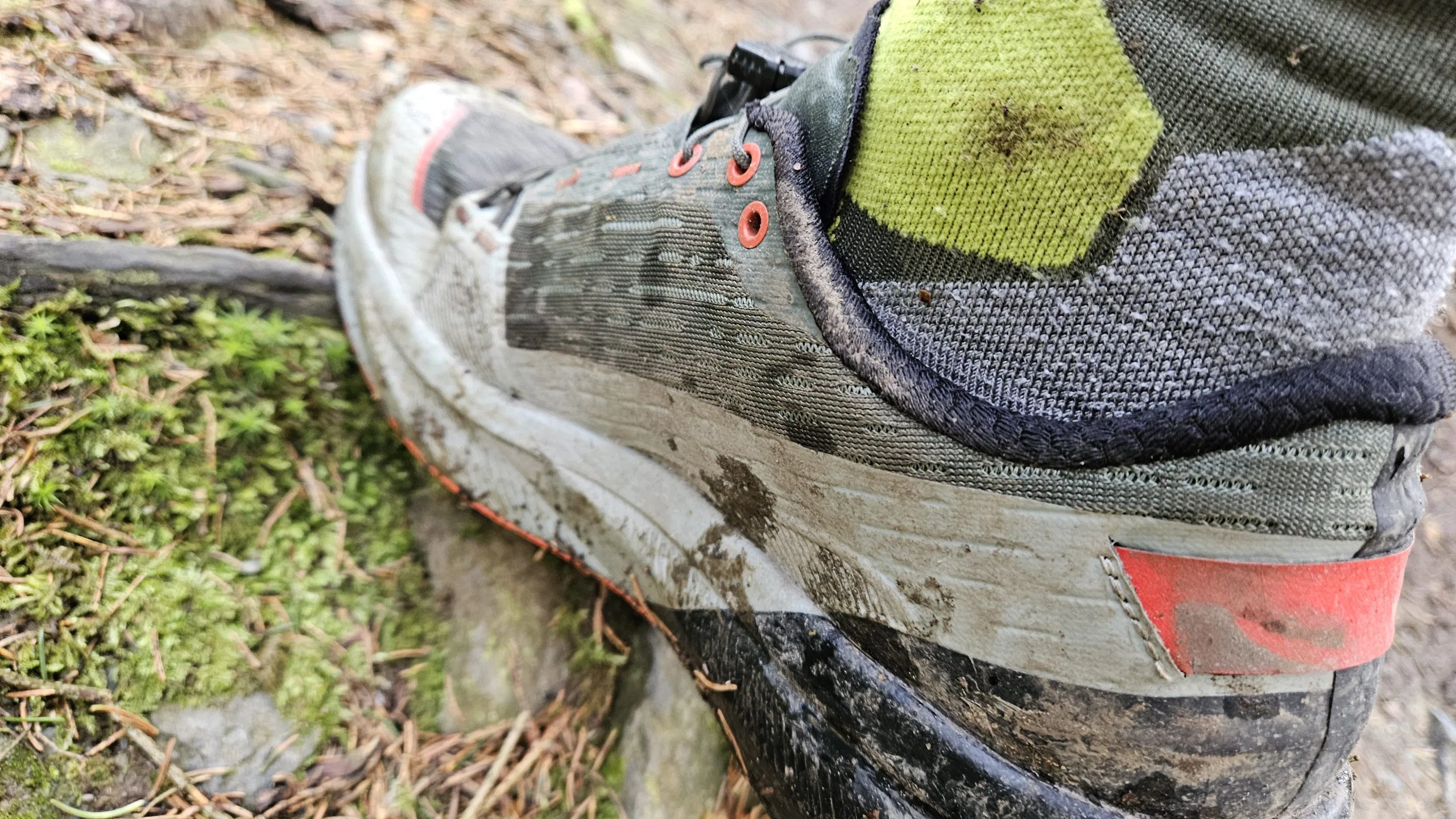 Die Sohle gewährt noch genügend Rückmeldung vom Untergrund, ohne aber das Steine zu sehr durchdrücken – selbst nach Stunden sind weder Dämpfung noch Fuß ermüdet. Der Rundumschutz ist klasse und schützt den Fuß auch auf steinigen Passagen hervorragend. Die recht dünne Zunge schützt den Spann ausreichend.