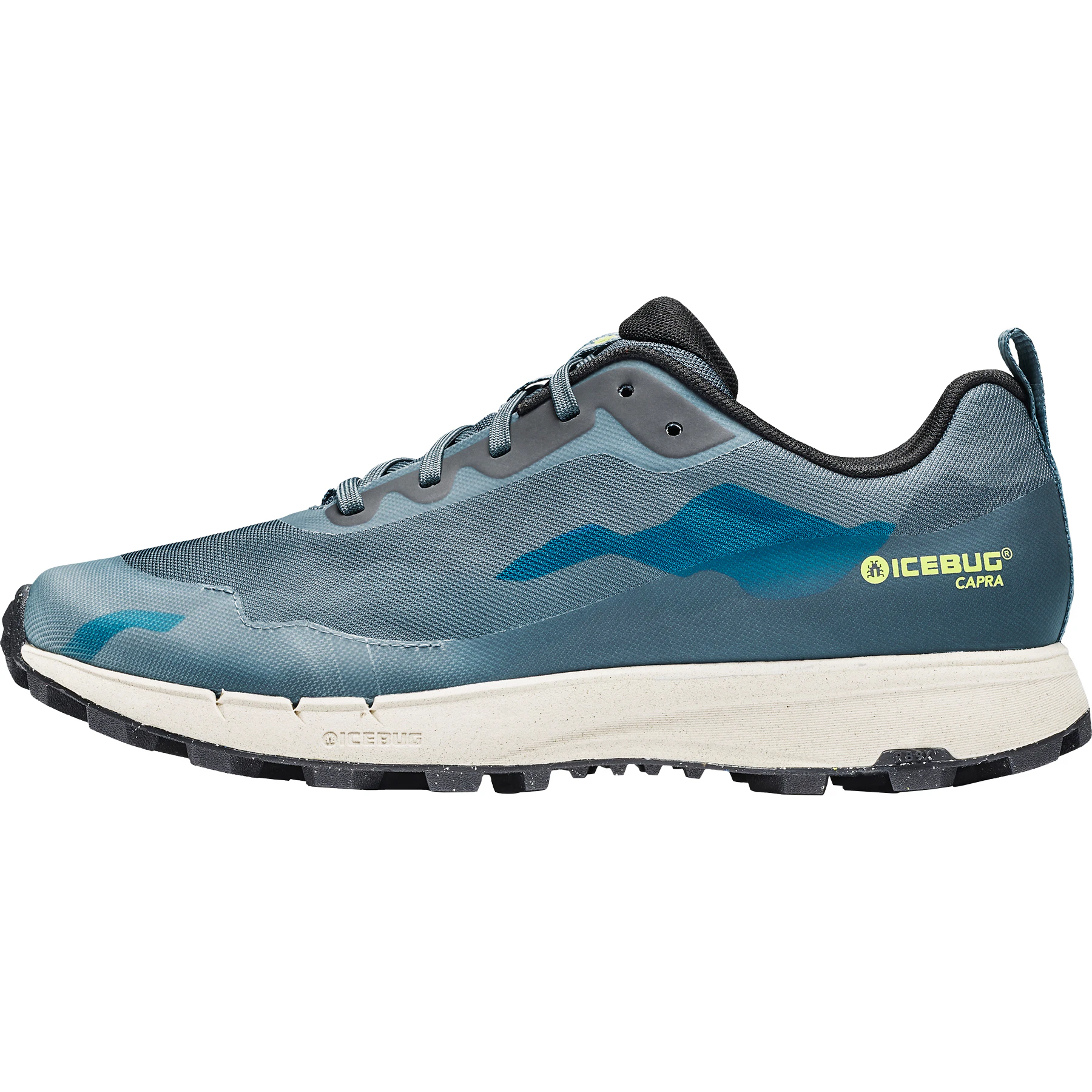 Der Icebug Capara wirkte beim Auspacken zuerst wie ein Sneaker auf unseren Tester, erst der Blick auf die Sohle entlarvte den Capra als Trailrunningschuh. Die Stollen der RB9X Sohle sind schon sehr massiv und nein, der Capra hat keine Spikes (Ja, es gibt auch Schuhe von Icebug ohne Spikes.). Das Obermaterial wirkt nicht nur äußerst robust, es ist auch stylisch sehr schön mit einer Bergsilhouette verziert. Toll ist zudem, dass sowohl die Außensohle als auch das Futter aus zu 100 % recycelten Materialien produziert sind und das bei gleichbleibender Qualität.
