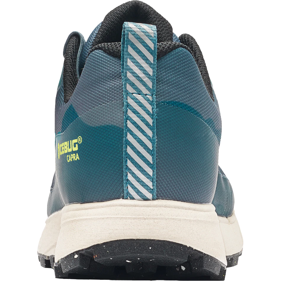 Um den Einfluss auf das Klima zu minimieren, wählten wir die Materialien sorgfältig aus und behielten dabei immer die Nachhaltigkeit im Auge. Das langlebige Upper ist leicht, weich und sitzt passgenauen, gleichzeitig bleibt die Toebox geräumig. Dank geschlossener Zellen nimmt die Polsterung des Schaftes und der Zunge auch bei nassen Bedingungen kaum Wasser auf. Für Sicherheit in hartem Terrain sorgt der protektive Rundum-Spritzschutz. Obermaterial und herausnehmbarer Innenschuh tragen zudem ein weiches Futter, das den Fuß sanft umschließt. Die Dual-Density-Mittelsohle besitzt eine Sprengung von 7 mm, versteckt außerdem leistungsfördernde Features wie einen 360º-Rand für Torsionssteifigkeit. Exzellente Dämpfungs- und Rückstoßqualitäten liefert der Capra dank seiner Mittelsohle aus BUGforce EVA. So trittst du sanft auf, spürst beim Antritt direkt die intensive Energierückgewinnung – und als wäre all das nicht genug, bietet das Rock-Shield im Vorfußbereich auch dann Schutz, wenn du beim Laufen auf scharfe Objekte trittst. Einzigartig ist zudem das Profil der Außensohle, die zur Krönung aus RB9X besteht. Multidirektionale Noppen sorgen für optimale Kontrolle, während sich unser Benchmark-Traktionsgummi vor allem auf nassen Oberflächen selbst übertrifft, ohne dabei die Langlebigkeit zu beeinträchtigen.
