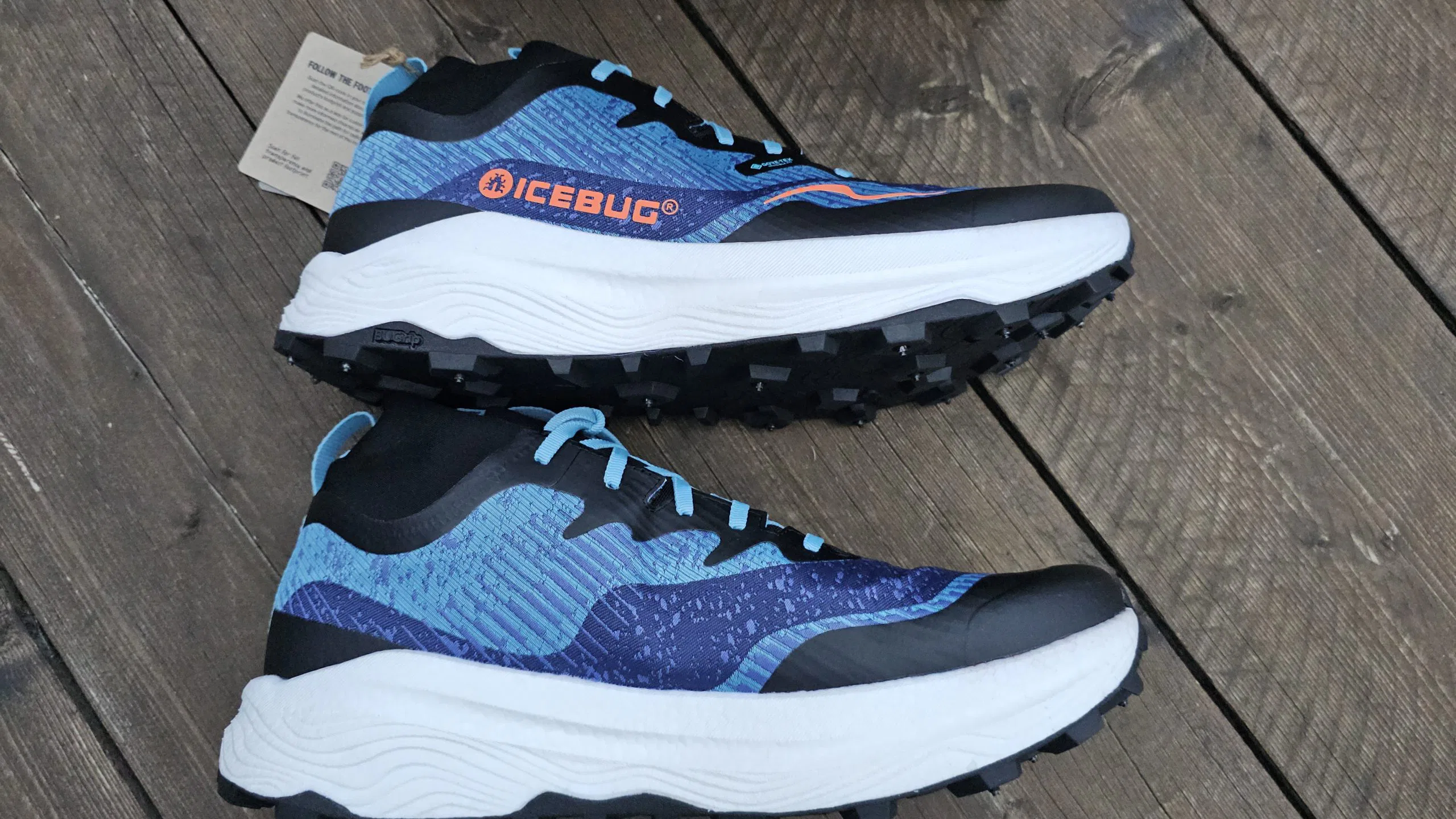 Der Icebug Järv Gaiter BUGrip GTX hinterlässt direkt beim Auspacken einen sehr hochwertigen Eindruck. Materialien und Verarbeitung wirken durchdacht und robust, Übergänge, Nähte und Verklebungen sind sauber umgesetzt. Optisch hebt sich der Schuh klar von klassischen Winterlaufschuhen ab. Die integrierte Gamasche fügt sich stimmig ins Design ein und wirkt funktional. Besonders positiv fällt auf, dass alle Spikes sauber und gleichmäßig in die Außensohle integriert sind.