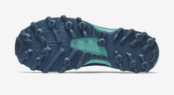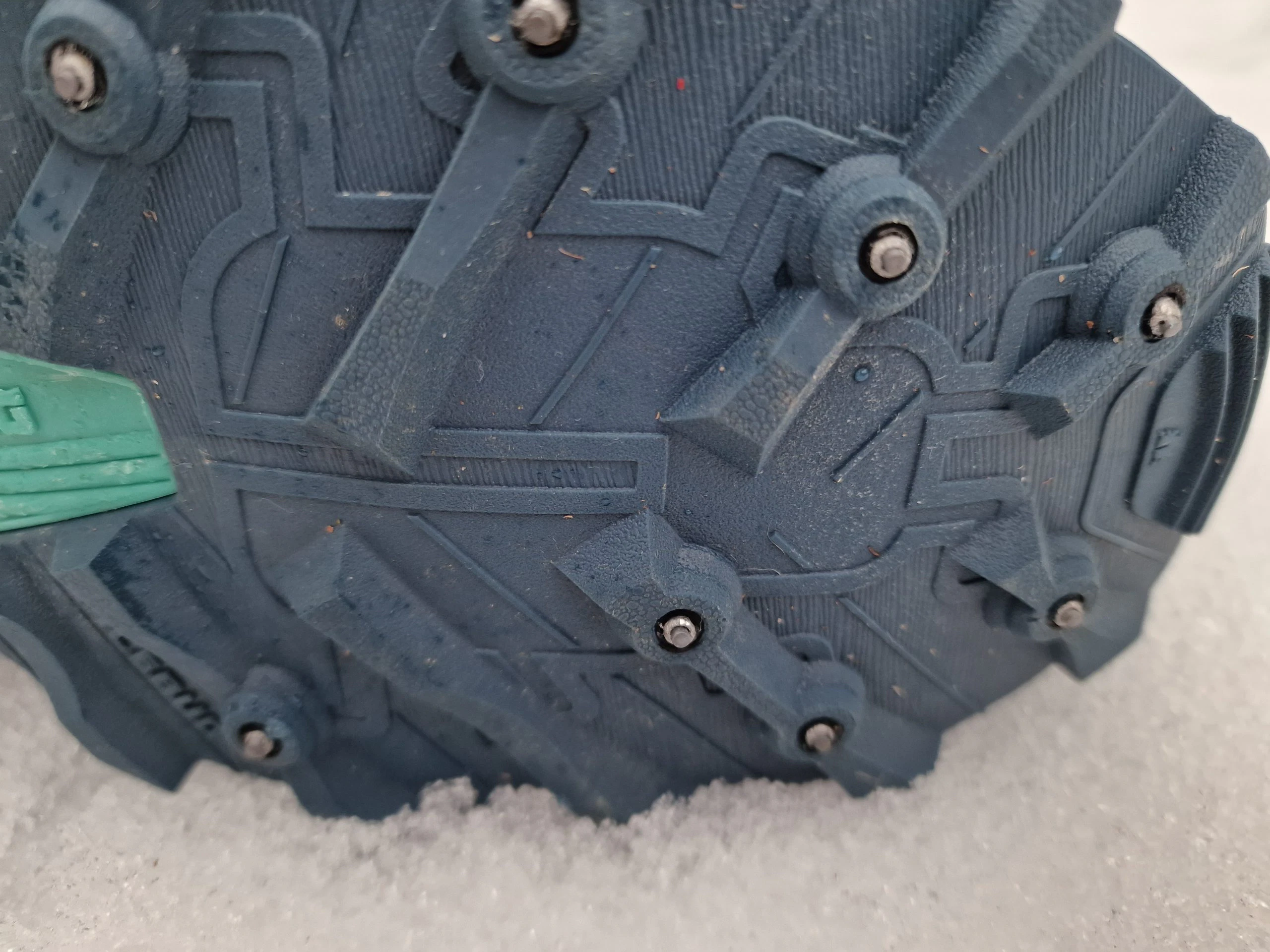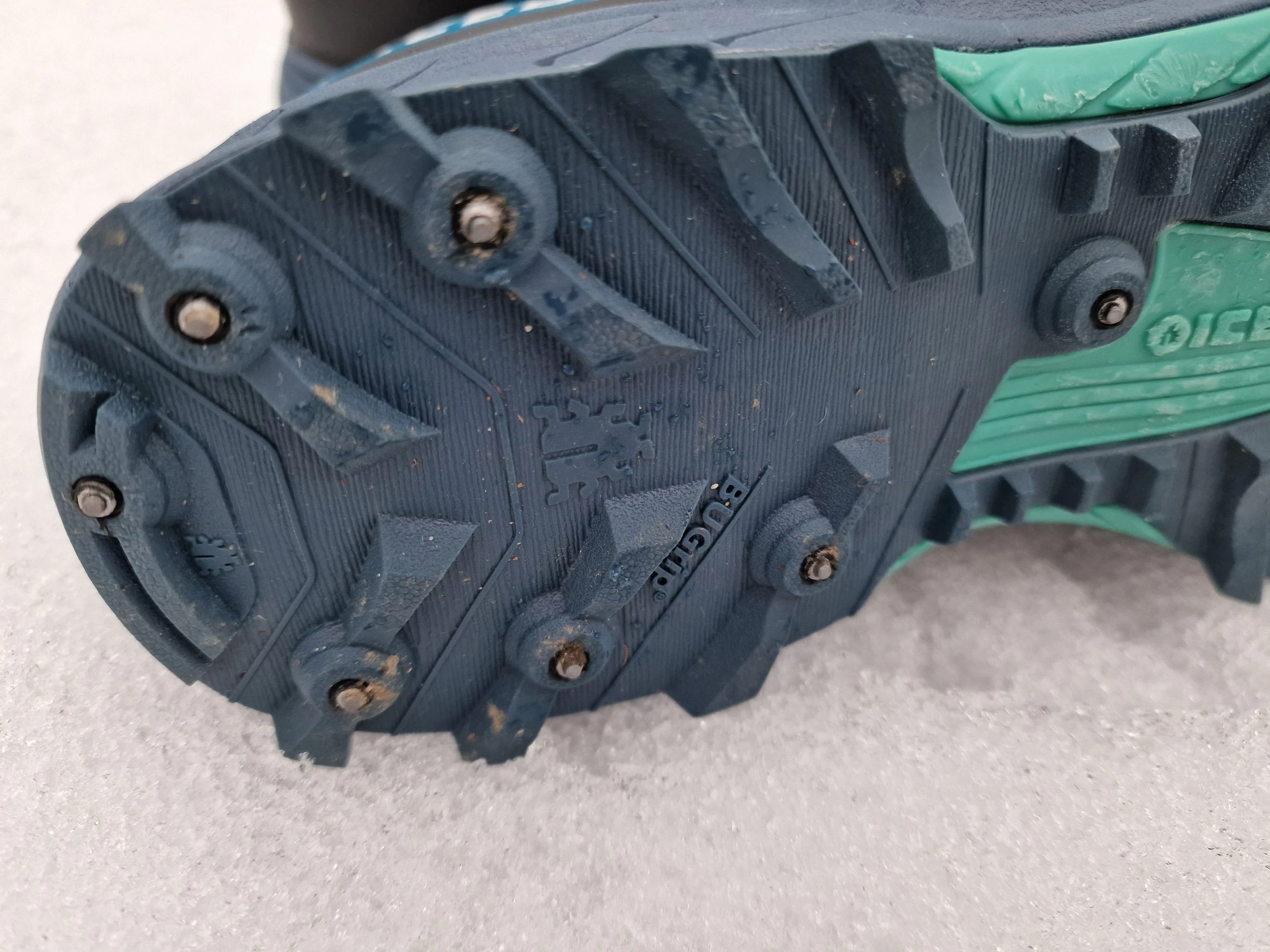Wenn man sich die Sohle des Pytho6 Men’s BUGrip ansieht, wird jedem sofort klar, dass dieser Schuh über ein Maximum an Grip verfügt. Die Querstollen der aus Rubber 9 Extreme gefertigten Sohle würden ohne Spikes schon genug Grip bieten. Mit den Spikes holt man noch das Maximum an Grip aus dem Schuh heraus. Diese packen besonders auf Eis richtig zu, unterstützen aber auch auf nassem Holz oder wenn es schlammig wird. Mit seinen 9 mm Sprengung steht man zwar recht hoch im Schuh, dennoch fand Björn, dass der Schuh ihm die nötige Stabilität gab.