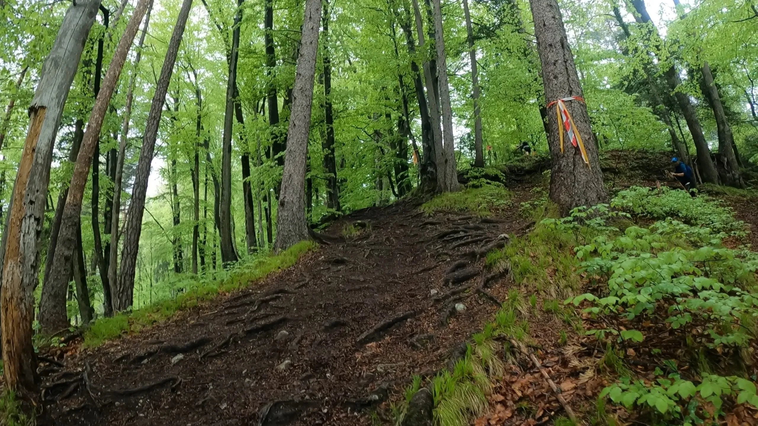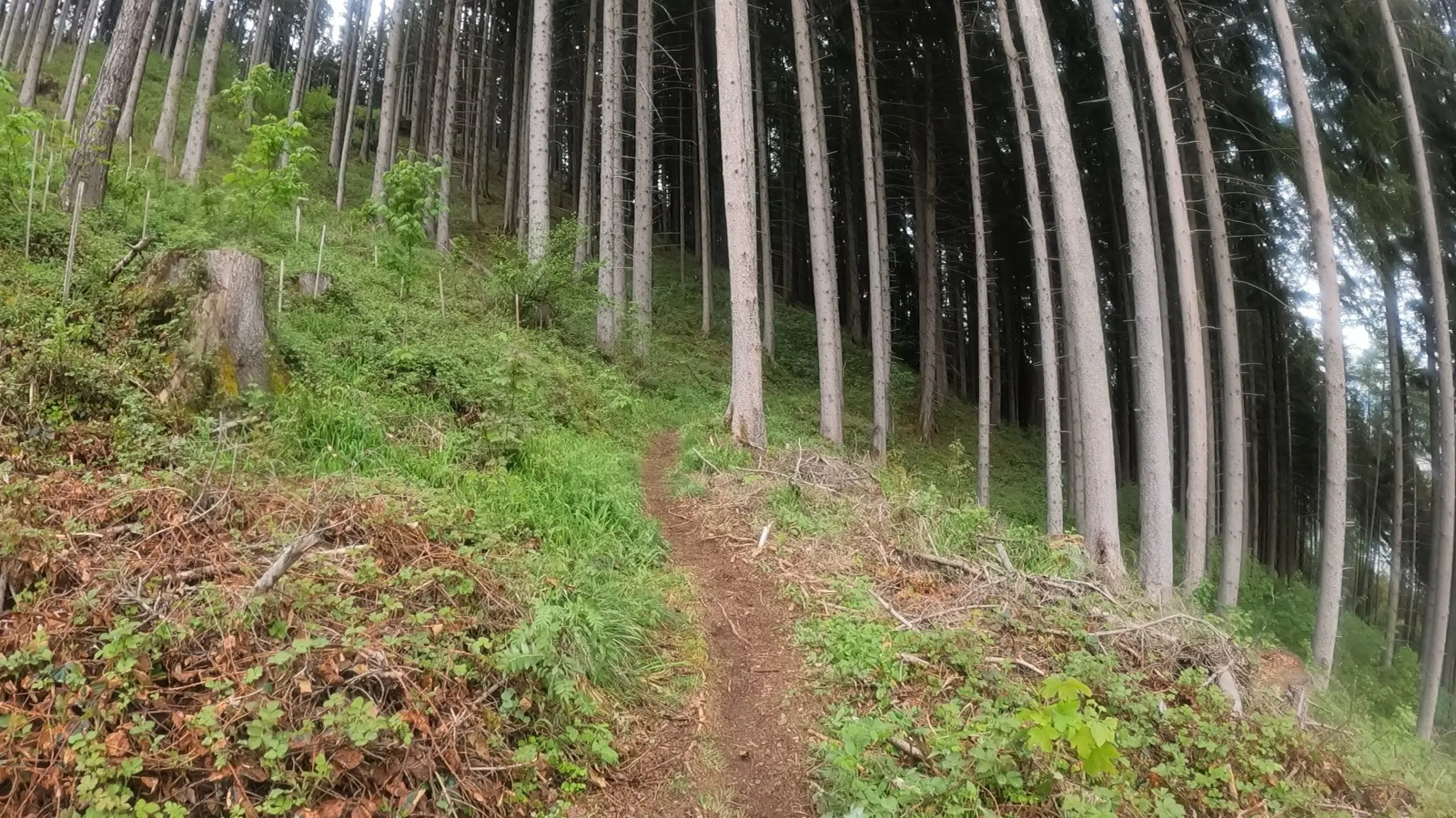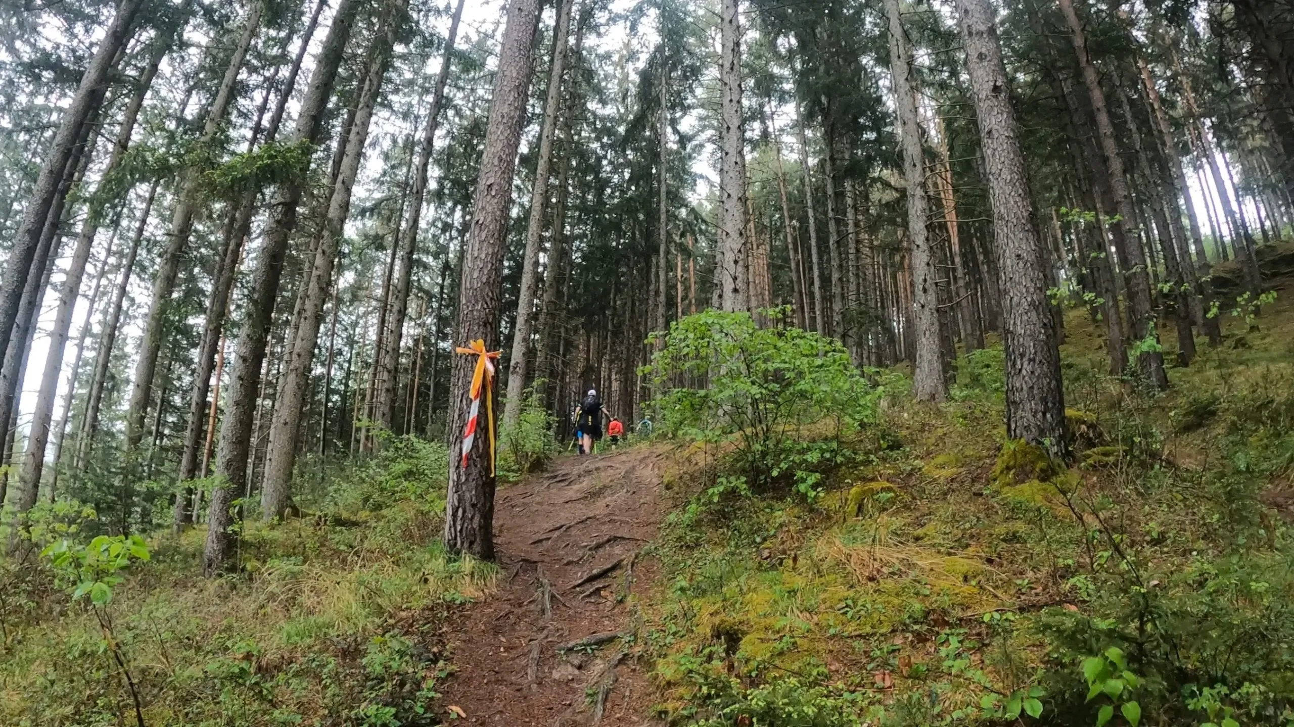Die Beine waren schon schwer. Aber der Wille ist größer. Also kämpfte ich mich den letzten Anstieg hoch. Ich war froh, dass ich meine Stöcke dabeihatte. Die haben nämlich noch einiges an Vorschub berghoch rausgeholt. Gefühlt zog sich aber dieser Anstieg ewig. Es war echt zäh. Die Wege waren aber ziemlich schön. Es ging über den Kienbergsteig. Auf diesem Weg hatte man immer wieder mal einen schönen Ausblick auf das Tal. Im Wechsel war dieser Abschnitt ein ständiges „run and hike“. Naja mehr „hike“ als „run“. Aber das war voll in Ordnung. Nachdem ich laut Höhenprofil oben angekommen war, konnte ich es bis zur letzten VP auf der Strecke rollen lassen. VP6 war ca. bei km 56 am Herzsee. Bis dahin war es ein ständiger Wechsel zwischen breiten Waldwegen, schmalen Pfaden und asphaltierten Wegen.