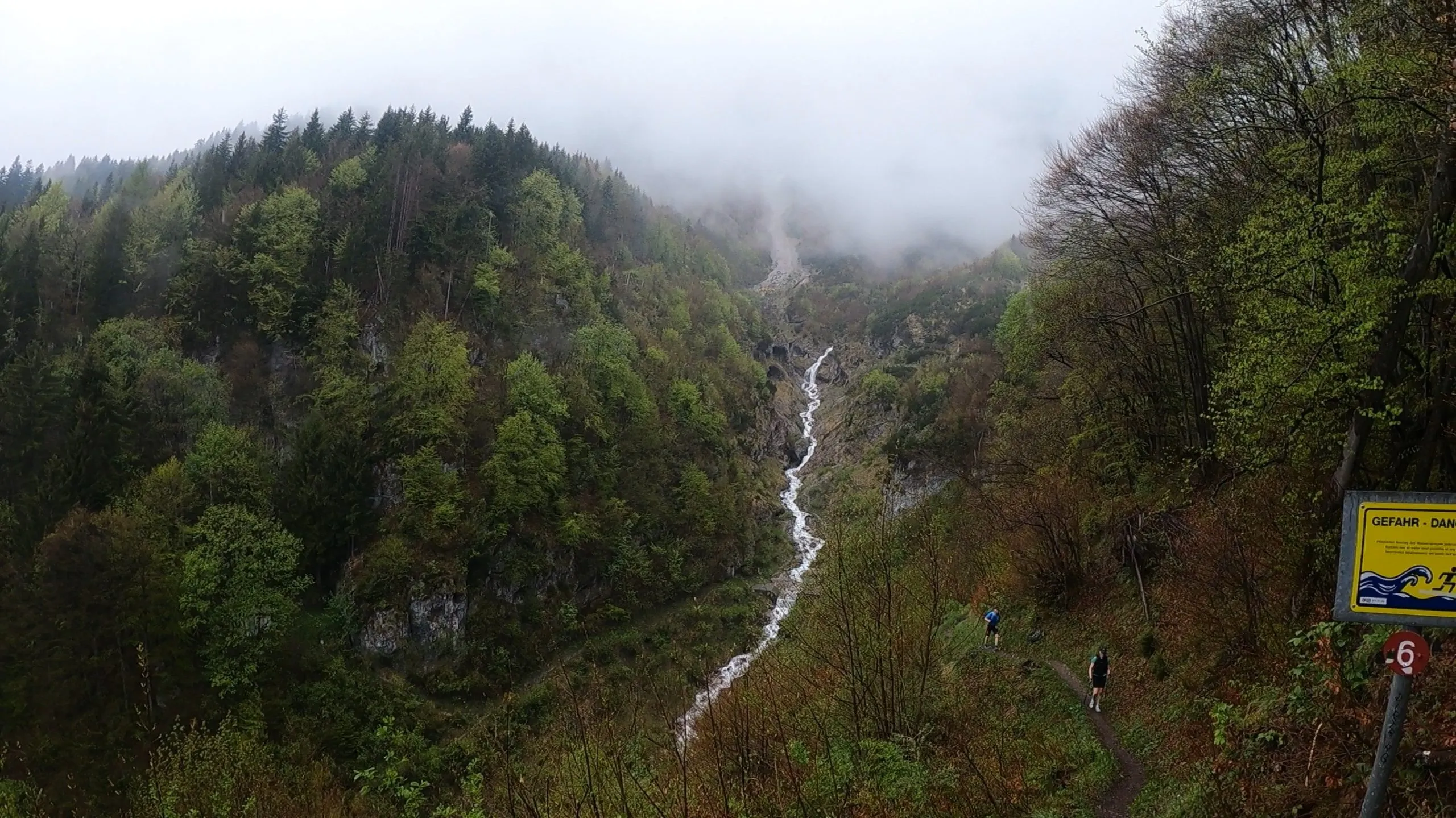 Das nächste Ziel war VP4 bei km 42 bei Romediwirt. Ich lief an der Arzler Alm vorbei und war so richtig im Flow, trotz der Strapazen. Ich probierte nochmal einen halben Riegel zu essen. Aber das fühlte sich leider nicht gut an. Ich blieb bei meiner Strategie nur noch Wasser zu trinken und an den Verpflegungen Brot und Gurken zu essen. Es blieb mir nichts Anderes übrig. Ein wirkliches Highlight war auch die Mühlauer Klamm. Ein kleiner Wasserfall, der oben vom Berg entspringt. Man musste das Wasser unten durchqueren und ich lief dann wieder den Berg hoch. Im Rücken war dann der Wasserfall. Ich drehte mich oben nochmal um und schaute auf den Verlauf des Wassers. Dieser Moment war einfach beeindruckend. Wie dieses Wasser aus dem Berg entspringt und sich seinen Weg runter sucht. Dabei noch die Mystische Stimmung mit Nebel/Wolken. Einfach wunderschön. Genau für solche Momente lohnt es sich auch, mal ganz kurz innezuhalten. Das hat mir sehr viel Energie gegeben.