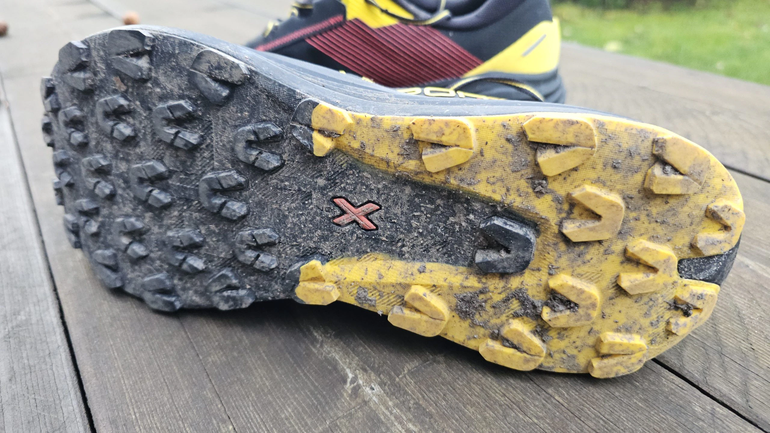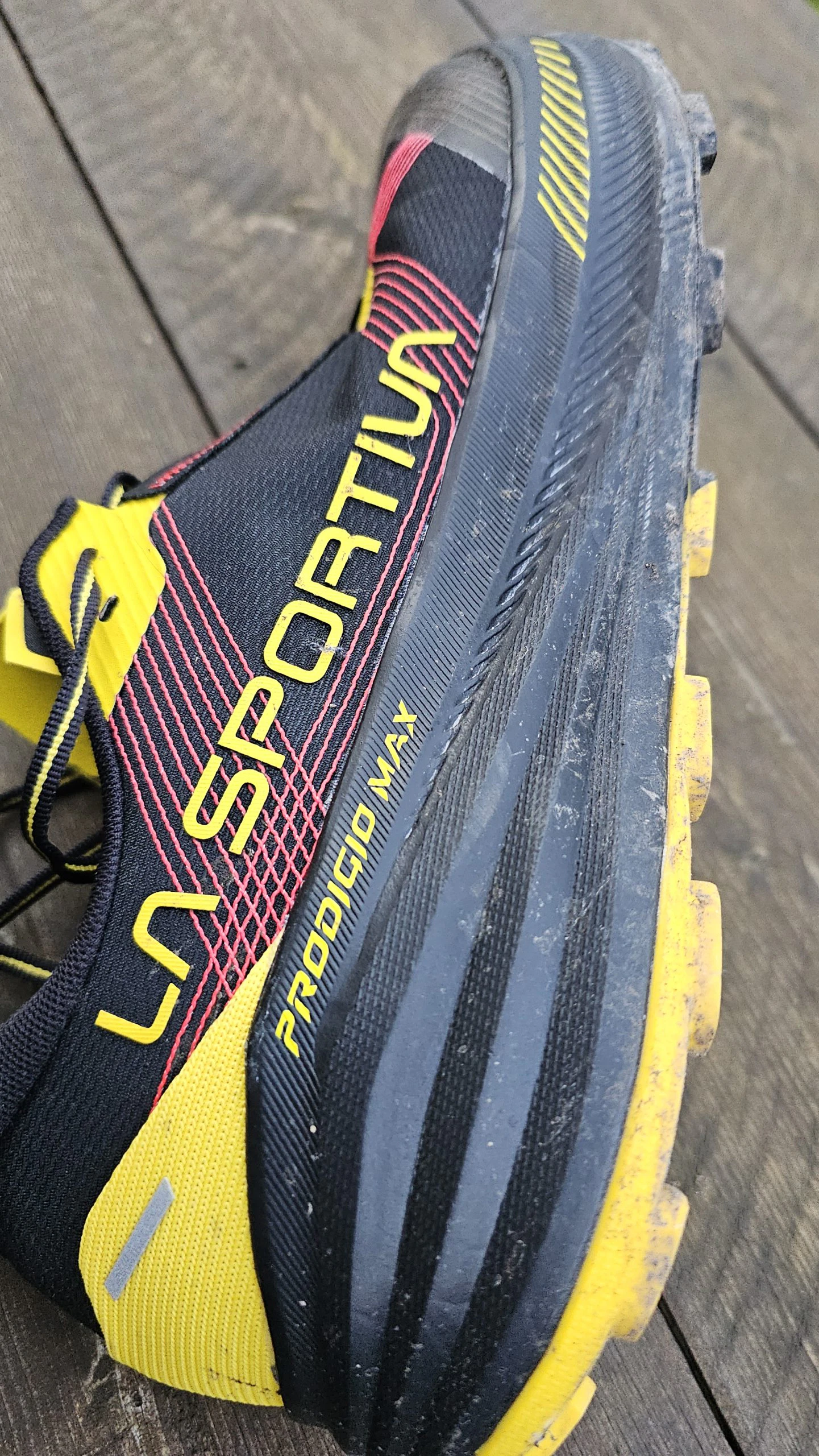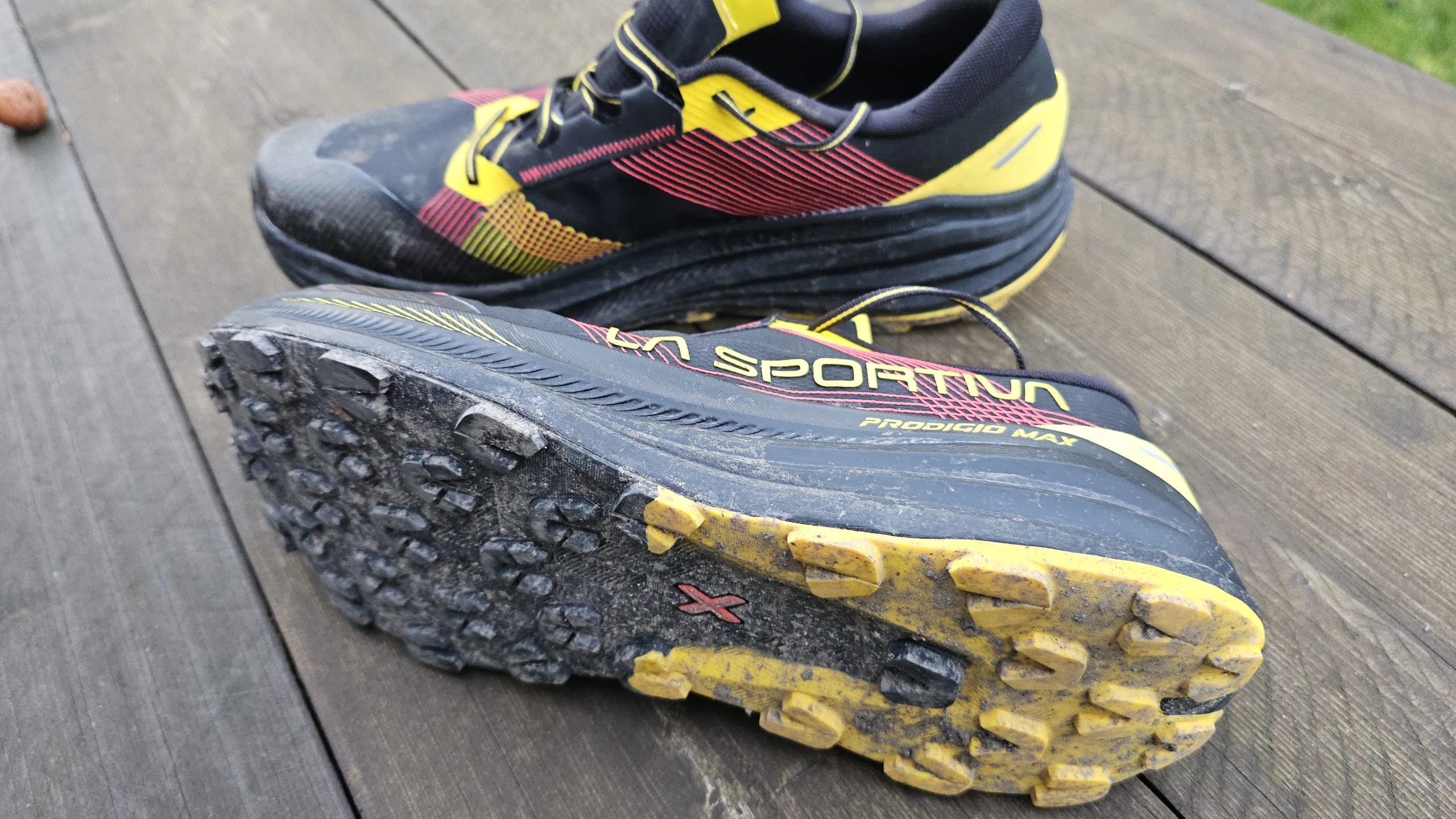 Im Test zeigte der La Sportiva Prodigio Max eine insgesamt solide Performance in puncto Grip und Stabilität. Die FriXion® Red Dual-Density Außensohle bietet eine gute Mischung aus Halt und Langlebigkeit. Besonders auf felsigem, trockenem Untergrund konnte der Schuh überzeugen – hier griff die Gummimischung zuverlässig und vermittelte ein sicheres Laufgefühl. In matschigen Passagen hingegen ließ die Traktion etwas nach, was vor allem an der moderaten Stollenhöhe von 4 mm liegt.