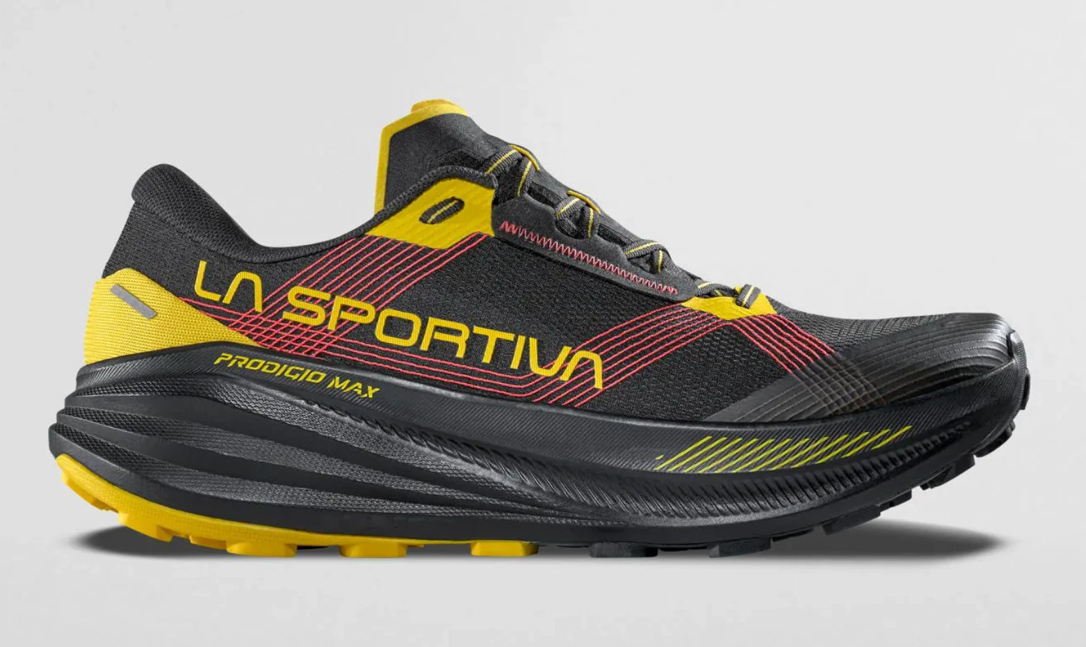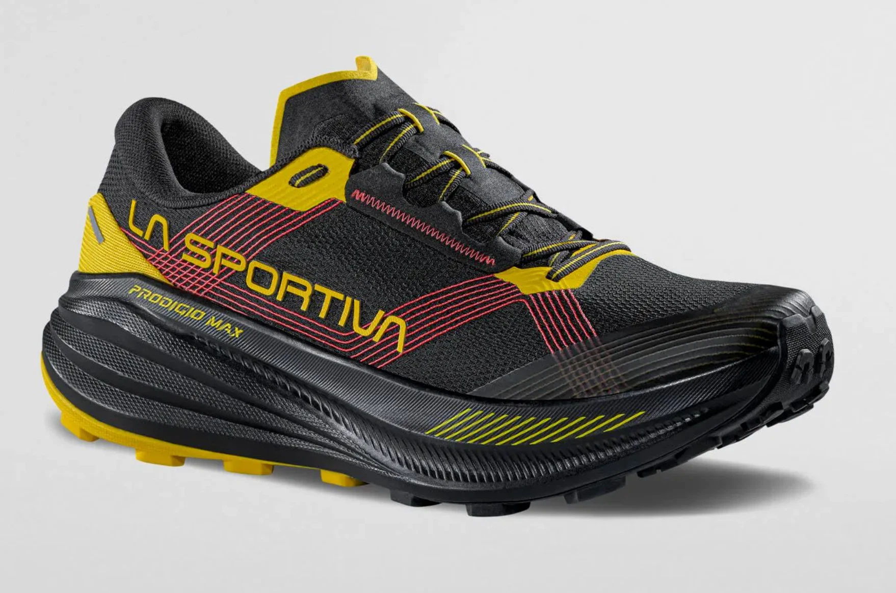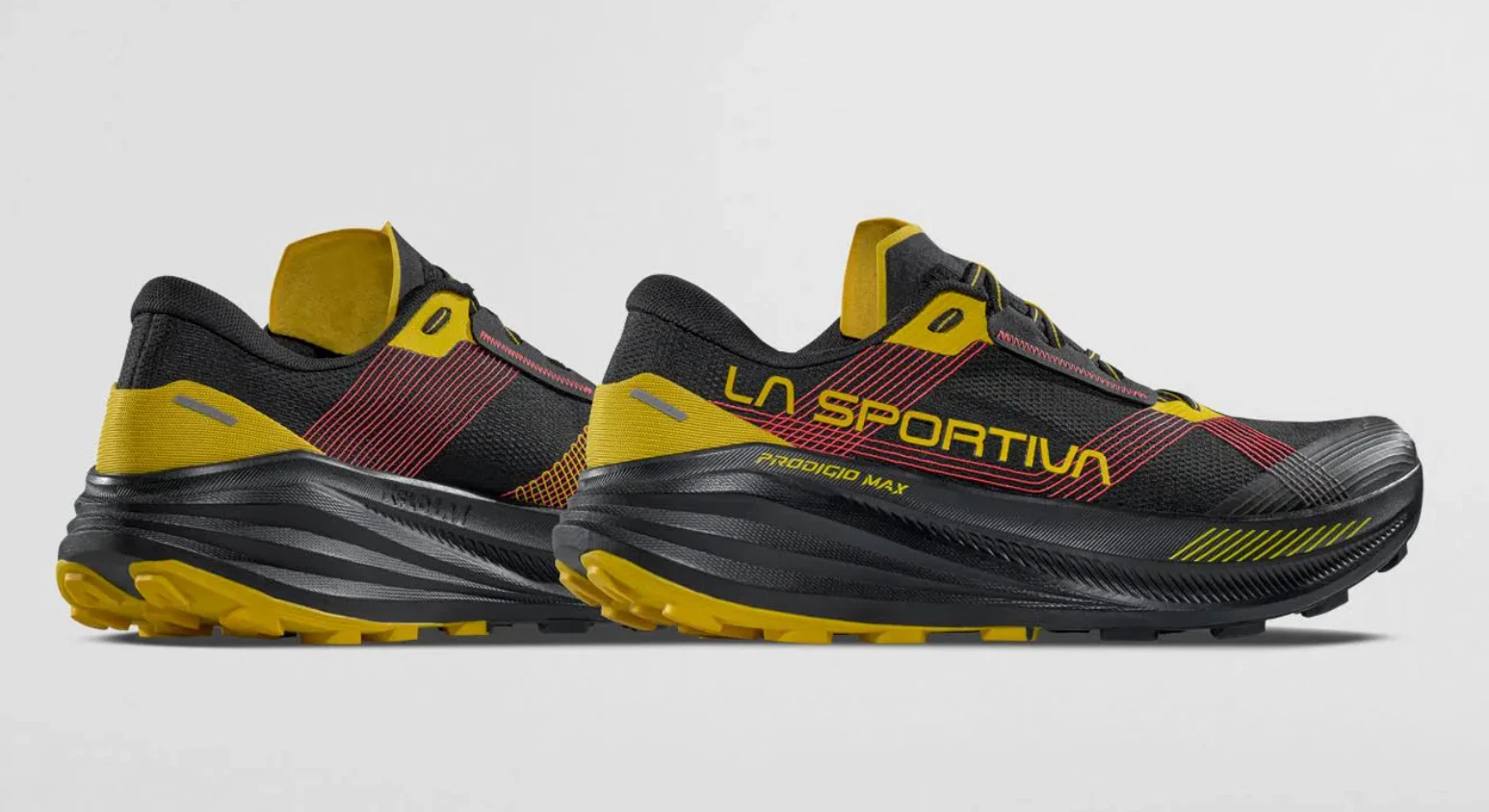Das Obermaterial besteht aus einem robusten Comfort WIRE-Gewebe mit eingearbeiteten TPU-Fäden, die den Fuß stabil umschließen, ohne Druckstellen zu verursachen. Ergänzt wird dies durch das Wrapping-System, das den Mittelfuß sicher fixiert. Mit 6 mm Sprengung und 4 mm Stollenhöhe ist der Prodigio Max auf Komfort, Schutz und Effizienz im technischen Gelände ausgelegt. Laut Hersteller richtet sich der Schuh an Läuferinnen und Läufer, die bei langen Trailläufen oder Ultrawettkämpfen maximale Dämpfung und Stabilität suchen.
