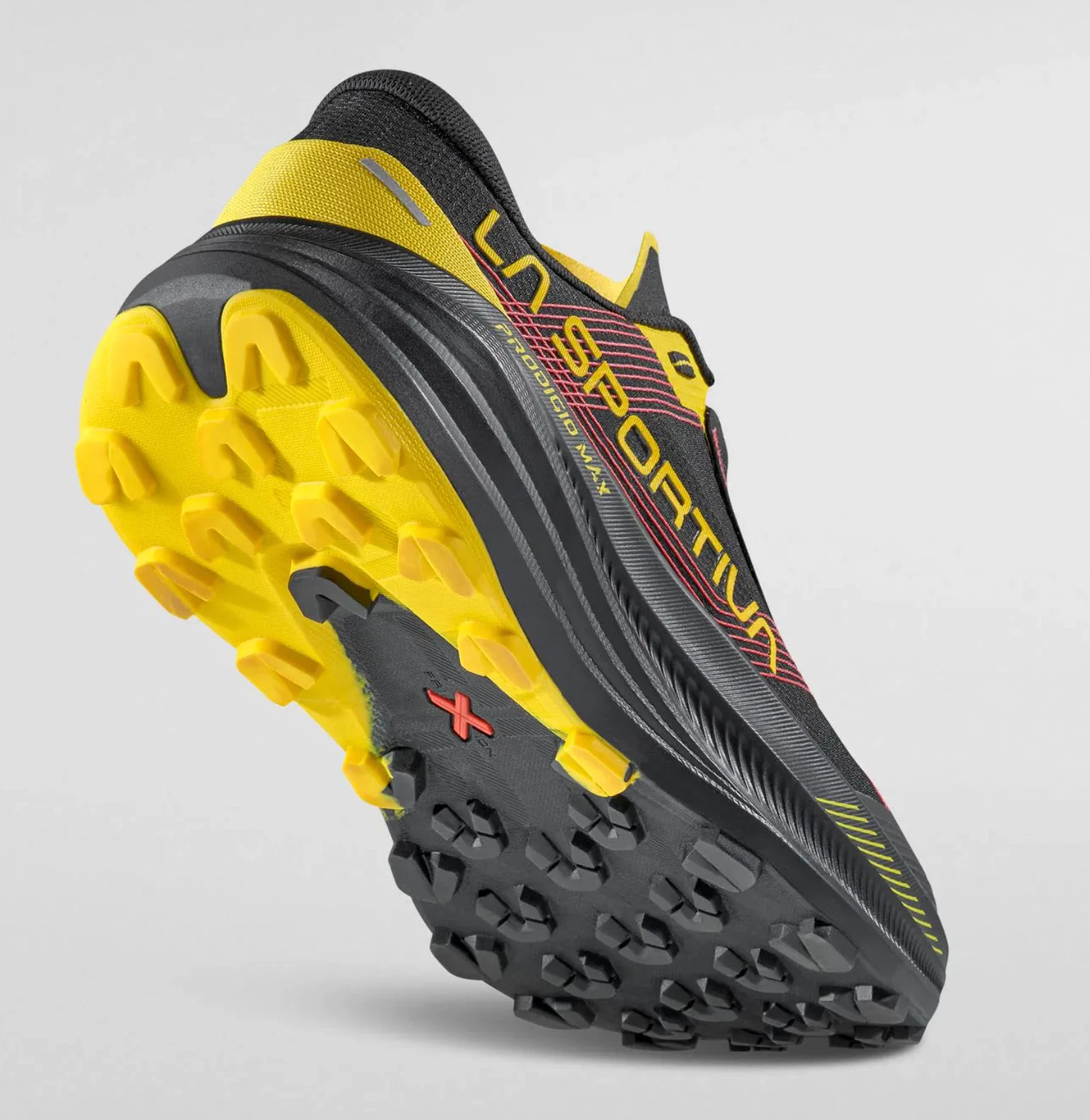 Der La Sportiva Prodigio Max ist ein maximal gedämpfter Trailrunningschuh, der speziell für lange Distanzen und Ultratrails entwickelt wurde. Sein Herzstück bildet die XFlow ENDURANCE™ Zwischensohle, die durch ihre superkritische Schaumtechnologie für außergewöhnliche Dämpfung, Energierückgabe und Langlebigkeit sorgt. Das bi-komponentige FriXion® Red-Außensohlen-Konzept kombiniert zwei Gummimischungen, um eine optimale Balance aus Grip und Abriebfestigkeit zu erreichen.