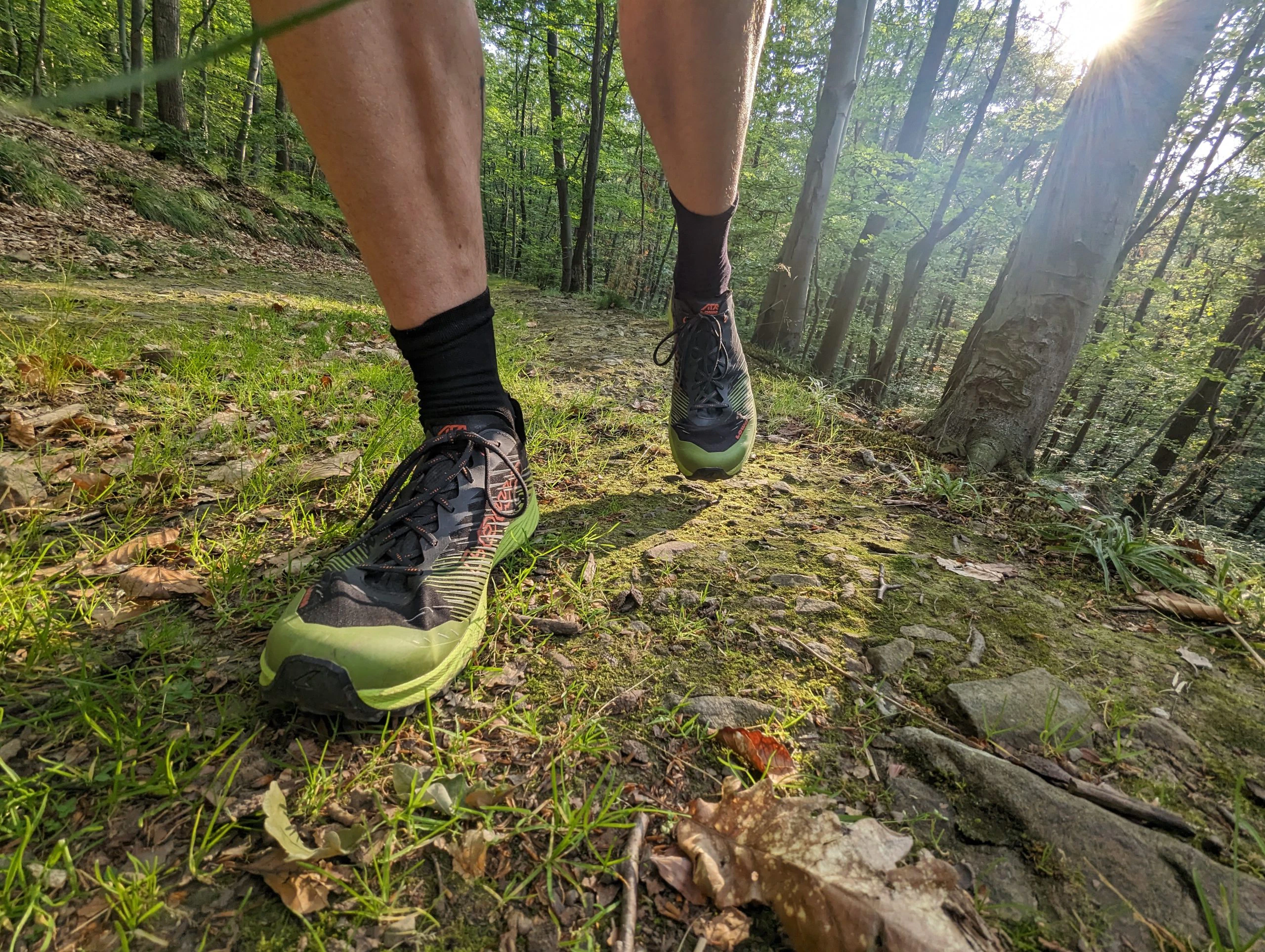 Der Sohlenaufbau ist gering gehalten und bietet ein gutes Feedback vom Untergrund. Dementsprechend ist die Dämpfung ebenfalls recht gering. Der Schutz von Steinen durch die Sohle ist sehr gut. Ansonsten ist der Schutz minimal gehalten. Die Zehen haben nur eine leichte Verstärkung eingearbeitet. Das Obermaterial ist sehr robust.