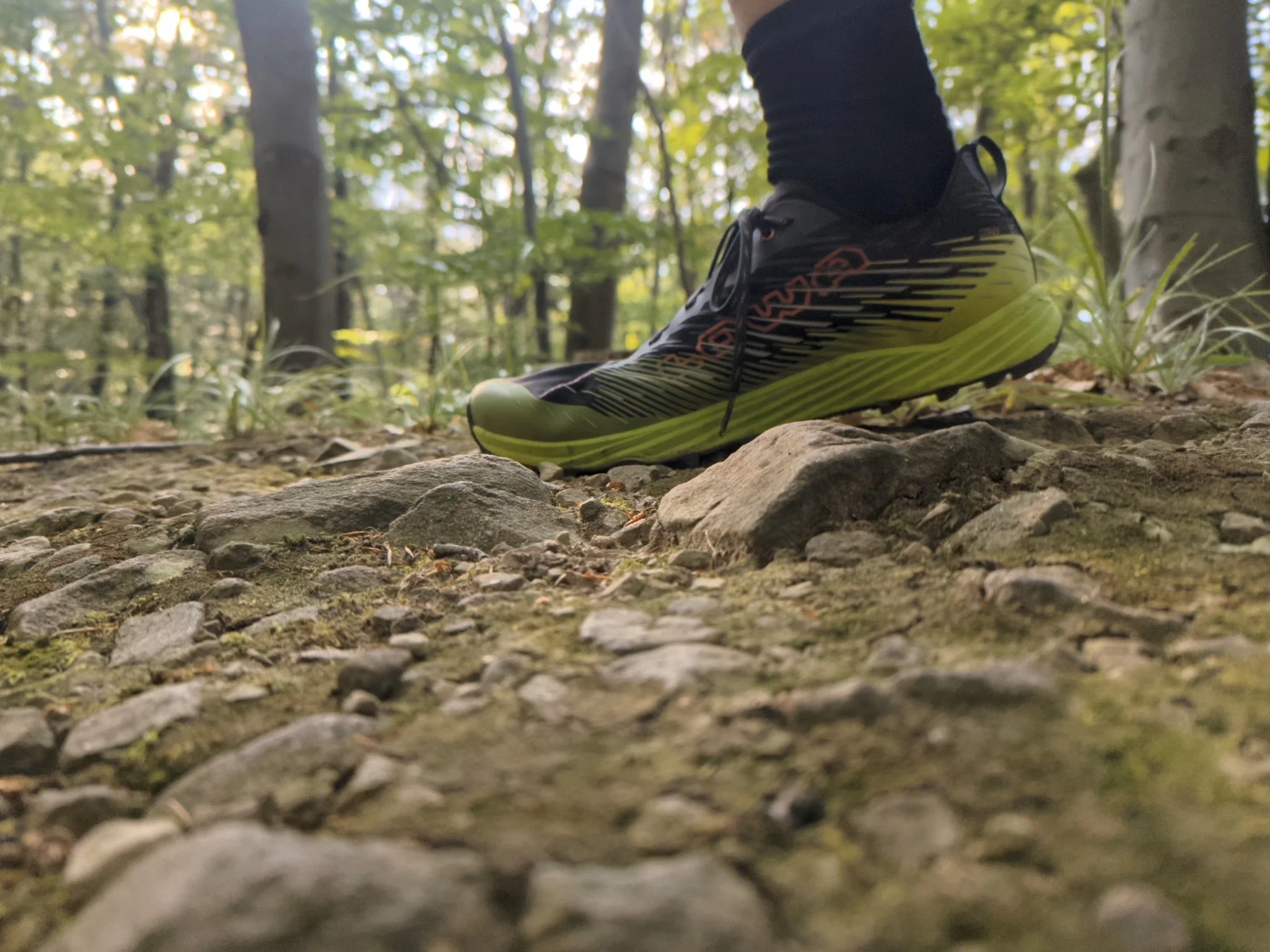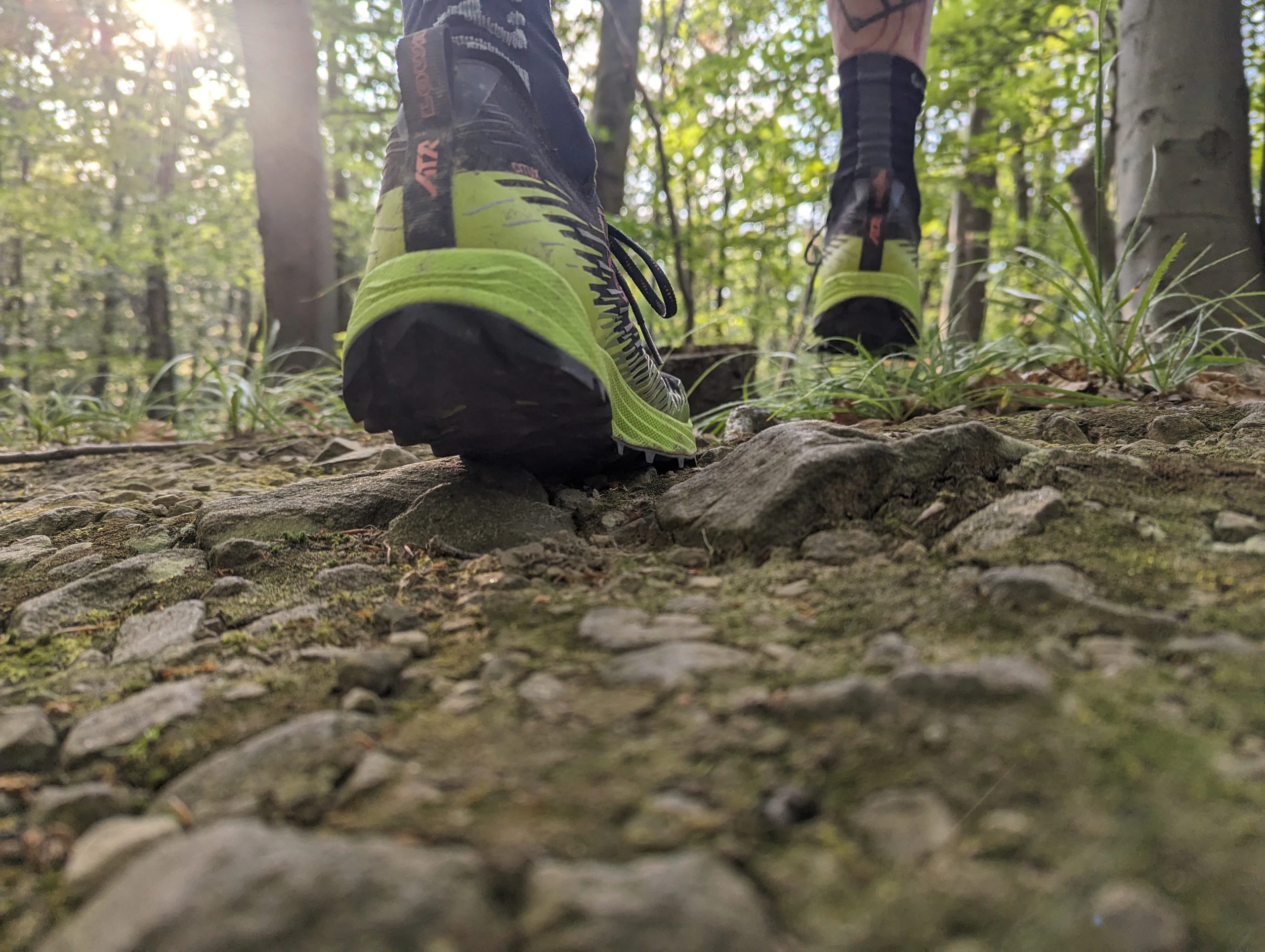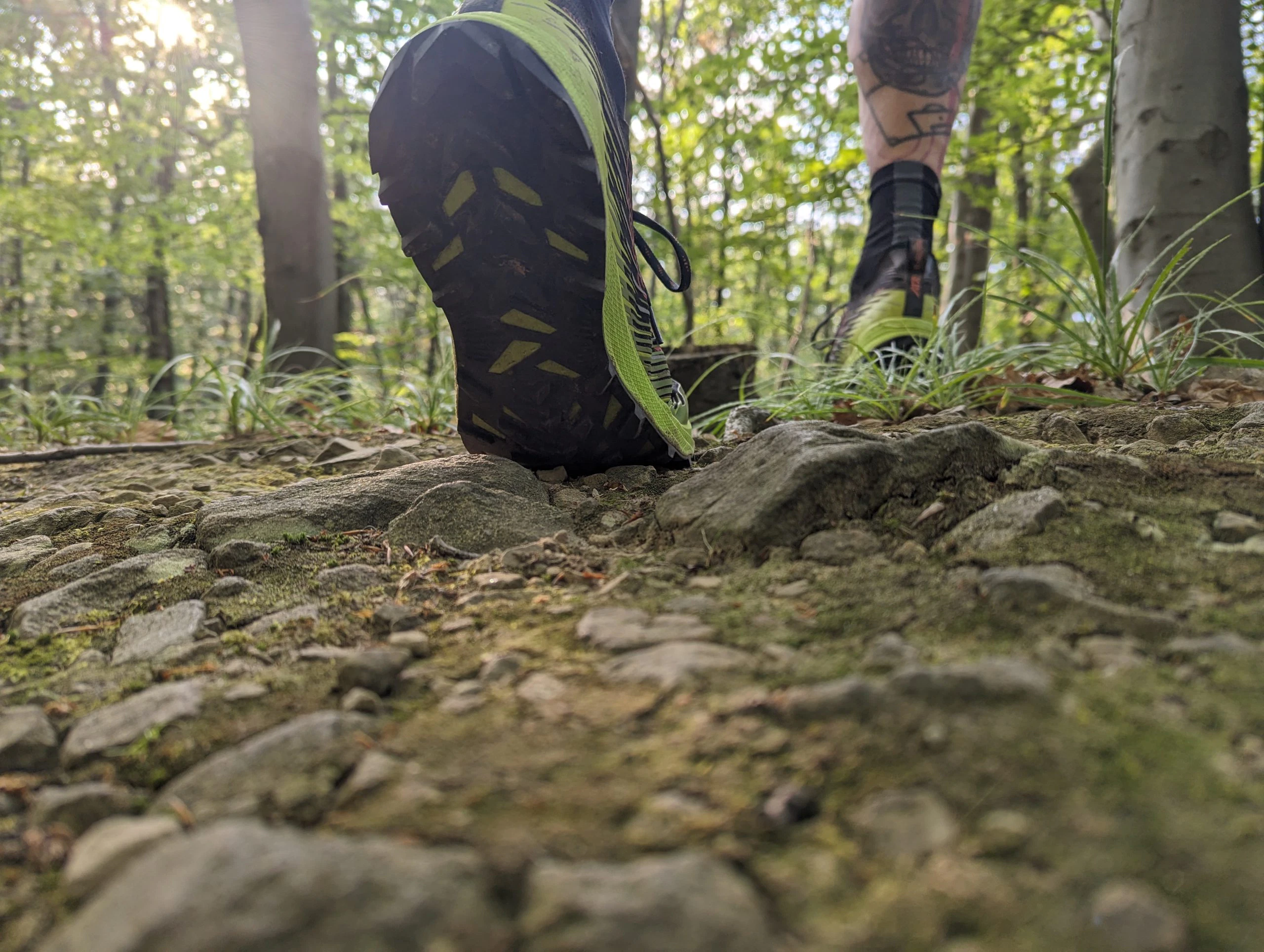 Der flache Sohlenaufbau und der feste Halt bieten dem Fuß in jeder Situation genügend Stabilität. Das Beste an dem Schuh ist der Grip. Die ca. 4 mm Stollen sorgen auf jedem Untergrund für Halt. Gleichzeitig ist aber der Abrieb der Sohle ein großer Nachteil. Nach 135 km fehlt einigen Stollen etwas Material.