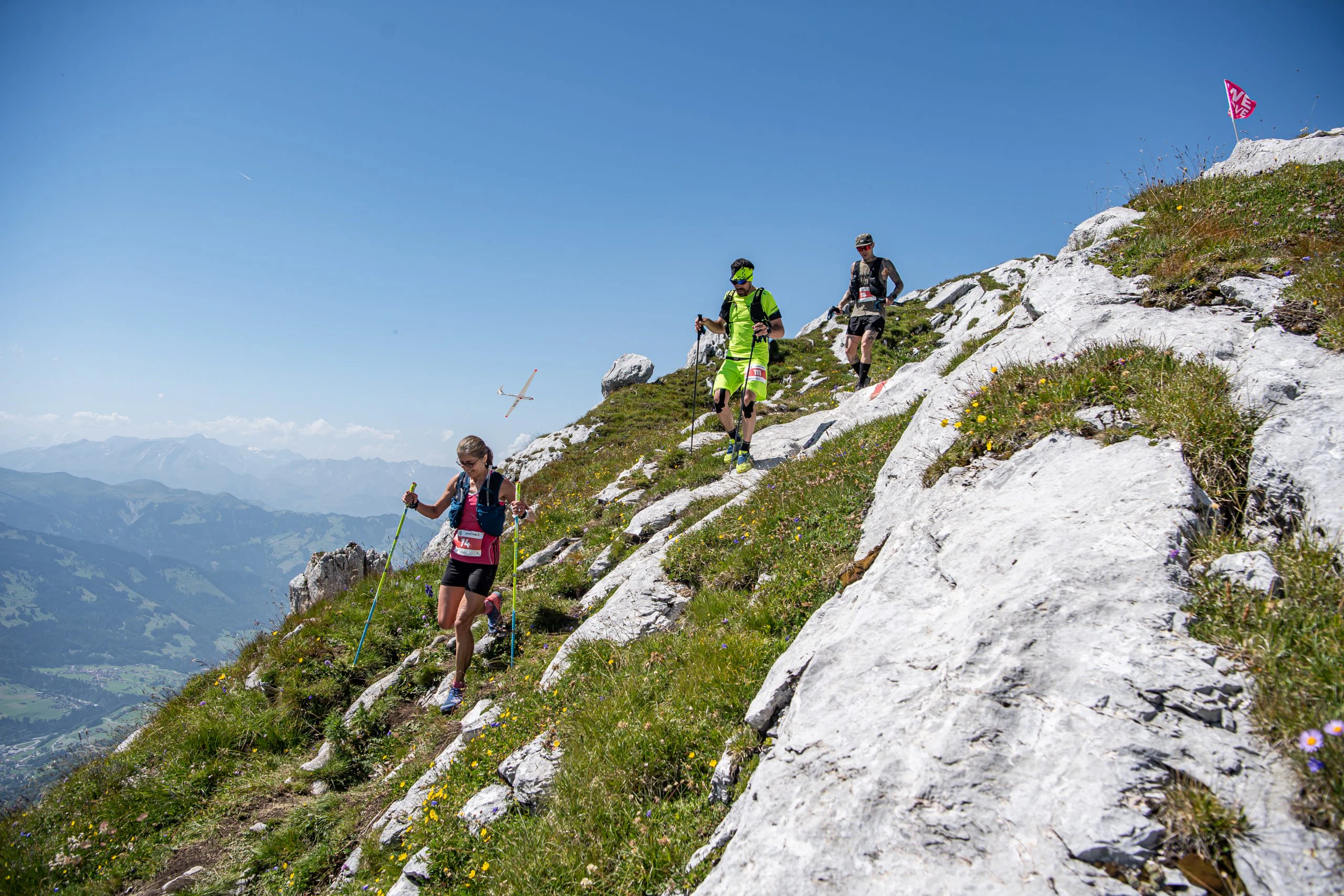 Die Markierung war durchgängig mit pinkfarbenden Band, Sprühmarkierungen und Helfern, welche ebenfalls pinke T-Shirts anhatten, gespickt. Ein Verlaufen war somit auf der kurzen Strecke nicht gegeben. Die drei Verpflegungspunkte auf der T24 sowie die seches Verpflegungsstationen beim T54 bieten isotonische Getränke, Wasser und Cola. Als Essen wurden Bananen, Orangenschnitze, Energieriegel, Gels, Salzstangen, Nusstörtli und Biberli angeboten. Bei den heißen Temperaturen wäre aber Melone oder Gurke mit Salz eine weitere tolle Alternativ zu den vielen süßen Lebensmitteln gewesen. Sowohl beim T24 als auch beim T54 gab es auch unterwegs ausreichend Möglichkeiten, Wasser aufzufüllen oder sich kurz zu erfrischen. Alle Helfer auf der Strecke waren super gut gelaunt, feuerten alle Läufer fleißig an und unterstützen einem beim Wasser auffüllen. Sogar auf dem Weg zum höchsten Punkt des T54 stand auf den Gafier Platten zusätzlich noch eine Helferin und reichte einem vor dem letzten Anstieg nochmals Wasser oder Traubenzucker.