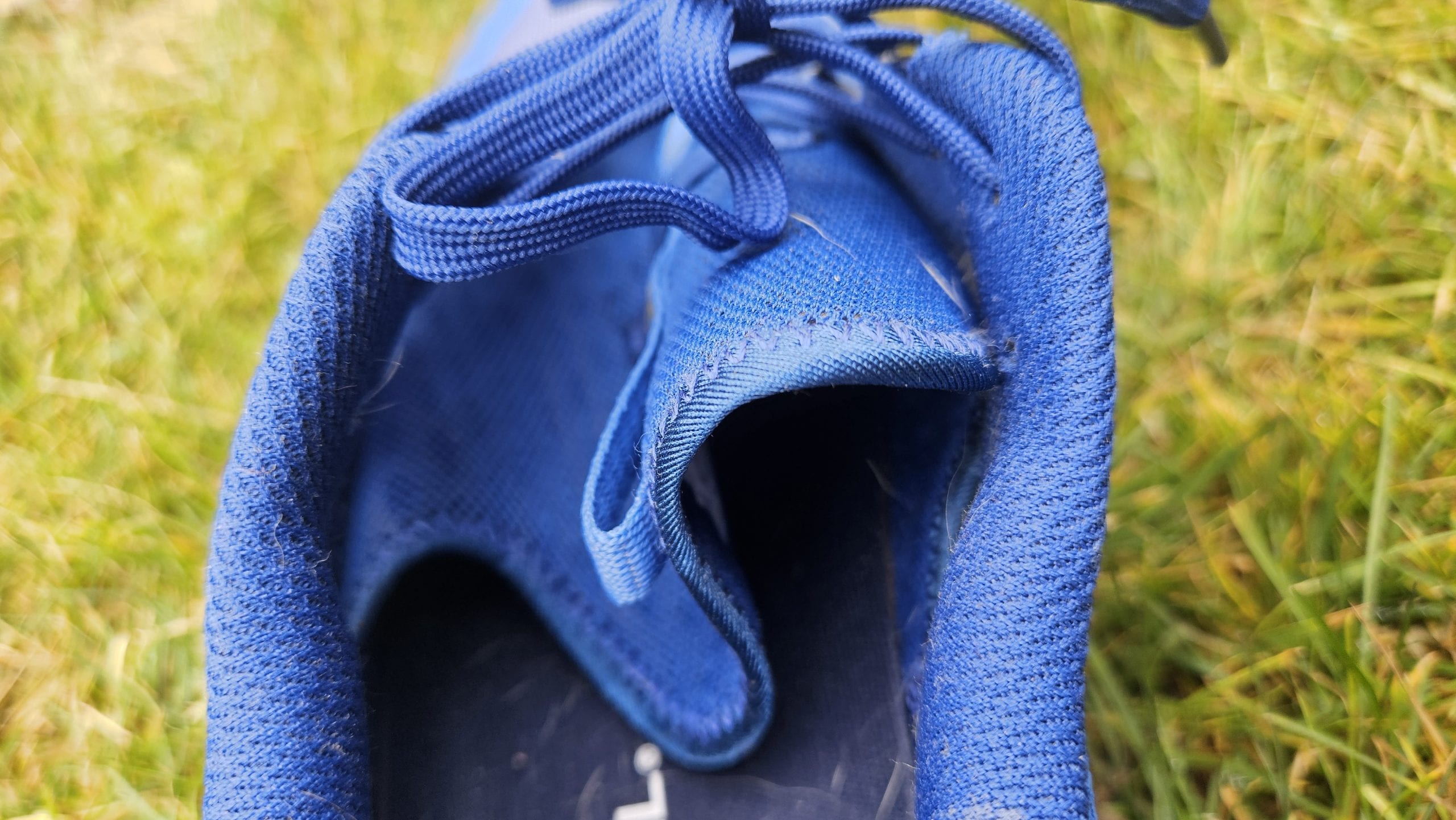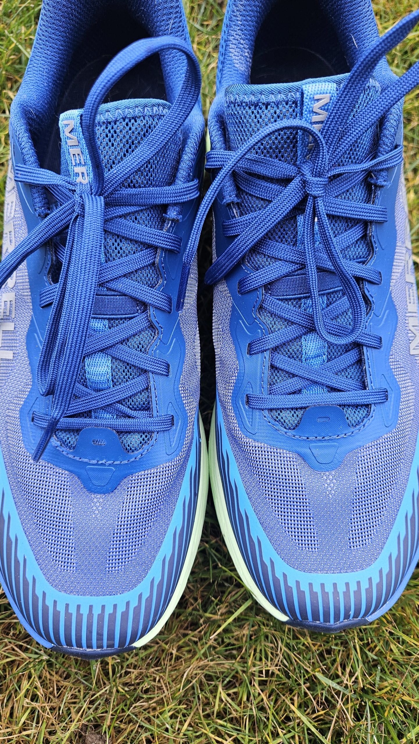 Holger testete den Merrell Agility Peak 6 in seiner normalen Größe EU43,5. Die Passform empfanden wir als angenehm. Der Fuß wird gut gehalten, ohne dass es eng wird, gleichzeitig bleibt im Vorfuß genügend Platz. Gerade auf langen Einheiten ist das Gold wert. Die klassische Schnürung funktioniert zuverlässig und lässt sich gut anpassen. Praktisch ist die Gummiöse auf der Zunge, in der wir die Schnürsenkel verstauen konnten. So bleibt alles sauber fixiert, auch wenn es ruppig wird.