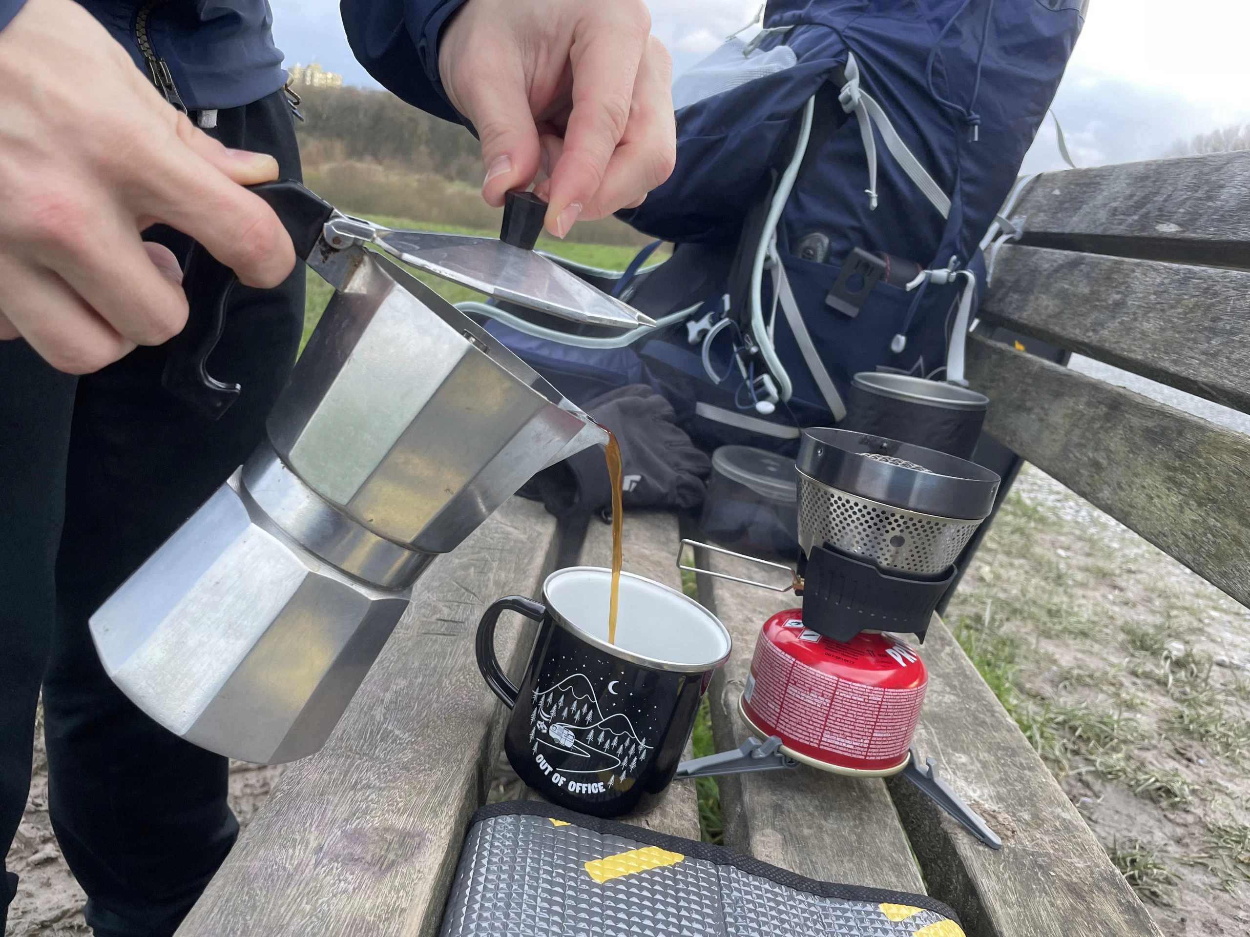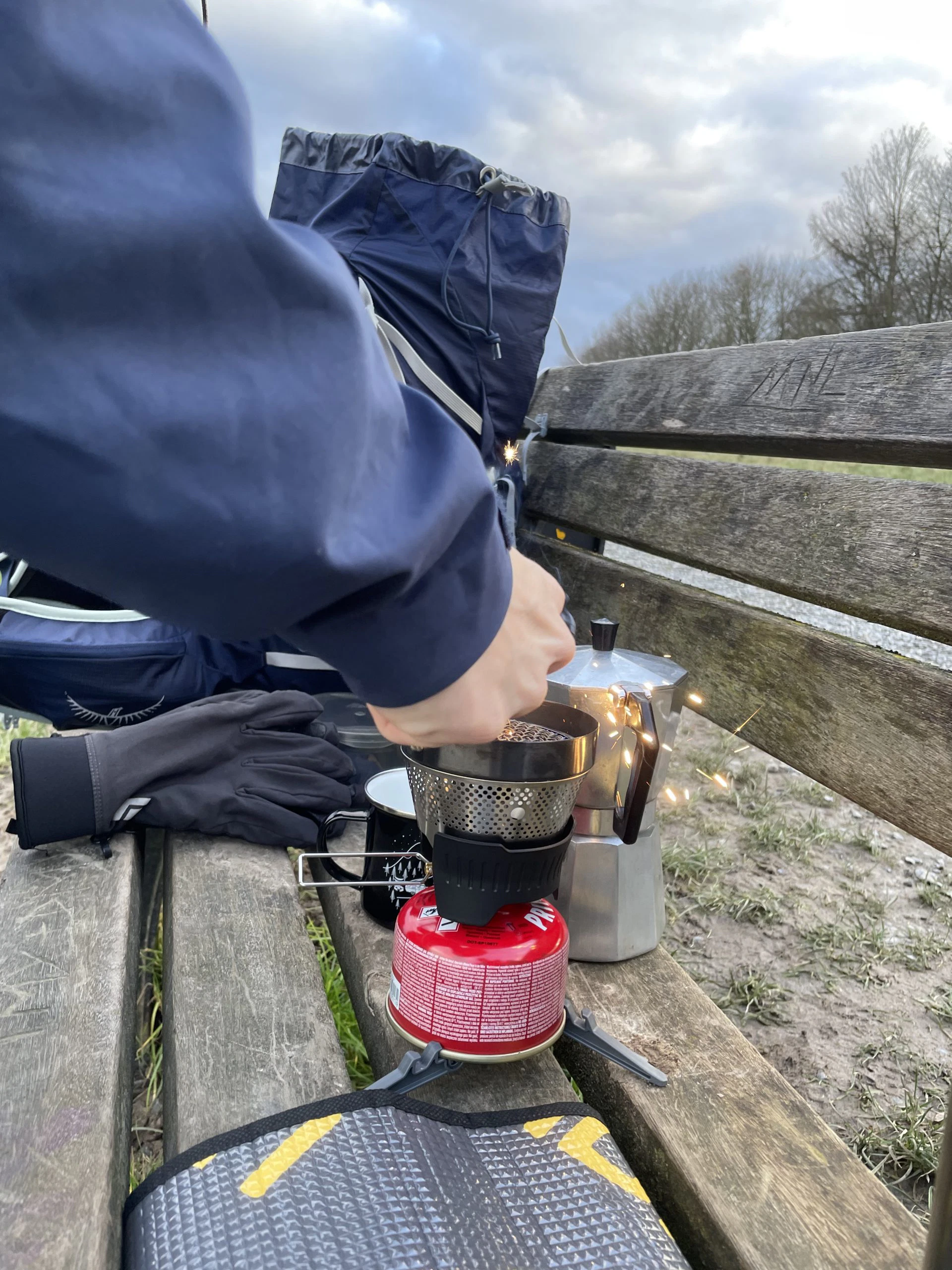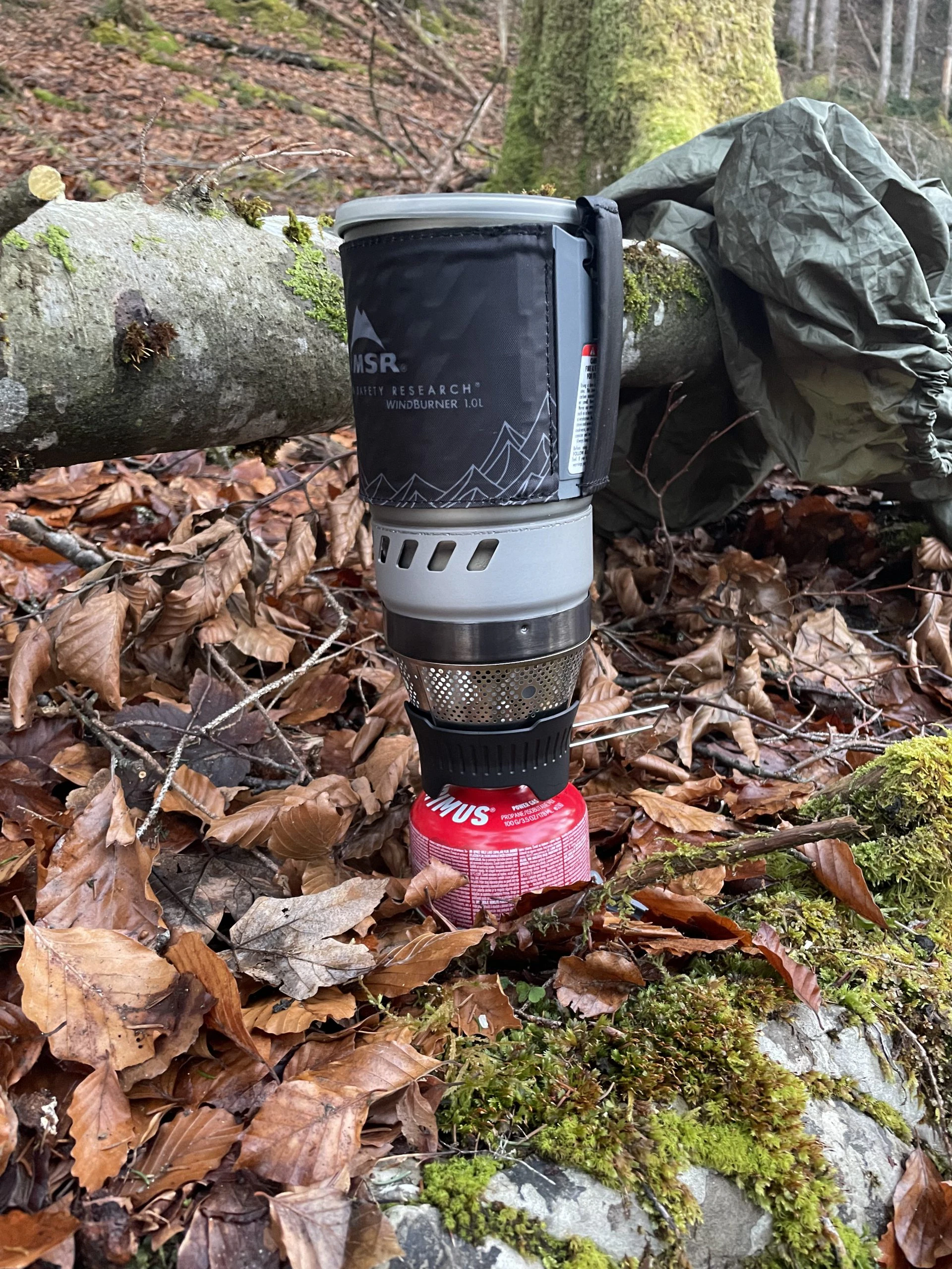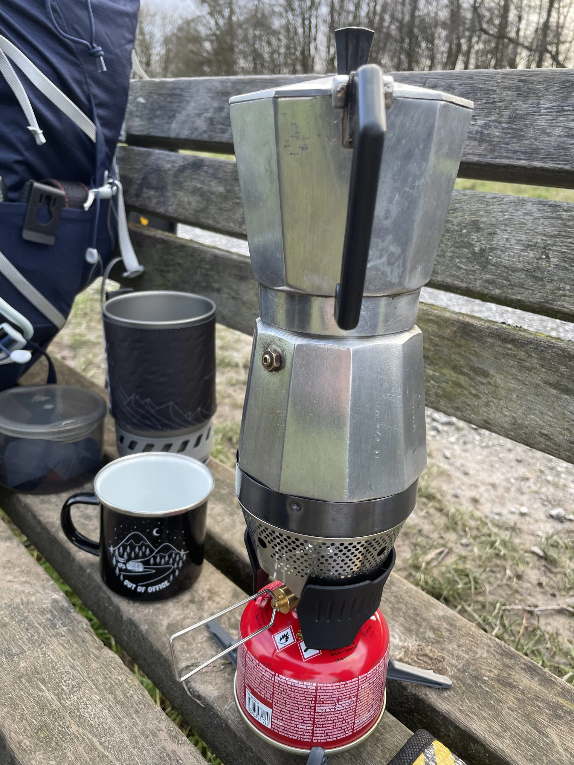 Da Christian leider nicht den Kaffeefilter vom MSR dabei hatte, jedoch auf seinen Kaffee nicht verzichten wollte, hat er erfolgreich einen 6-eckigen Bialetti-Espressokocher (nicht von MSR) zusammen mit dem Windburner Personal Stove System verwendet. Dies hat aber nur geklappt, weil gerade so ausreichend Sauerstoff die Flamme erreicht hat – bei größeren Töpfen oder Bechern wird ein zusätzliches Modul benötigt, um die Sauerstoffzufuhr zu gewährleisten.