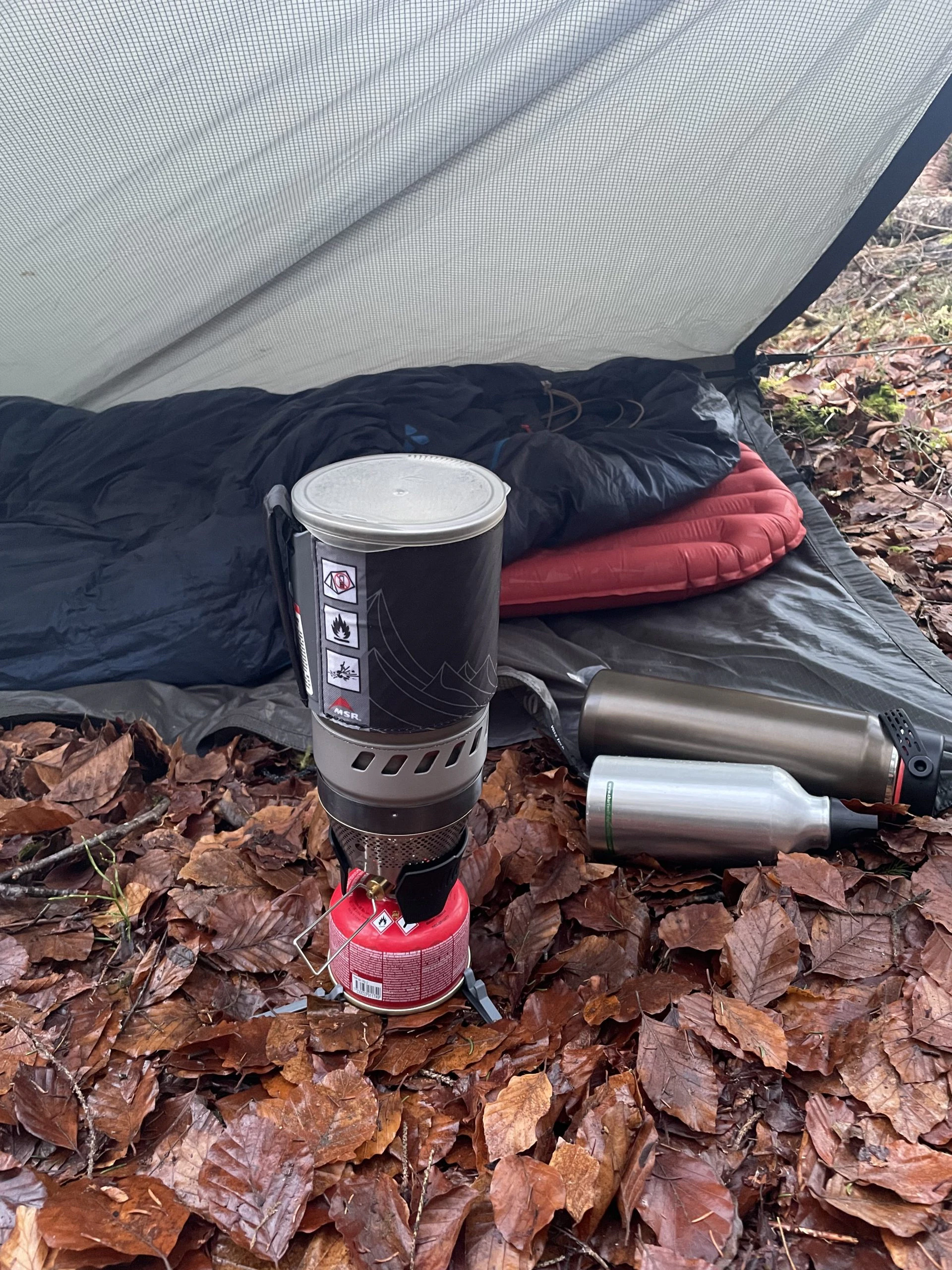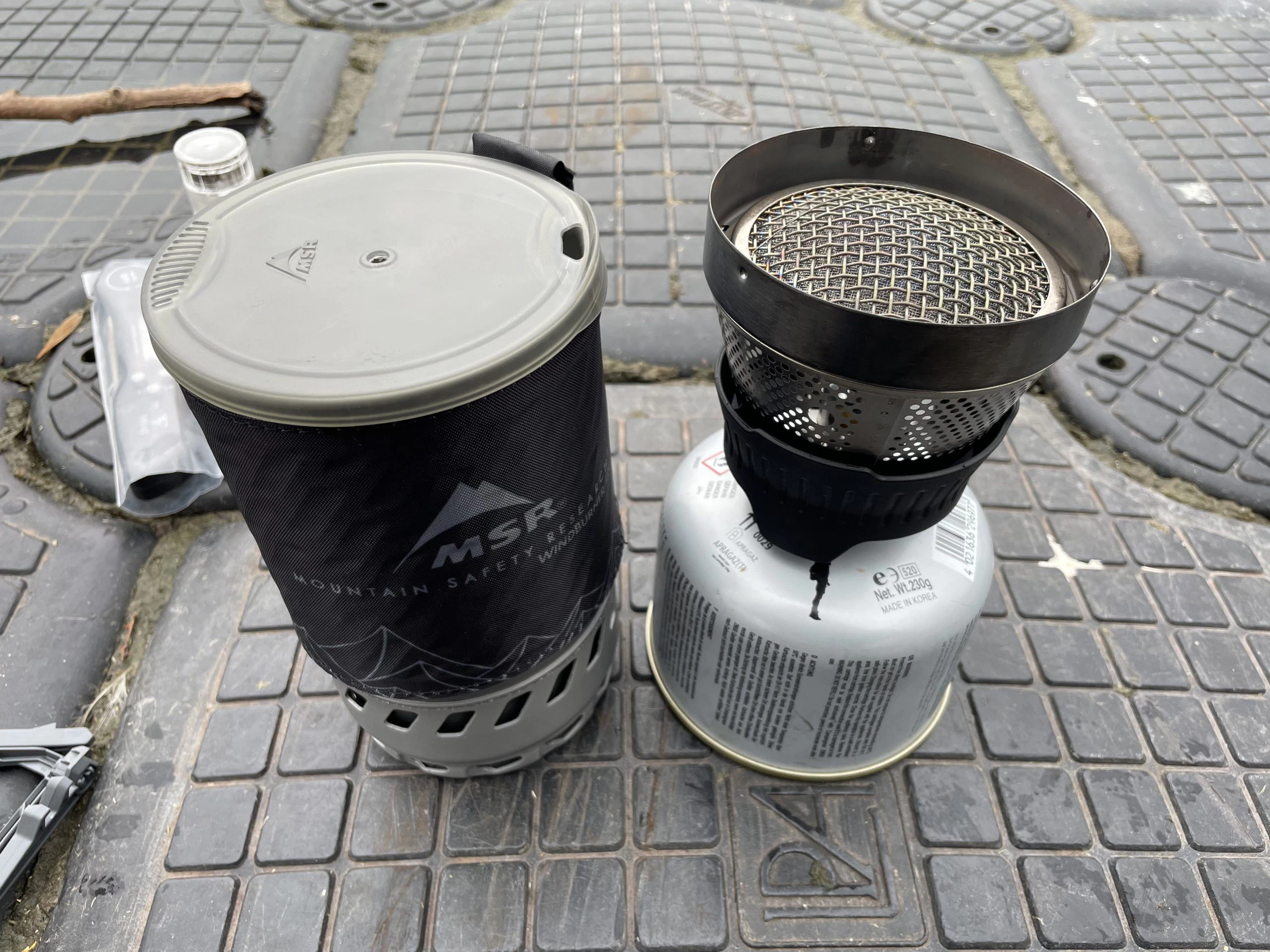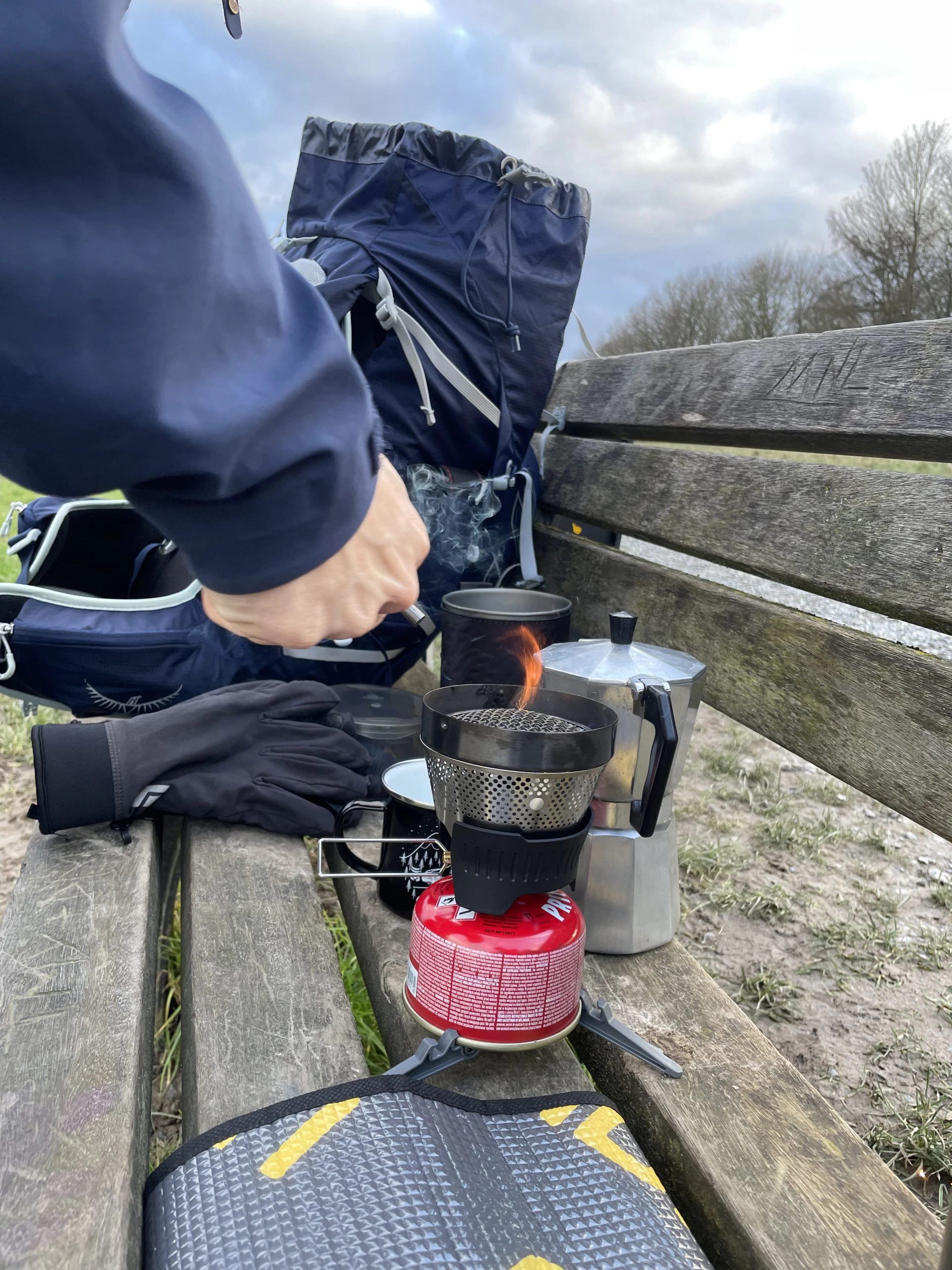 Da Christian leider nicht den Kaffeefilter vom MSR dabei hatte, jedoch auf seinen Kaffee nicht verzichten wollte, hat er erfolgreich einen 6-eckigen Bialetti-Espressokocher (nicht von MSR) zusammen mit dem Windburner Personal Stove System verwendet. Dies hat aber nur geklappt, weil gerade so ausreichend Sauerstoff die Flamme erreicht hat – bei größeren Töpfen oder Bechern wird ein zusätzliches Modul benötigt, um die Sauerstoffzufuhr zu gewährleisten.