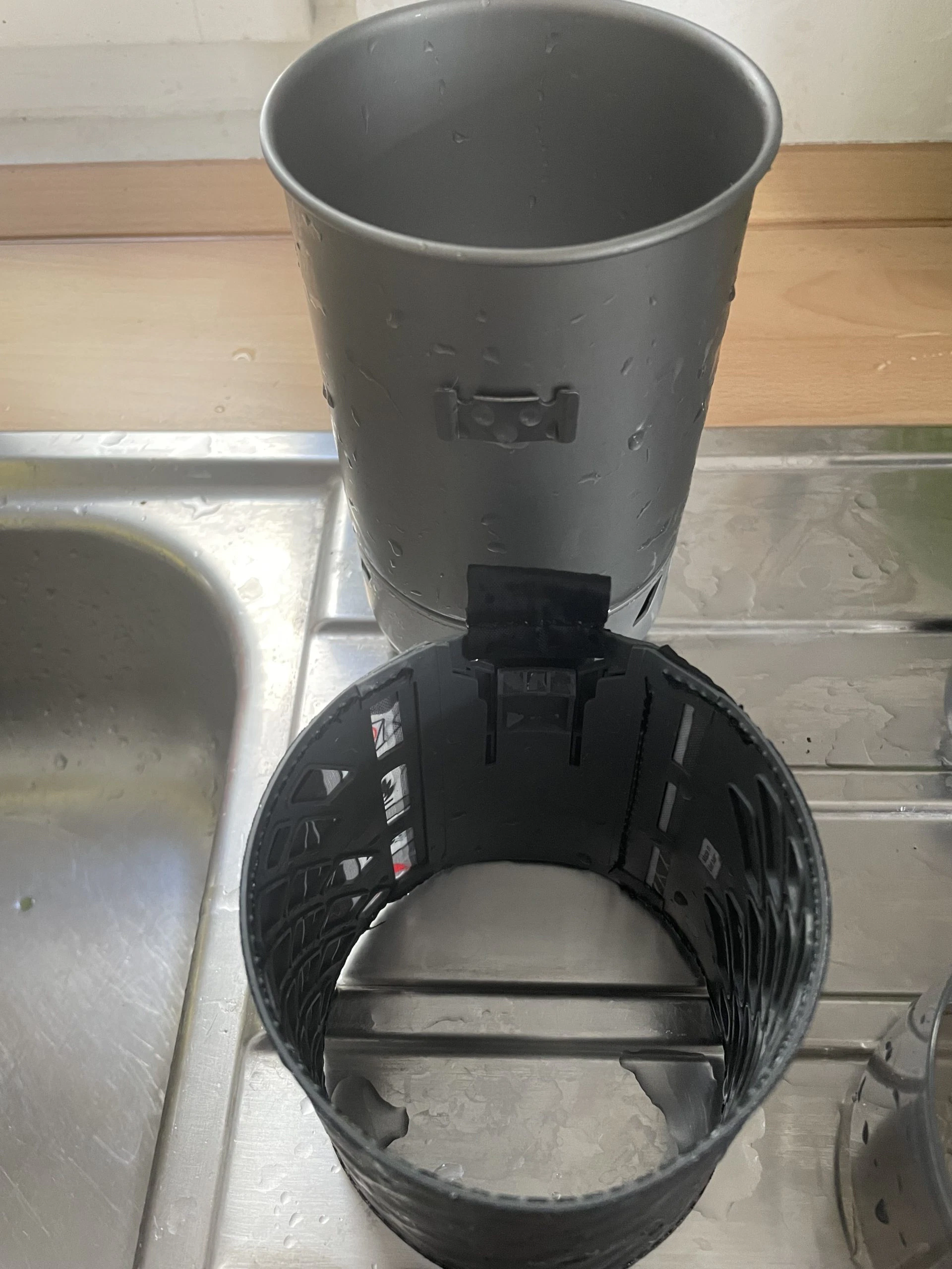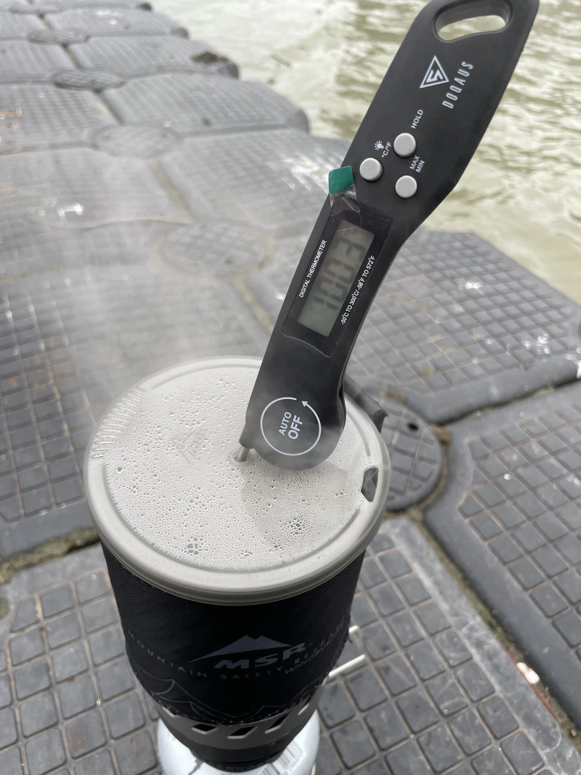 Die Getränke beziehungsweise Suppen ließen sich sehr gut aus dem Becher essen und trinken, und die Kunststoffkappe hat den Flüssigkeitsverlust beim Kochen gut unterbunden. Das mittig positionierte Loch in der Kunststoffkappe dient beispielsweise zur Montage des erhältlichen Kaffee-Siebs. Christian hat bei seinen Tests dieses Loch auch für ein Fleischthermometer genutzt und konnte rechtzeitig den Brenner ausmachen, wenn der Inhalt heiß genug war.