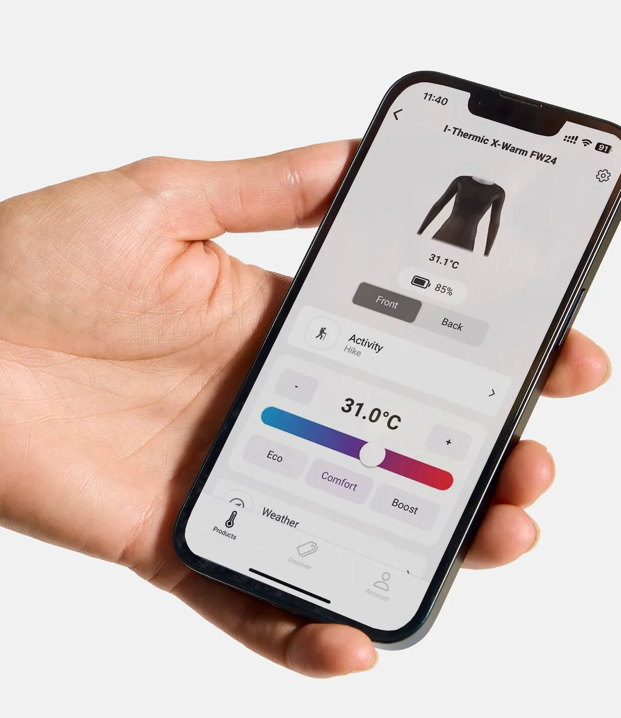 Das Shirt wird über einen kompakten Akku mit Strom versorgt, der in einer kleinen Tasche an der Hüfte sitzt. Die Steuerung kann manuell über ein Bedienelement oder bequem via Clim8-App erfolgen. Der Stoff ist elastisch, schnell trocknend und geruchshemmend, mit einer körpernahen Passform für maximale Effizienz der Heizleistung.