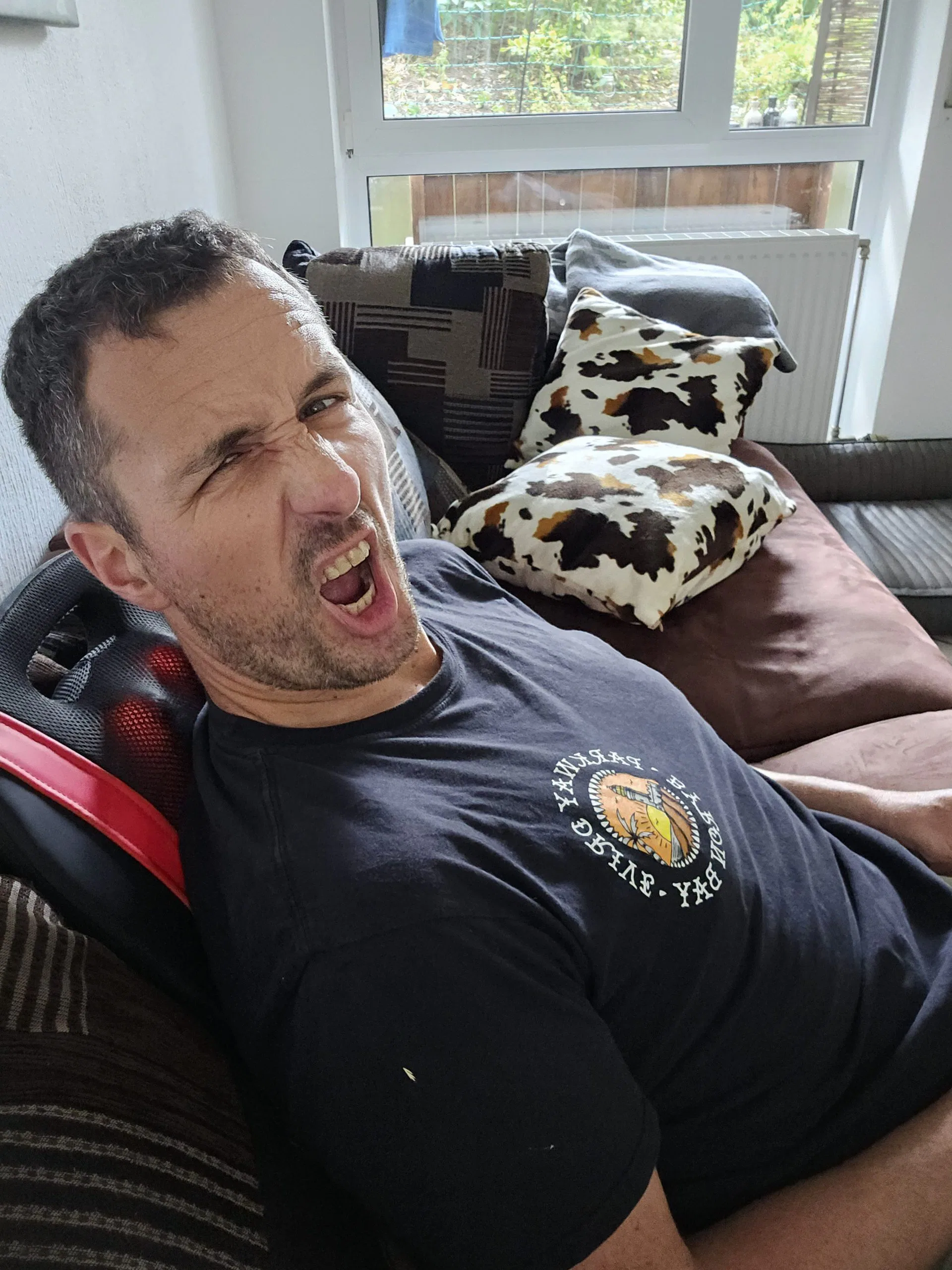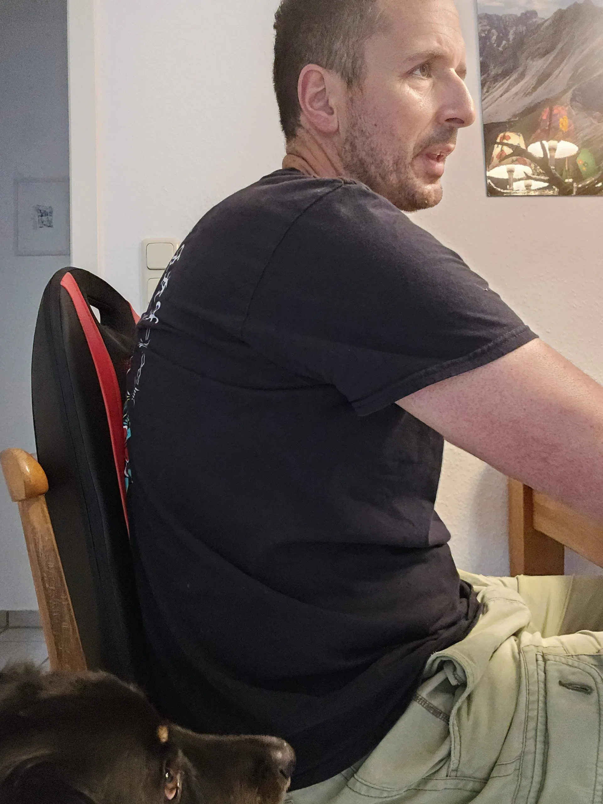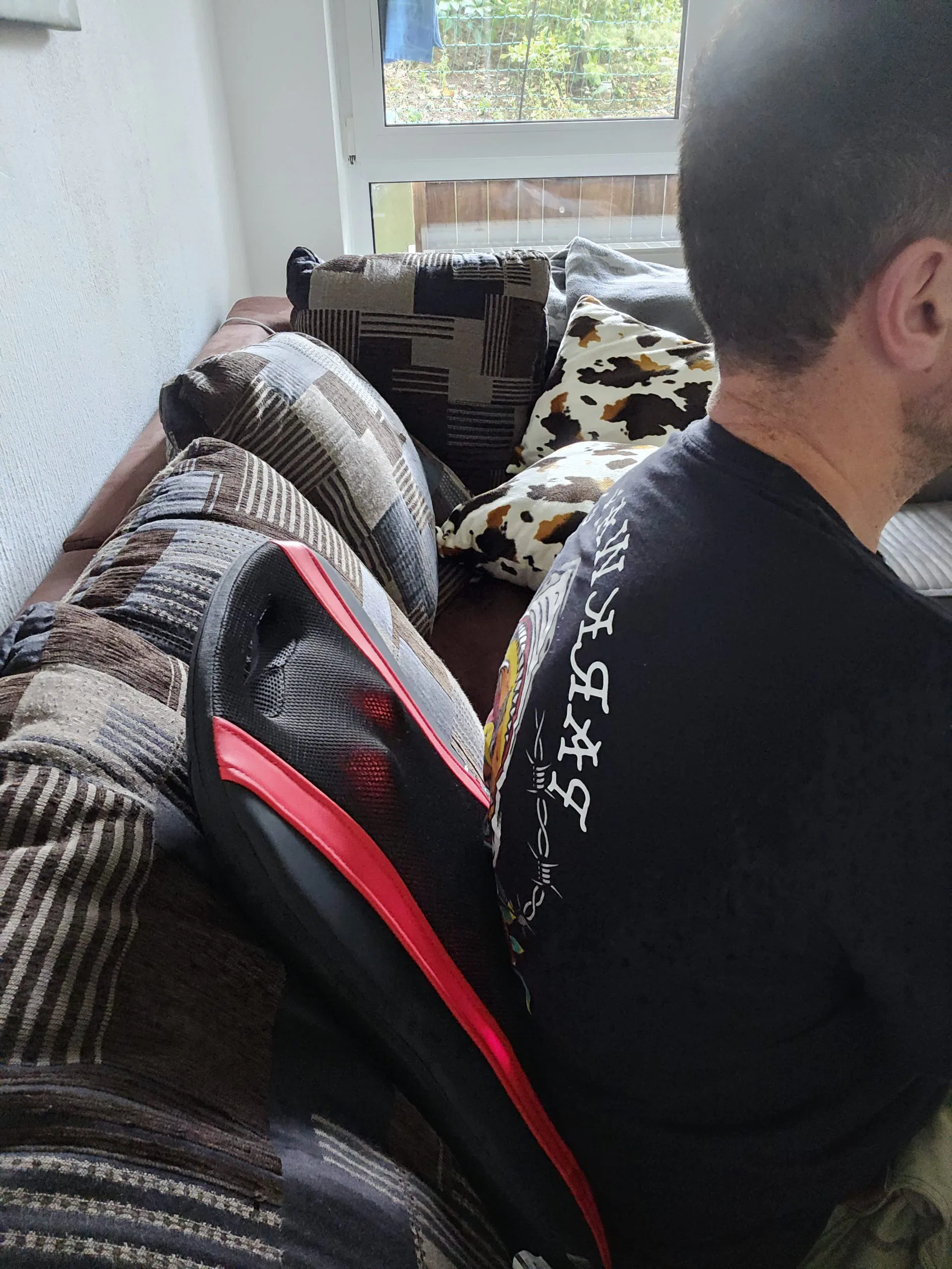 Bei der Nutzung des OrthoMechanik Rückenmassagegerät ist man recht flexibel, man muss nur eine Lehne für den Rücken hinbekommen. Es eignet sich somit auf fast allen Stühlen, Sesseln oder Couchgarnituren. Durch diese Vielfalt findet eigentlich jeder einen Platz. Zur Bedienung gibt es dann nur 3 Tasten, die seitlich am Gerät angebracht sind. Mit der obersten Taste aktiviert man die Heizung, mit der mittleren ändert man die Drehrichtung der Massagenoppen und mit der untersten schaltet man das Gerät an oder aus. Lehnt man am Gerät, muss man diese Tasten erst suchen, mit der Zeit findet man diese dann aber recht besser. Je nachdem, wo man nun sitzt, muss jeder für seinen Rücken die ideale Position finden. Die 14 Noppen bewegen sich auf einer Länge von ca. 40 cm. Björns Rückenlänge beträgt allerdings ca. 60 cm. Er musste im Test immer hoch oder runter rutschen, damit dort massiert wurde, wo er es wollte. Björn ist hier sicherlich eine Ausnahme mit seinen 2 Metern, generell kann man sagen, dass man mit dem OrthoMechanik Rückenmassagegerät schon ein großes Spektrum abdeckt. Hat man dann seine Position gefunden, lehnt man sich einfach an das Gerät und genießt die Massage. Will man die Wirkung der Massage verstärken, empfiehlt es sich, einen härteren Hintergrund zu suchen, an dem man das Gerät anlehnt. Auf einem Esszimmerstuhl mit starrer Rückenlehne bekommt man so eine intensivere Massage als auf der Couch mit weichen Kissen.