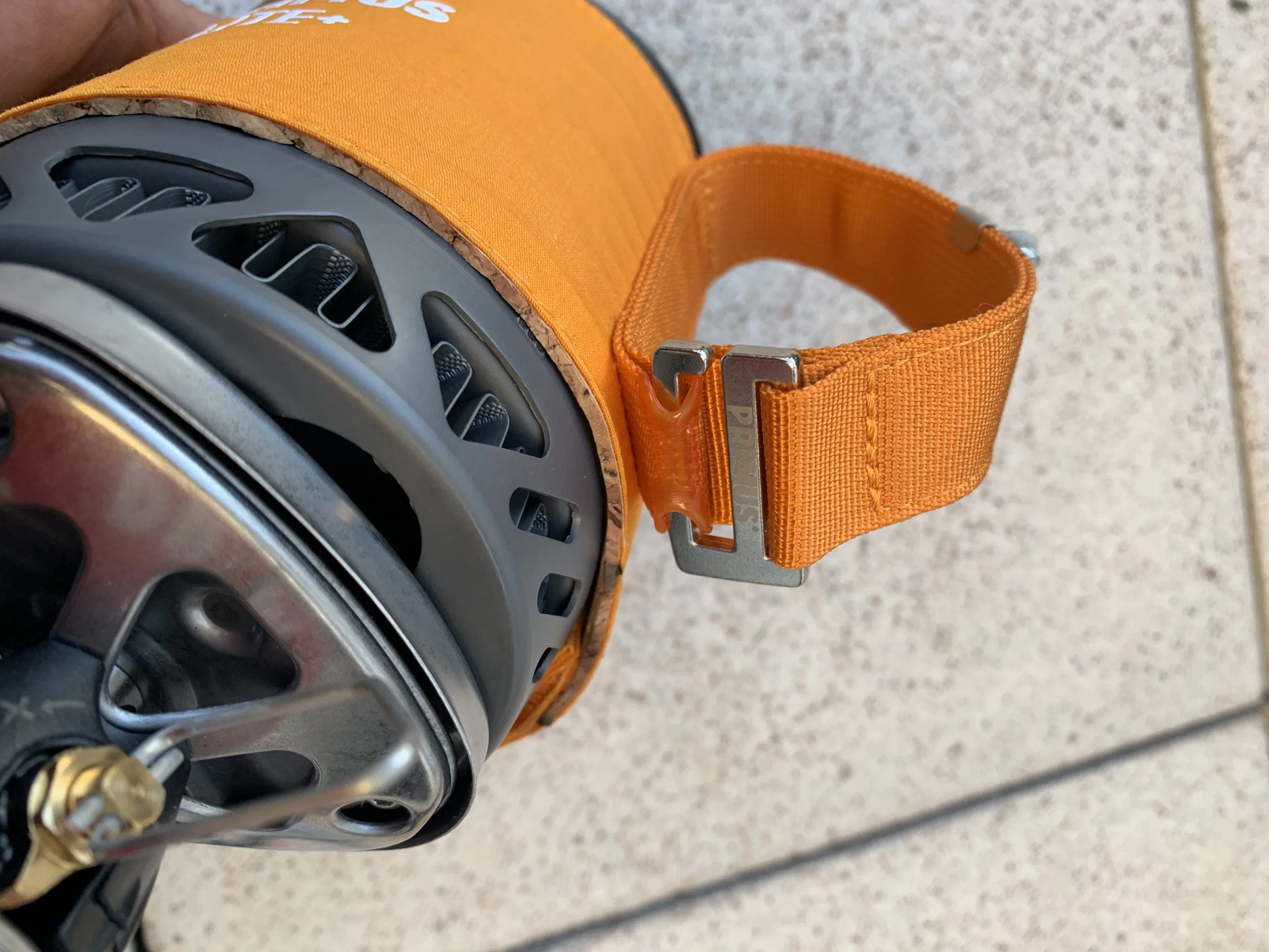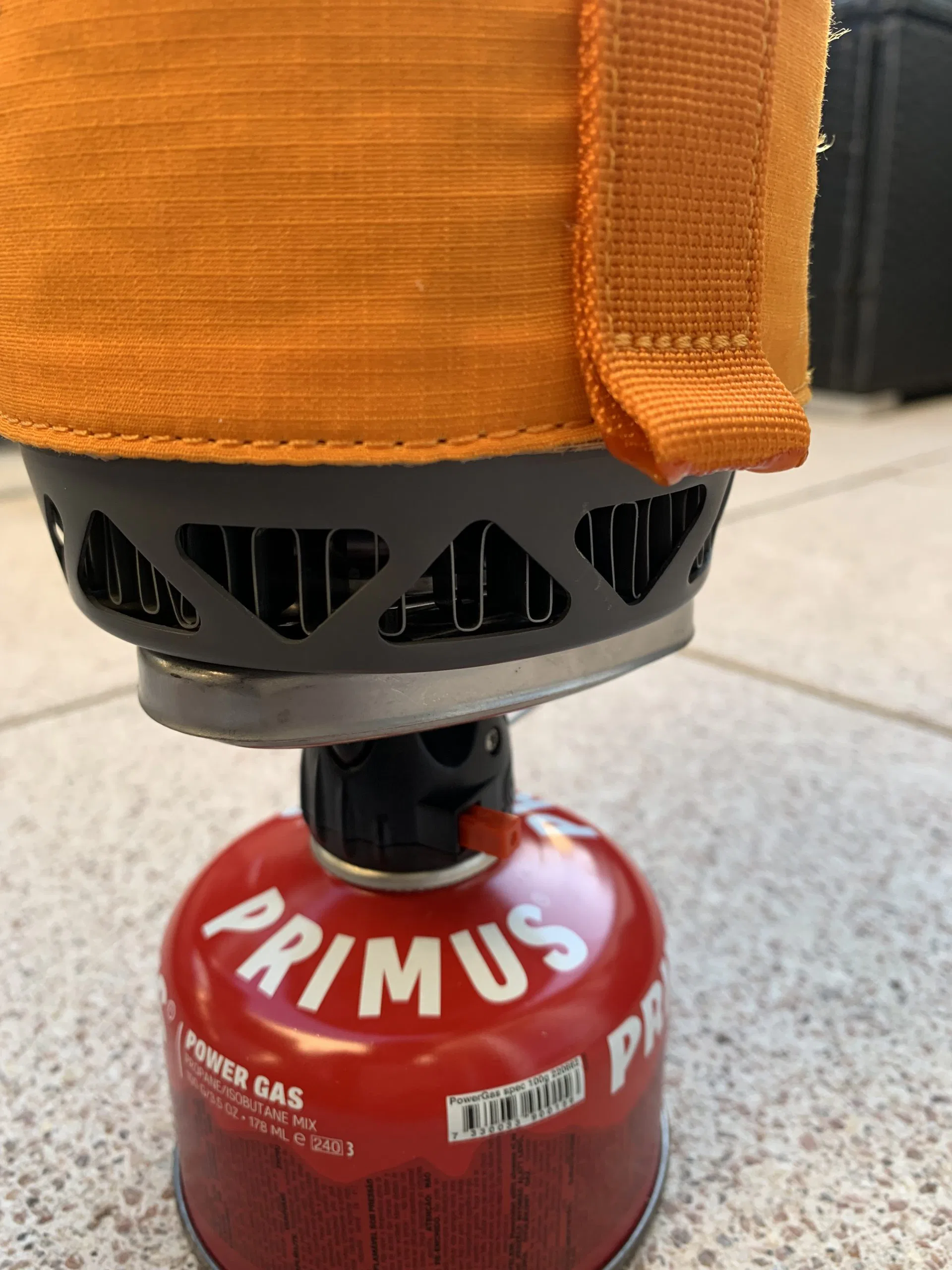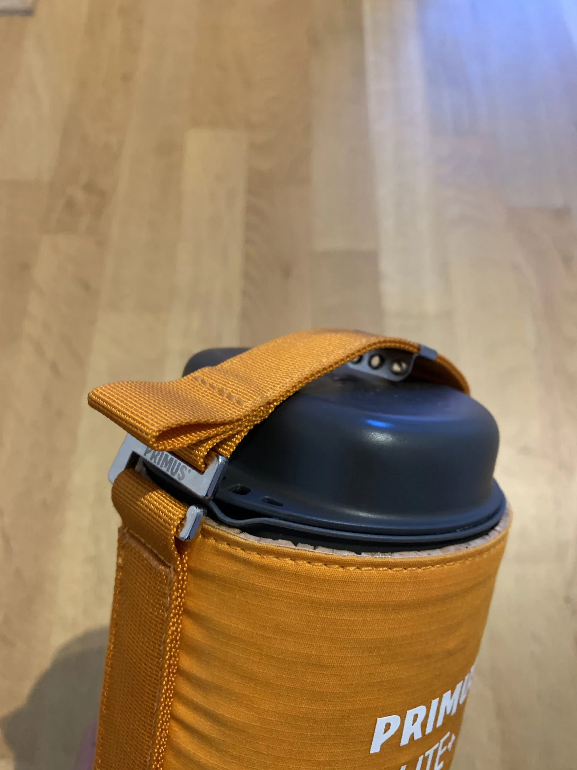 Hasret nutzte das Primus Lite Plus Stove System auf einer Fastpacking Tour und bei kleineren Wanderungen zum Kaffee machen. Der Brenner überzeugt in jedem Fall. Dieser liefert die nötige Power, um 0,5 l Wasser in 02:42 min zum Kochen zu bringen, was sehr schnell ist. Auf der Fastpacking Tour hatte Hasret den Kocher für zwei Personen benutzt. Dieser wurde für 2 Abendessen und 2 Kaffee (ca. 1 L Wasser) und 2 Kaffee (0,5 L Wasser) am Morgen für zwei Personen genutzt. Die Gaskartusche wog im vollen Zustand ca. 201 g und nach der Tour 183 g. Also wurden knapp 18 g Gas verbraucht, was vom Verbrauch her gut ist. Vom Packmaß her ist der Primus ebenfalls sparsam und in den Topf passen eine 100 g Primus Power Gas Kartusche, der Brenner und das Mikrofasertuch. Oben drauf kam dann der Deckel, der gleichzeitig als Becher diente. Die Ummantelung konnte durch einen Klettverschluss fest- oder abgemacht werden. Der Griff an der Ummantelung konnte durch einen Haken abgemacht werden. Dieser diente ebenfalls als Befestigung für den Inhalt im Topf, indem er über den Deckel umgeschnürt wurde und auf der anderen Seite des Topfes wieder eingehakt werden konnte.