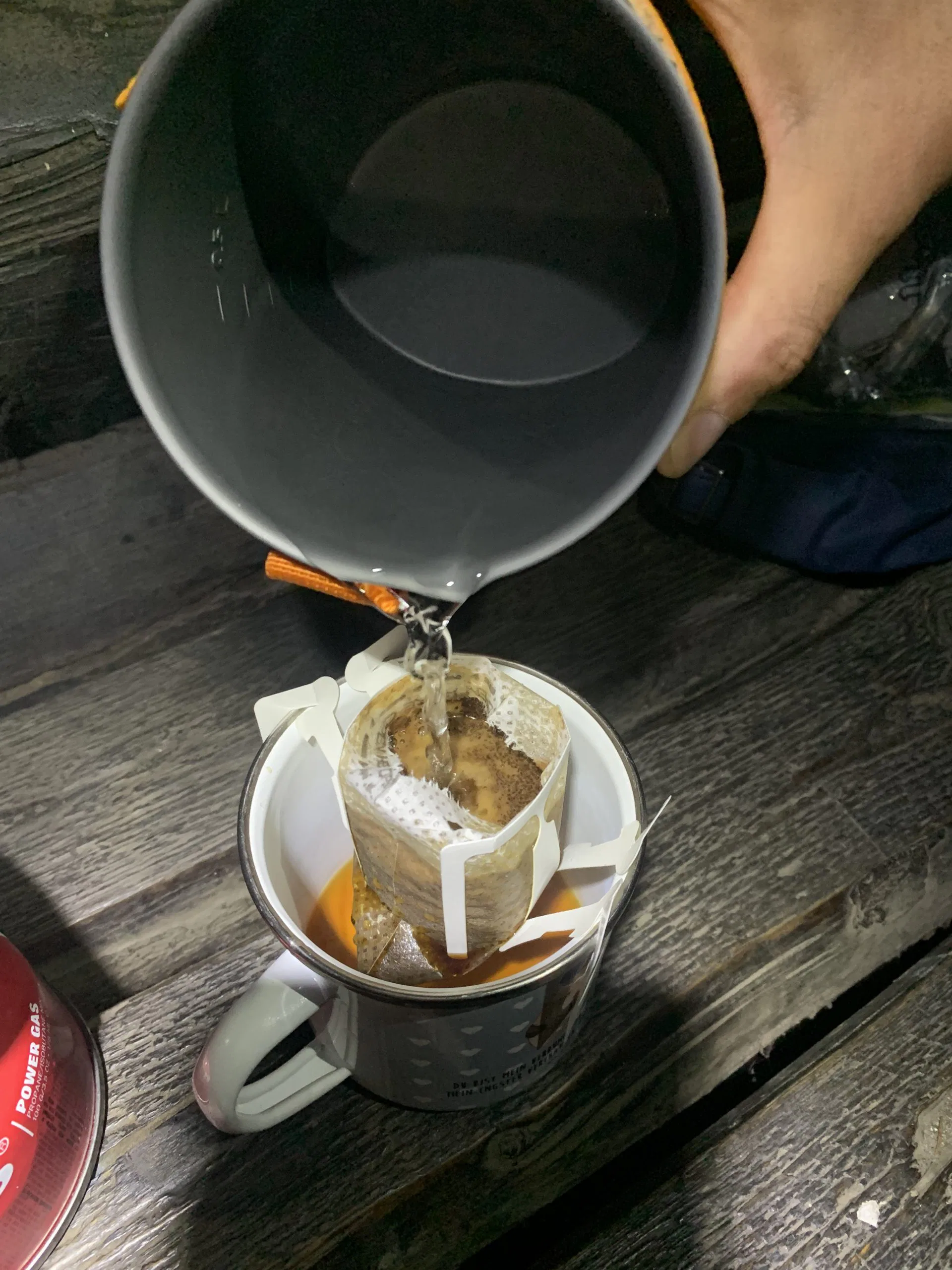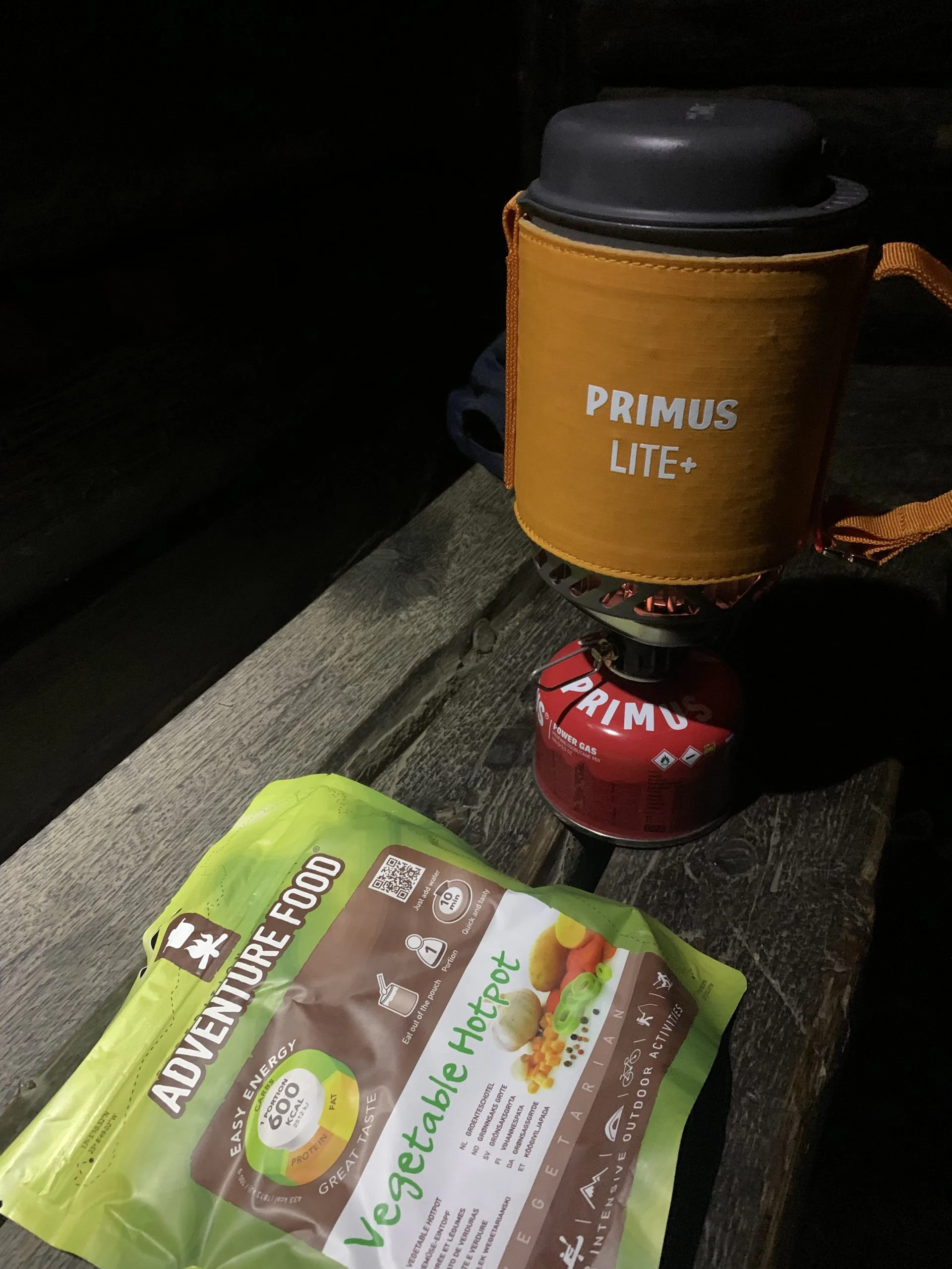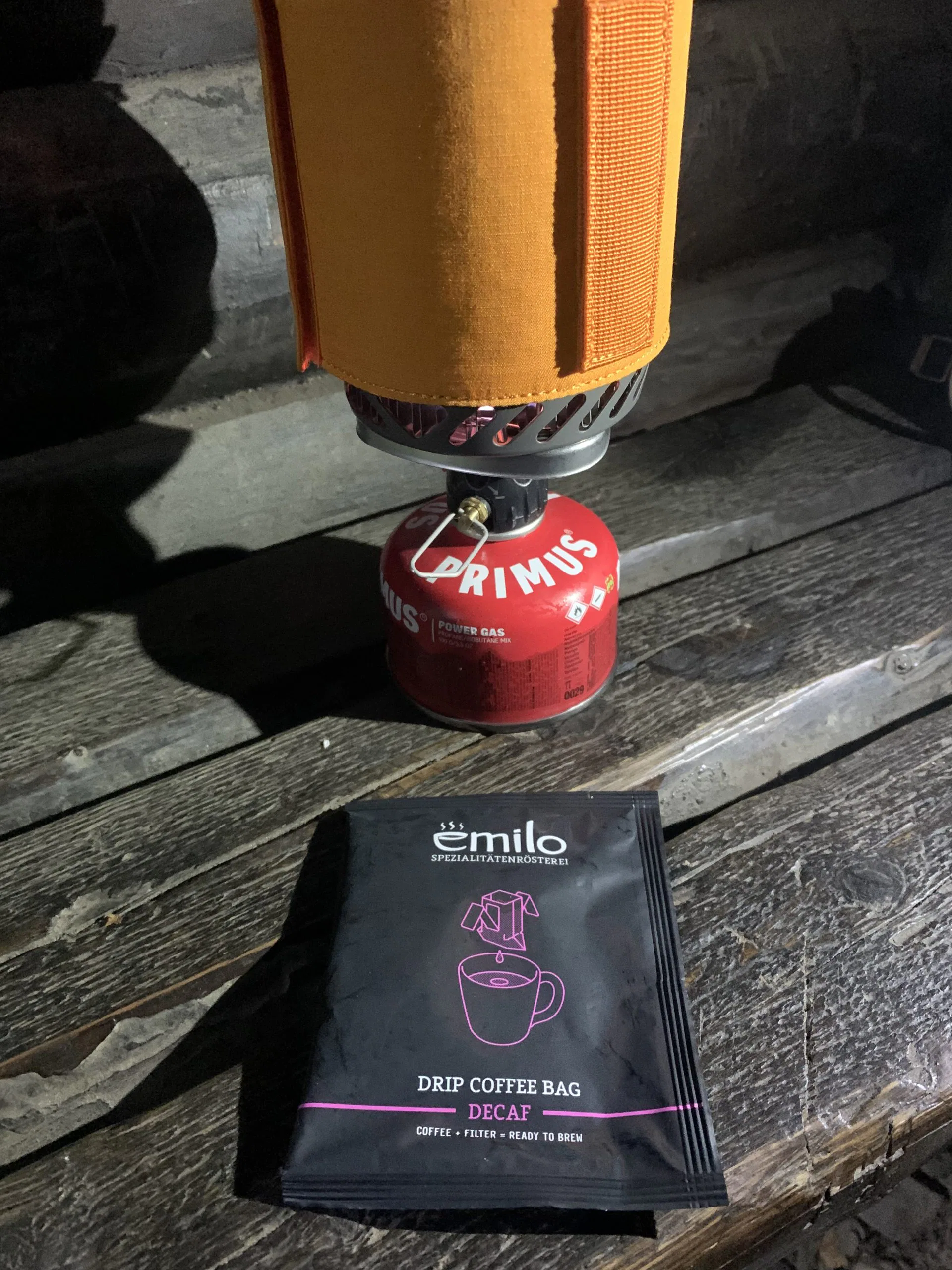 Hasret nutzte das Primus Lite Plus Stove System auf einer Fastpacking Tour und bei kleineren Wanderungen zum Kaffee machen. Der Brenner überzeugt in jedem Fall. Dieser liefert die nötige Power, um 0,5 l Wasser in 02:42 min zum Kochen zu bringen, was sehr schnell ist. Auf der Fastpacking Tour hatte Hasret den Kocher für zwei Personen benutzt. Dieser wurde für 2 Abendessen und 2 Kaffee (ca. 1 L Wasser) und 2 Kaffee (0,5 L Wasser) am Morgen für zwei Personen genutzt. Die Gaskartusche wog im vollen Zustand ca. 201 g und nach der Tour 183 g. Also wurden knapp 18 g Gas verbraucht, was vom Verbrauch her gut ist. Vom Packmaß her ist der Primus ebenfalls sparsam und in den Topf passen eine 100 g Primus Power Gas Kartusche, der Brenner und das Mikrofasertuch. Oben drauf kam dann der Deckel, der gleichzeitig als Becher diente. Die Ummantelung konnte durch einen Klettverschluss fest- oder abgemacht werden. Der Griff an der Ummantelung konnte durch einen Haken abgemacht werden. Dieser diente ebenfalls als Befestigung für den Inhalt im Topf, indem er über den Deckel umgeschnürt wurde und auf der anderen Seite des Topfes wieder eingehakt werden konnte.
