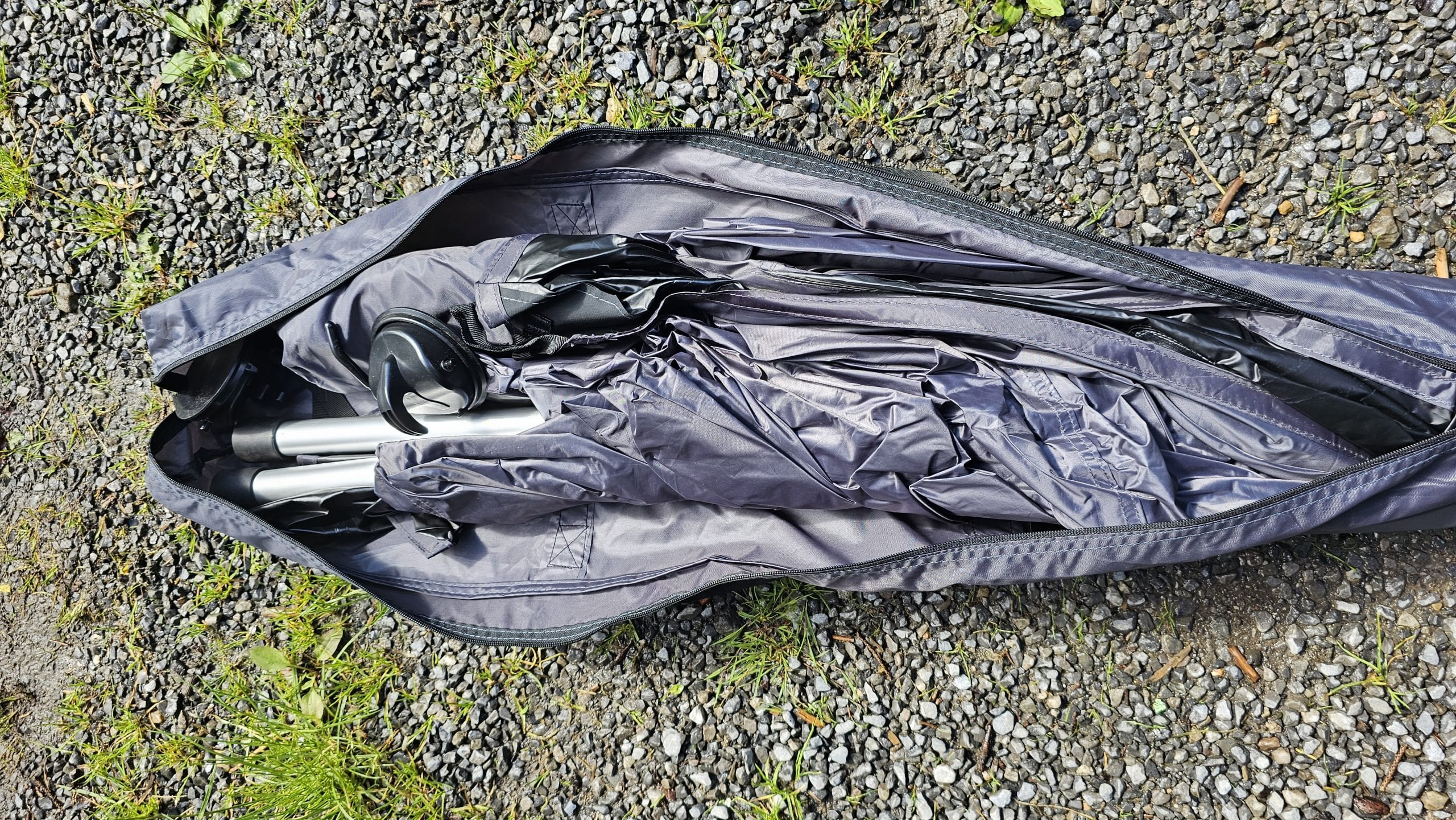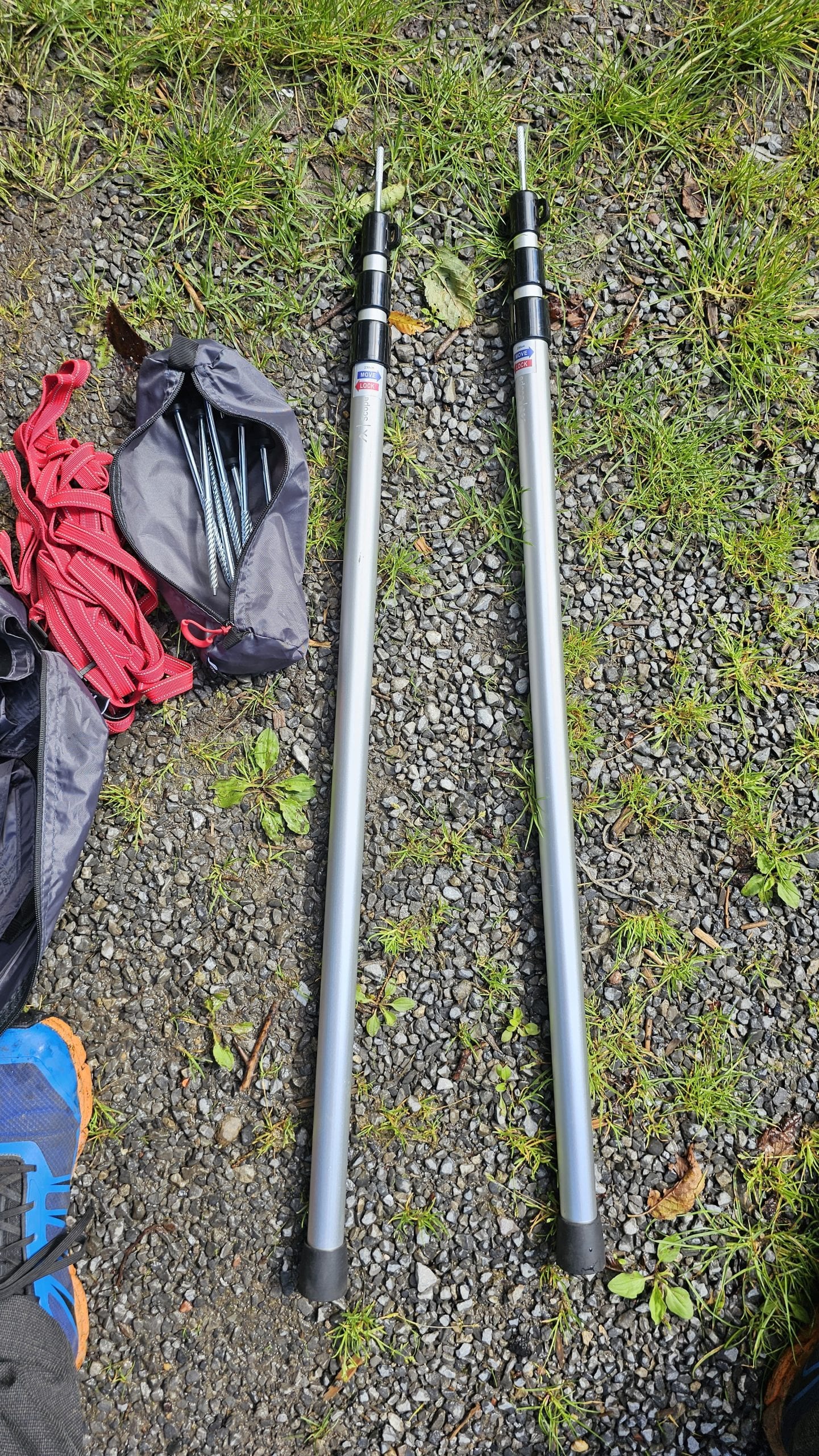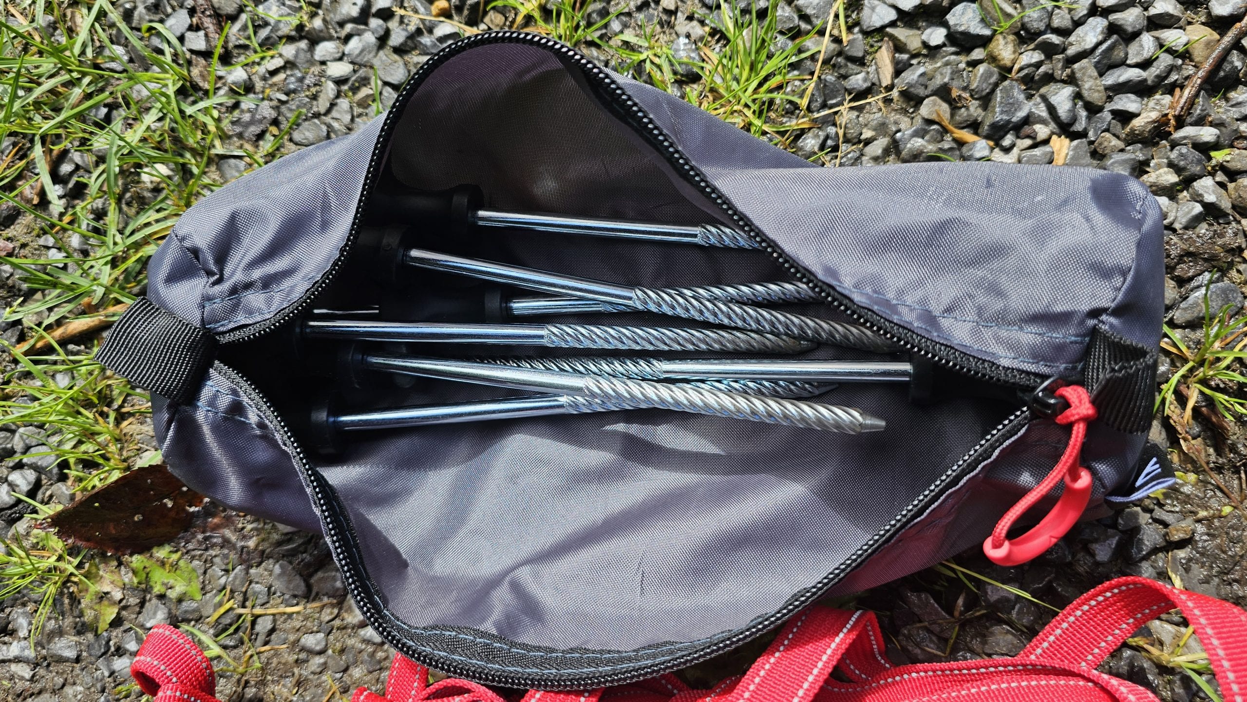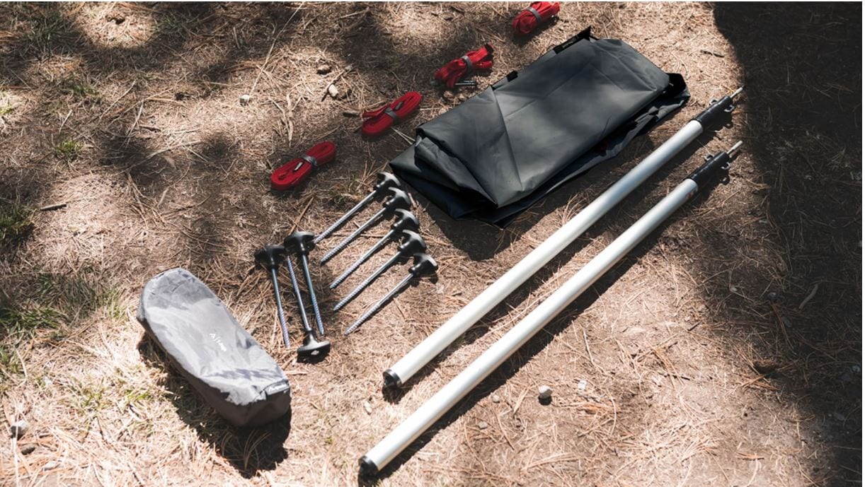 Das qeedo Motor Tarp Car hat ein Packmaß von ca. 101 cm x 13 cm x 13 cm, wiegt 3 kg und ist in einer robusten Tasche verpackt, in der sich das Tarp super transportieren lässt. Björn musste das Tarp dann natürlich direkt ausprobieren und so ging es noch am Tag der Übergabe durch den Postboten auf einen nahegelegenen Waldparkplatz. Zum Lieferumfang gehören das Tarp, 2 Aluminium-Teleskopstangen, 7 T-Pegs, 2 Saugnäpfe, 2 lange Abspannleinen für die Teleskopstangen sowie 2 kurze Abspannleinen für die Seitenflügel. Das gesamte Material machte auf Björn sofort einen sehr guten Eindruck. Besonders die robusten Heringe (Hier T-Pegs genannt) gefielen sehr gut. Aber auch die Teleskopstangen und das Material des Tarps wirken äußerst hochwertig. Bei den Saugnäpfen war Björn dann allerdings etwas skeptisch, ob die wirklich halten?