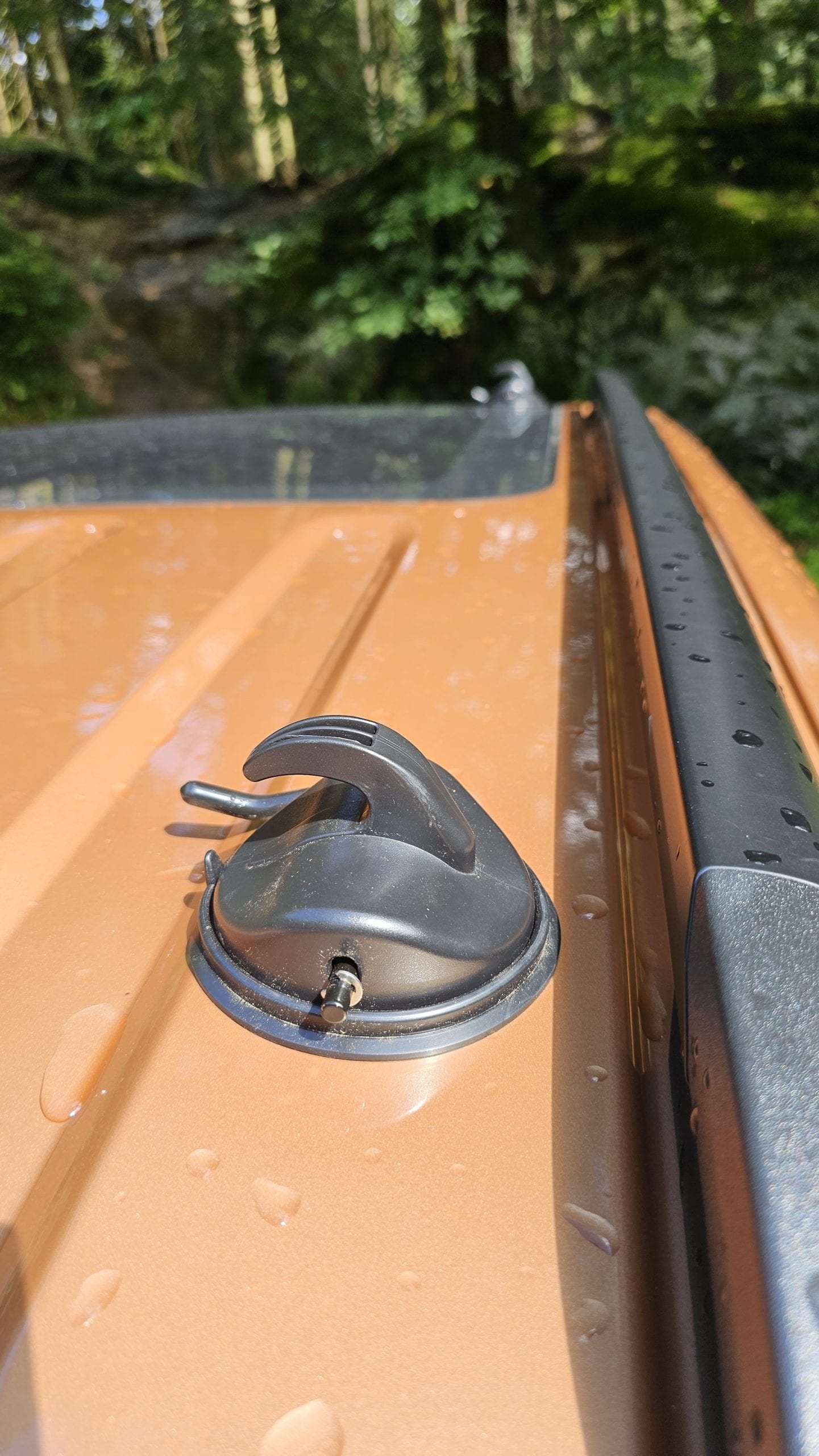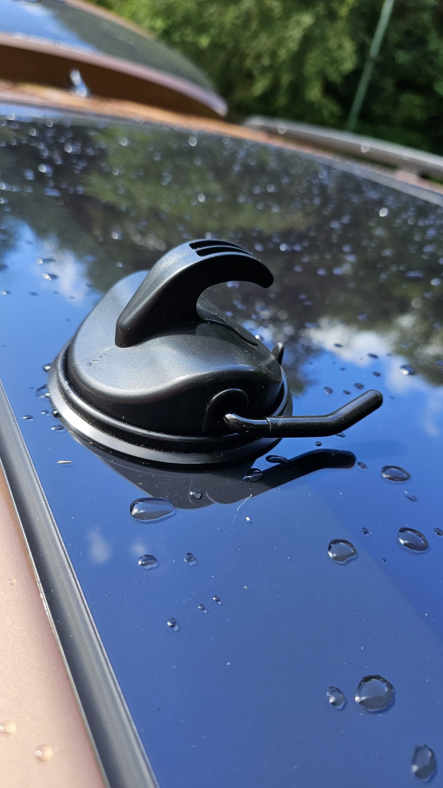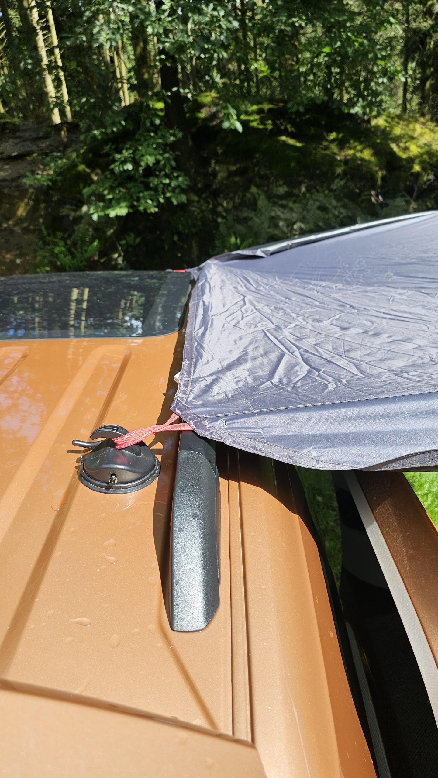 Der Aufbau des qeedo Motor Tarp Car wird auf der Website von qeedo mit “3,2,1, aufgebaut beschrieben” und im Prinzip ist das auch so. Ok, beim ersten Anlauf vielleicht 5,4,3,2,1 aufgebaut, aber schnell geht es auf jeden Fall. Zuerst müssen die Saugnäpfe aufs Dach. Hier ist absolut zu empfehlen, dass man die Fläche kurz abgewischt und dann Saugnapf leicht angefeuchtet. Damit man gleich den richtigen Abstand zwischen den beiden Saugnäpfen hat, sollte man das Tarp zur Hand haben. Hat man dann die Saugnäpfe auf dem Dach fixiert, wird die eine Seite des Tarp in den Hacken eingehängt. Nun werden die Teleskopstangen ausgezogen (maximal 2,3m) in den Ösen fixiert, aufgestellt und mit den Abspannleinen gesichert. Das war’s, dieser Aufbau dauerte beim ersten Versuch bei Björn keine 5 min alleine. Beim Aufbau hat man dann noch die Option, die Seitenflügel abzuspannen, was sich bei Regen empfiehlt oder offen zu lassen. Der Abbau geht dann in umgekehrter Reihenfolge und ist ebenfalls in unter 5 min erledigt.