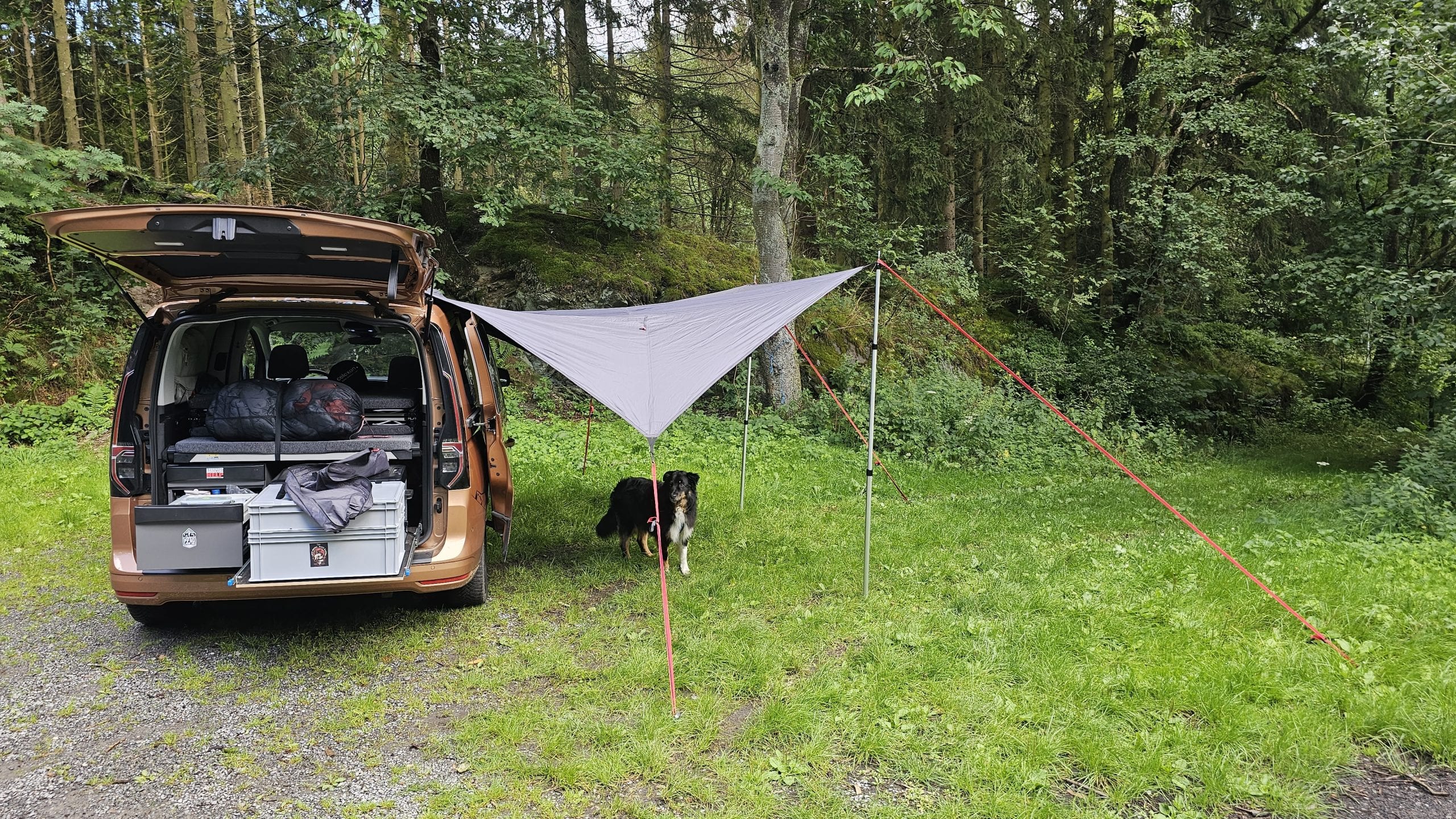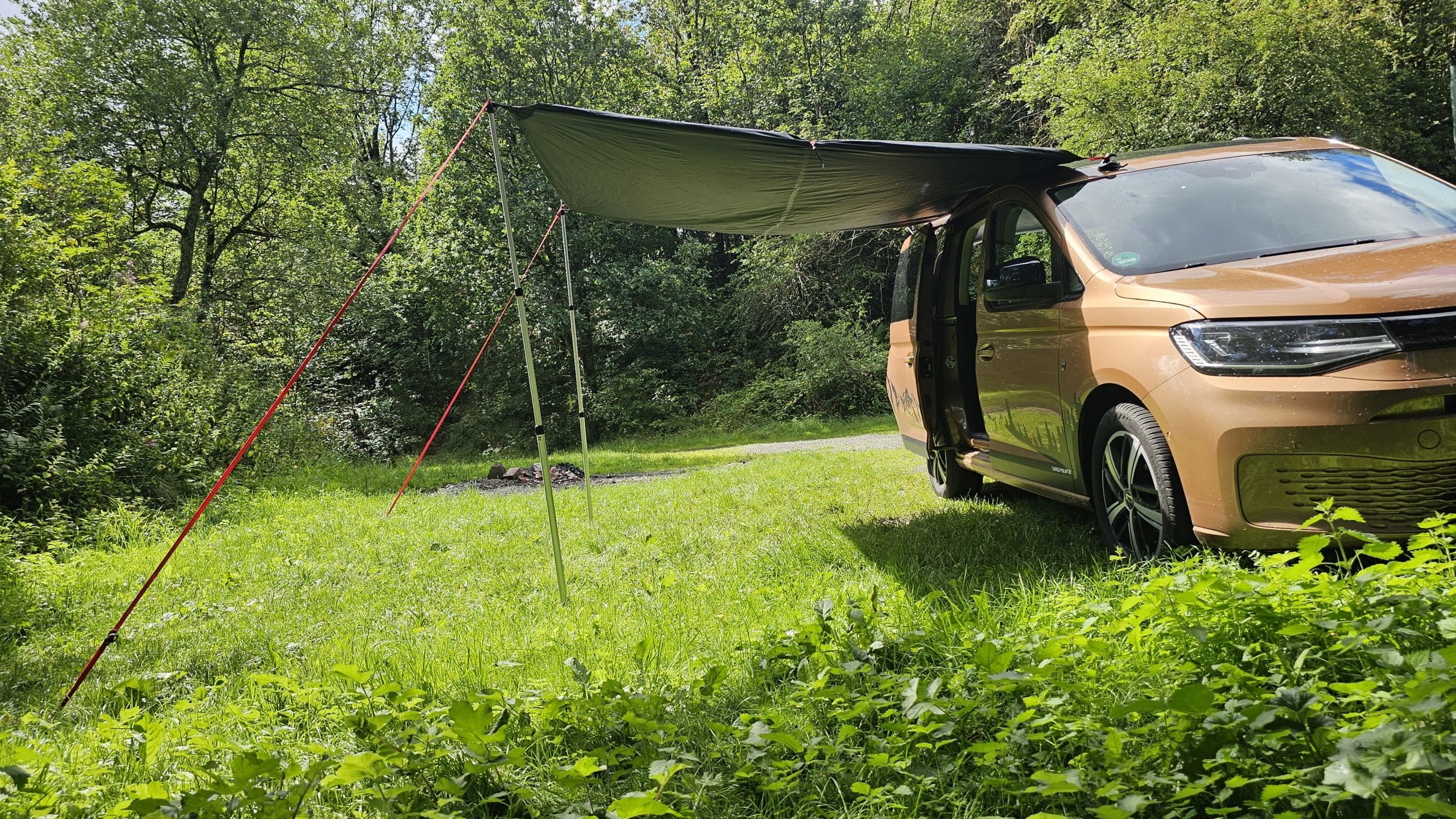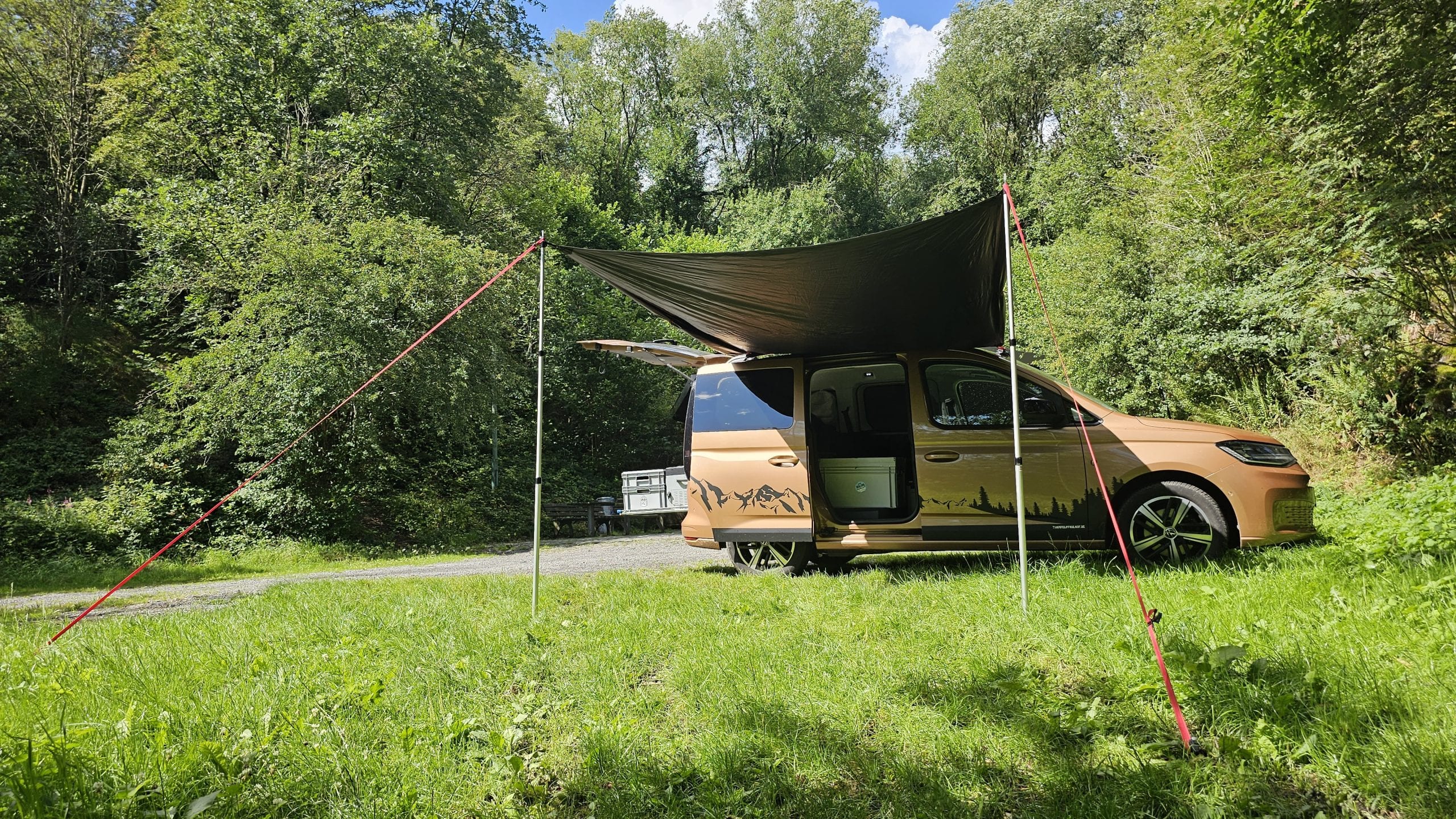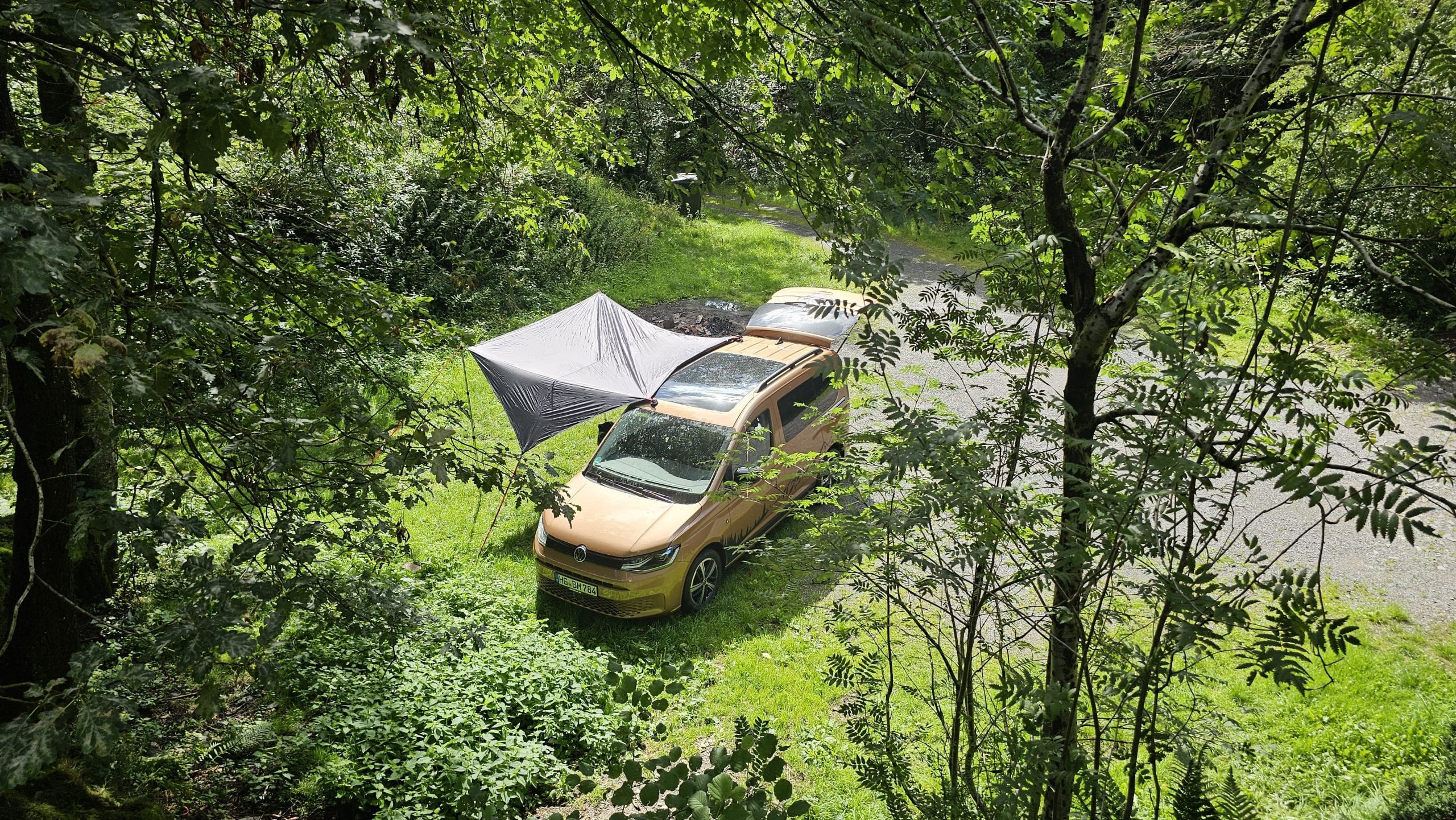 Björn hatte das qeedo Motor Tarp Car bei seinem Caddy im Einsatz und mit Holgers Bulli beim Festival. Durch das geringe Gewicht und das Packmaß nimmt es im Auto kaum Platz weg. Wenn man es benötigt, ist es blitzschnell aufgebaut und man hat entweder Schutz vor der Sonne oder dem Regen. Die Größe von 250 cm x 400 cm ist für 2 Personen vollkommen ausreichend. Beim Festival passten sogar 6 Leute drunter. War Björns anfangs noch skeptisch bezüglich der Saugnäpfe, überzeugten sie ihn im Test tadellos. Denn sie hielten absolut sicher und fest und machten das Tarp so noch deutlich flexibler beim Aufbau. Auch fand Björn die Teleskopstangen toll, die man bis auf 2,3 m ausziehen konnte. Denn so hatte er mit seinen 2m Körpergröße bequem Platz unter dem Tarp. Lediglich beim Ausziehen der Stangen gab es am Festival ein Problem, das war aber wohl eher ein Anwenderproblem. Das schwarze  Aussenmaterial ist mehrfach beschichtet, imprägniert und alle Nähte sind versiegelt. In einen richtigen Regenschauer kam Björn im Testzeitraum nicht, aber die Wassersäule von 4.000mm sollte hier schon dicht halten. Auf dem Festival waren es dann aber ca. 30 Grad bei wolkenlosem Himmel und hier merkte man dann gerade zur Mittagszeit deutlich Wärme unter dem Tarp. Klar, das Material ist schwarz und wird warm, das man das aber so deutlich spürt, überraschte etwas. Überzeugen konnten die Abspannleinen und die Heringe (TZ-Pegs). Diese waren nicht nur super easy auf dem Boden gedreht, sie hielten auch Bomben fest. Selbst einem leichtem Sturm am vorletzten Tag, hielten diese problemlos Stand.