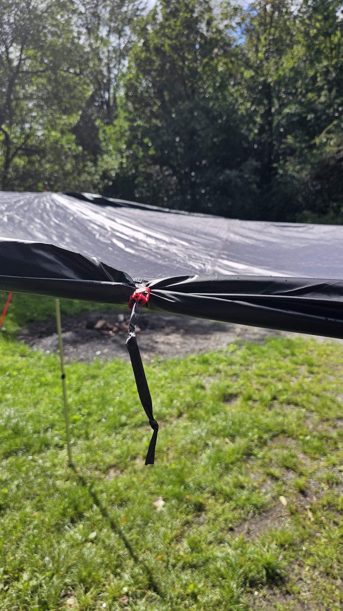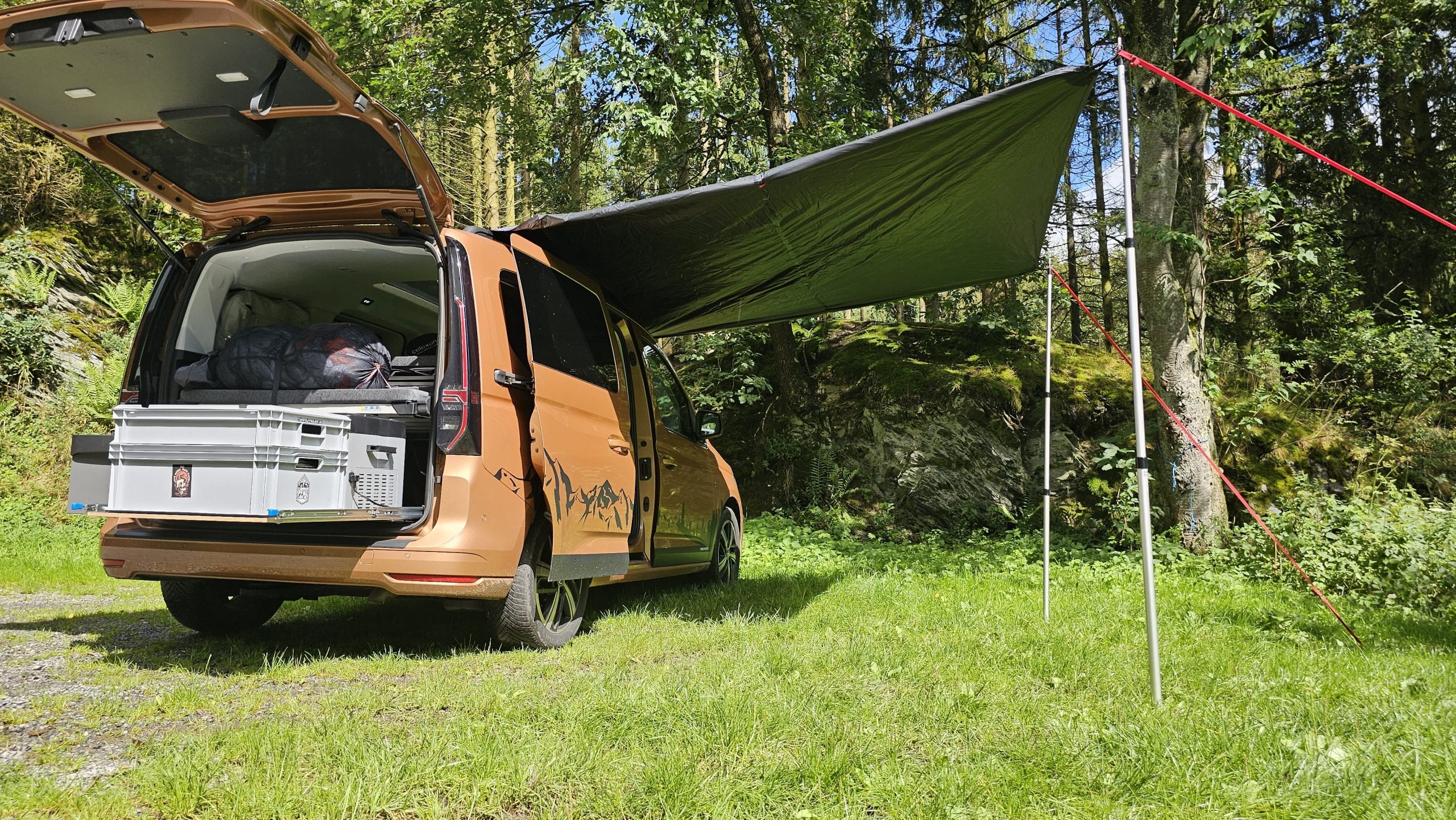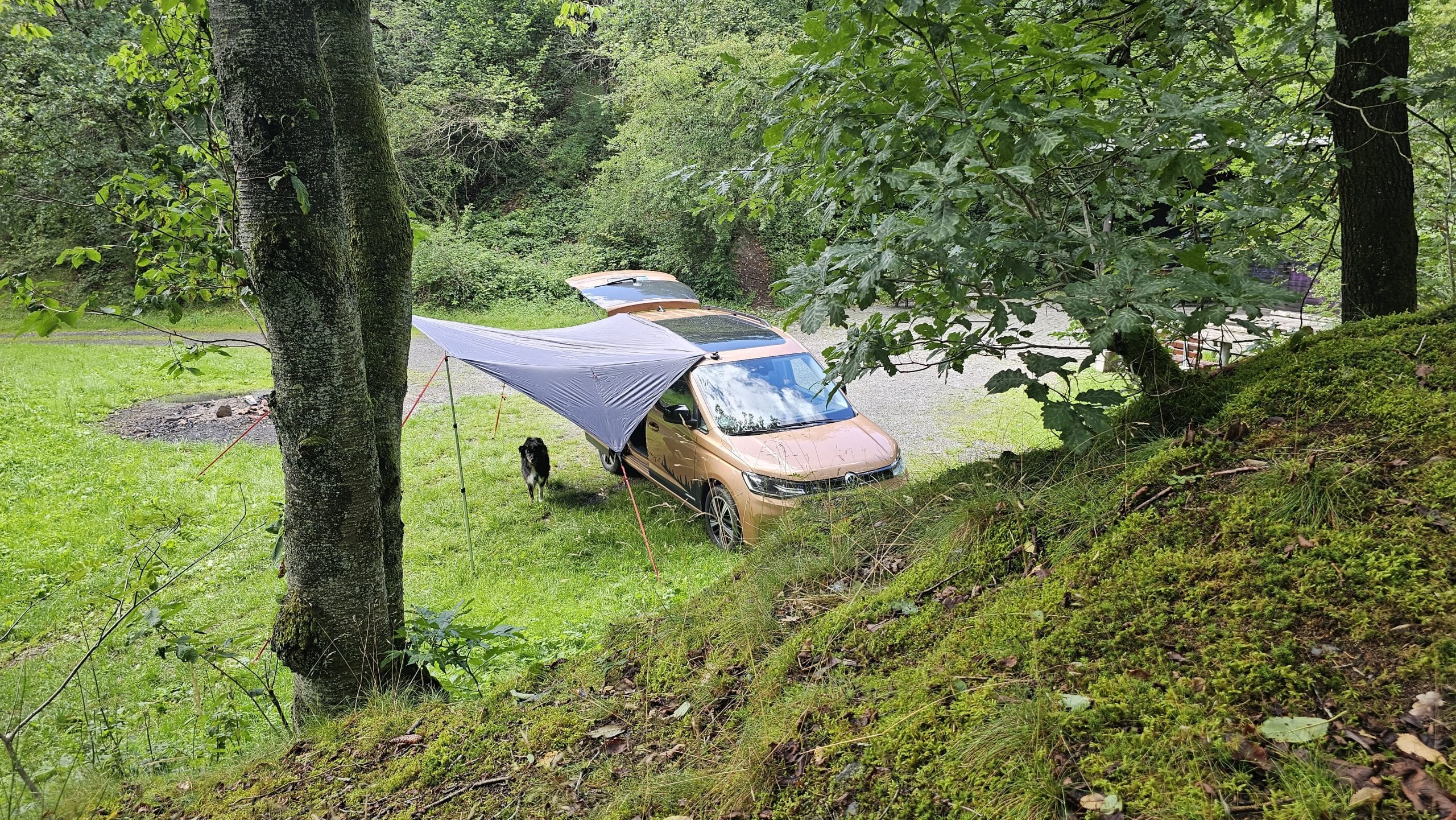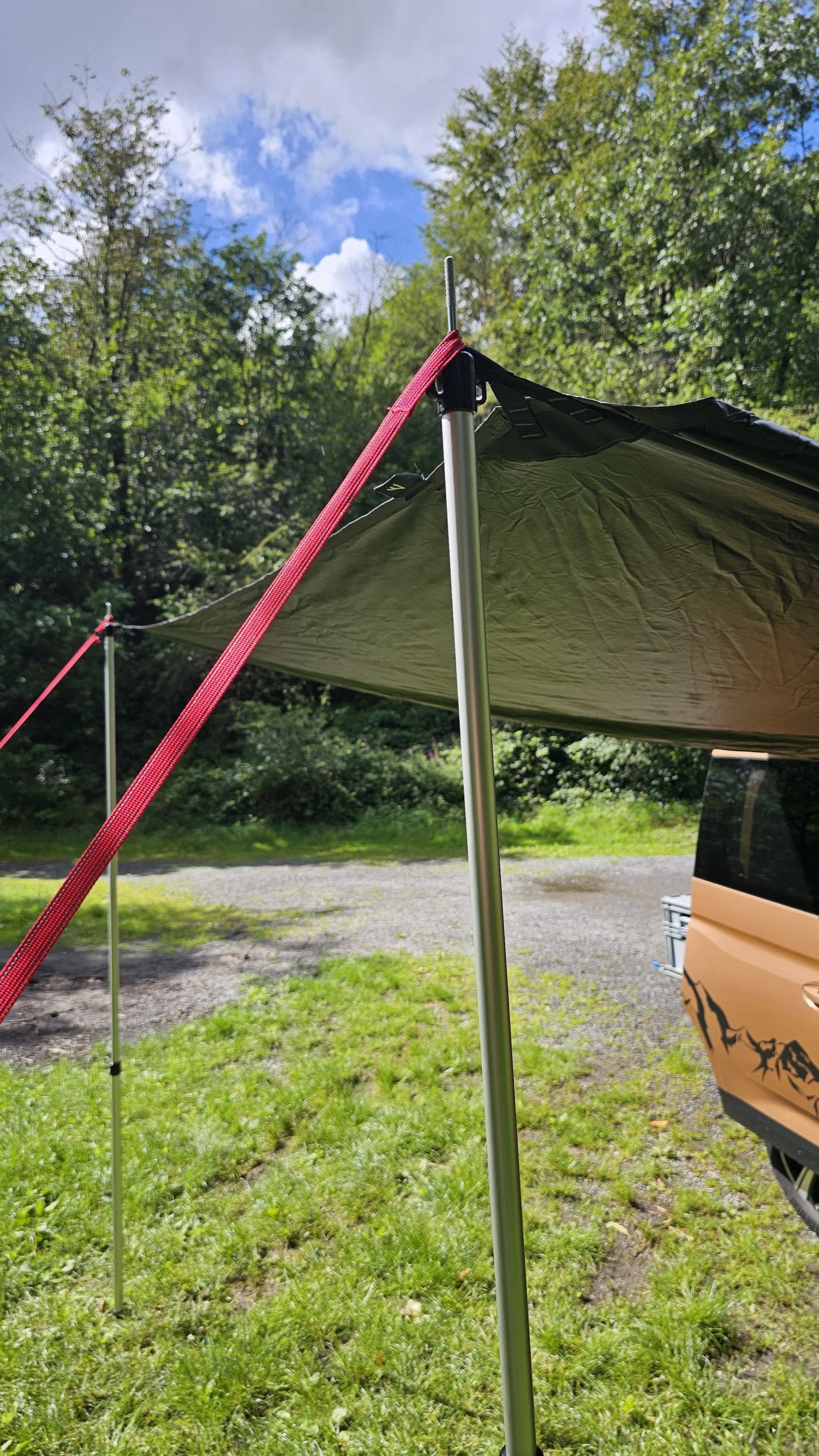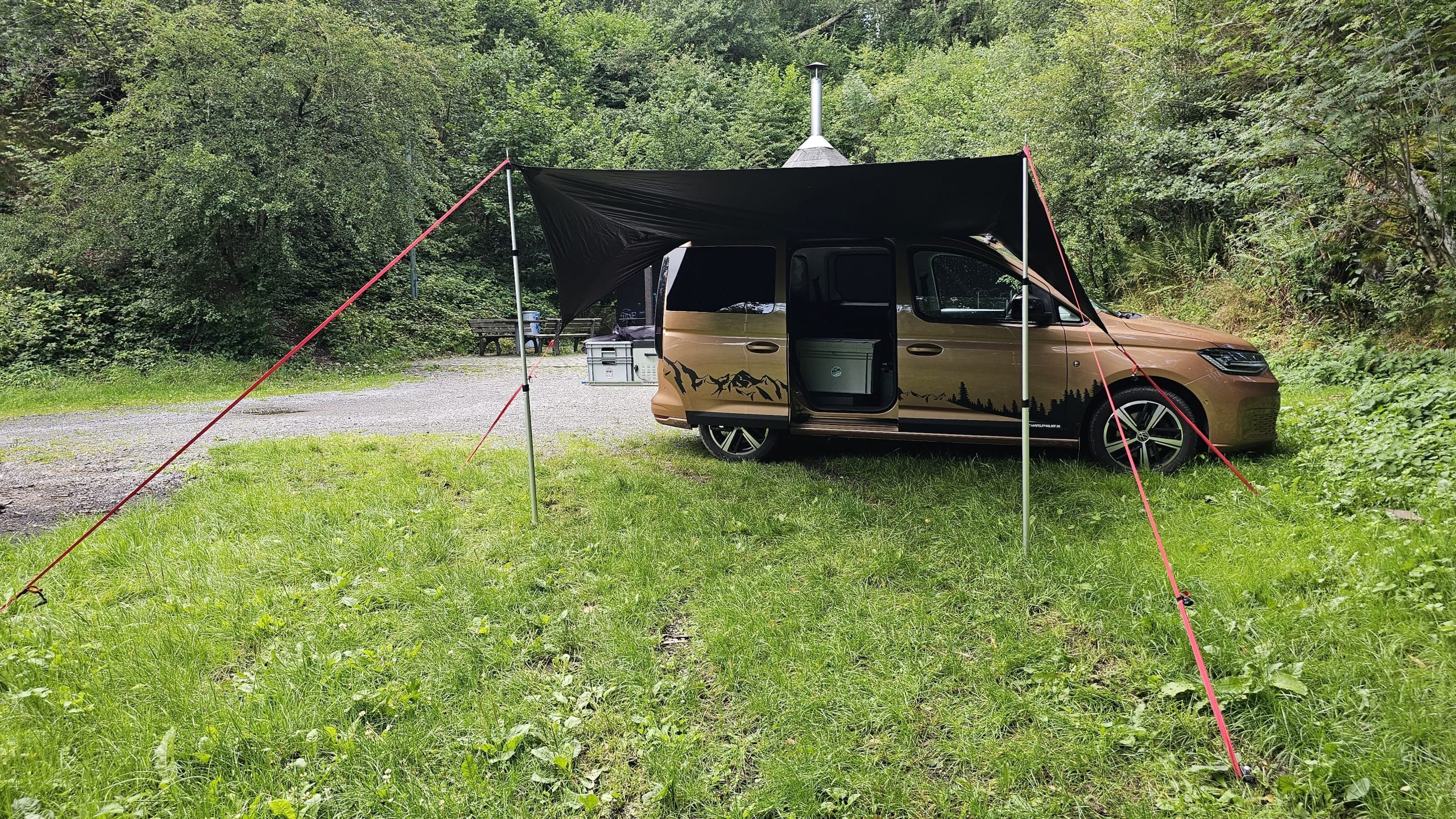 Björn hatte das qeedo Motor Tarp Car bei seinem Caddy im Einsatz und mit Holgers Bulli beim Festival. Durch das geringe Gewicht und das Packmaß nimmt es im Auto kaum Platz weg. Wenn man es benötigt, ist es blitzschnell aufgebaut und man hat entweder Schutz vor der Sonne oder dem Regen. Die Größe von 250 cm x 400 cm ist für 2 Personen vollkommen ausreichend. Beim Festival passten sogar 6 Leute drunter. War Björns anfangs noch skeptisch bezüglich der Saugnäpfe, überzeugten sie ihn im Test tadellos. Denn sie hielten absolut sicher und fest und machten das Tarp so noch deutlich flexibler beim Aufbau. Auch fand Björn die Teleskopstangen toll, die man bis auf 2,3 m ausziehen konnte. Denn so hatte er mit seinen 2m Körpergröße bequem Platz unter dem Tarp. Lediglich beim Ausziehen der Stangen gab es am Festival ein Problem, das war aber wohl eher ein Anwenderproblem. Das schwarze  Aussenmaterial ist mehrfach beschichtet, imprägniert und alle Nähte sind versiegelt. In einen richtigen Regenschauer kam Björn im Testzeitraum nicht, aber die Wassersäule von 4.000mm sollte hier schon dicht halten. Auf dem Festival waren es dann aber ca. 30 Grad bei wolkenlosem Himmel und hier merkte man dann gerade zur Mittagszeit deutlich Wärme unter dem Tarp. Klar, das Material ist schwarz und wird warm, das man das aber so deutlich spürt, überraschte etwas. Überzeugen konnten die Abspannleinen und die Heringe (TZ-Pegs). Diese waren nicht nur super easy auf dem Boden gedreht, sie hielten auch Bomben fest. Selbst einem leichtem Sturm am vorletzten Tag, hielten diese problemlos Stand.