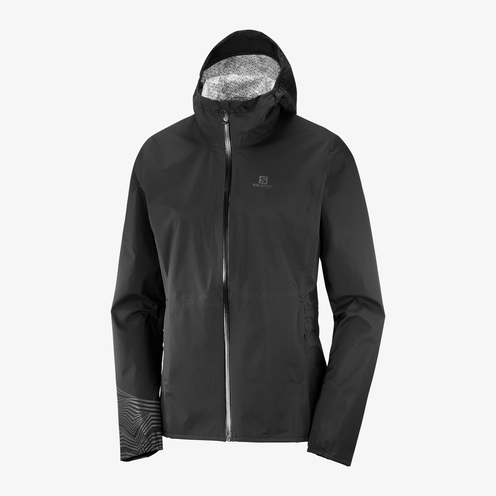 Die Wasserdichtigkeit wird vom Hersteller mit AdvancedSkin Dry 10K angegeben, d.h. 10.000 mm Wassersäule und Schutz vor Regen, Schnee und Wind. Eine Membran sorgt für Atmungsaktivität und lässt Feuchtigkeit entweichen. Der längste Test bei Dauerregen war 1,5 Std., die Jacke hielt absolut trocken. Der Frontreißverschluss und der Reißverschluss der beiden Taschen ist komplett wasserdicht. Am Rücken der Jacke sind Belüftungsschlitze mit eingearbeitet. Das Salomon Logo und aufgedruckte Streifen am rechten Arm reflektieren im Dunkeln.