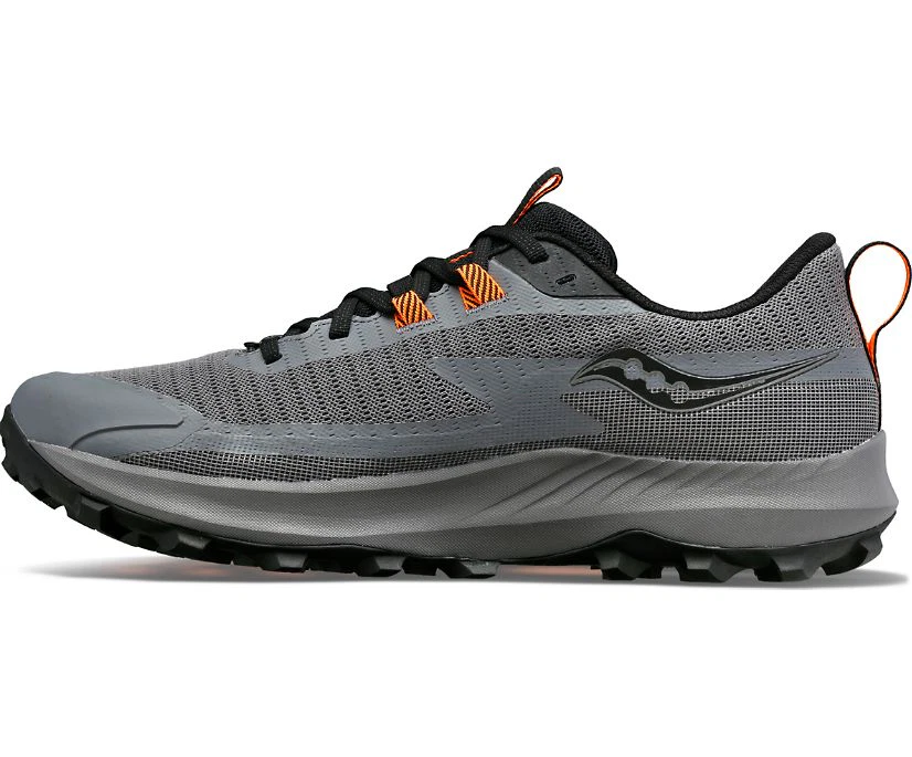 Hasret freute sich schon sehr über einen weiteren Saucony Trailrunningschuh. Bislang hatte er den Xodus Ultra und den Endorphin Edge im Test, mit denen er zufrieden ist. Insgesamt macht der Peregrine einen hochwertigen Eindruck. Alles ist sauber verarbeitet und auch die Schnürsenkel haben eine gute Qualität. Das erste Anprobieren zeigte direkt, dass der Schuh äußerst bequem ist. Hasret bekommt den Schuh in Grau/Schwarz. Das ist auch die einzige Farbe in der GTX Variante. Für die Damen gibt es den Peregrine 13 GTX auch in dieser Farbe. Lediglich die Schnürsenkel haben dann eine andere Farbe. Den Peregrine 13 GTX gibt es auch in der normalen Variante ohne die GORE-TEX-Beschichtung in unterschiedlichen Farben und Größen, sowohl für Herren als auch Damen.