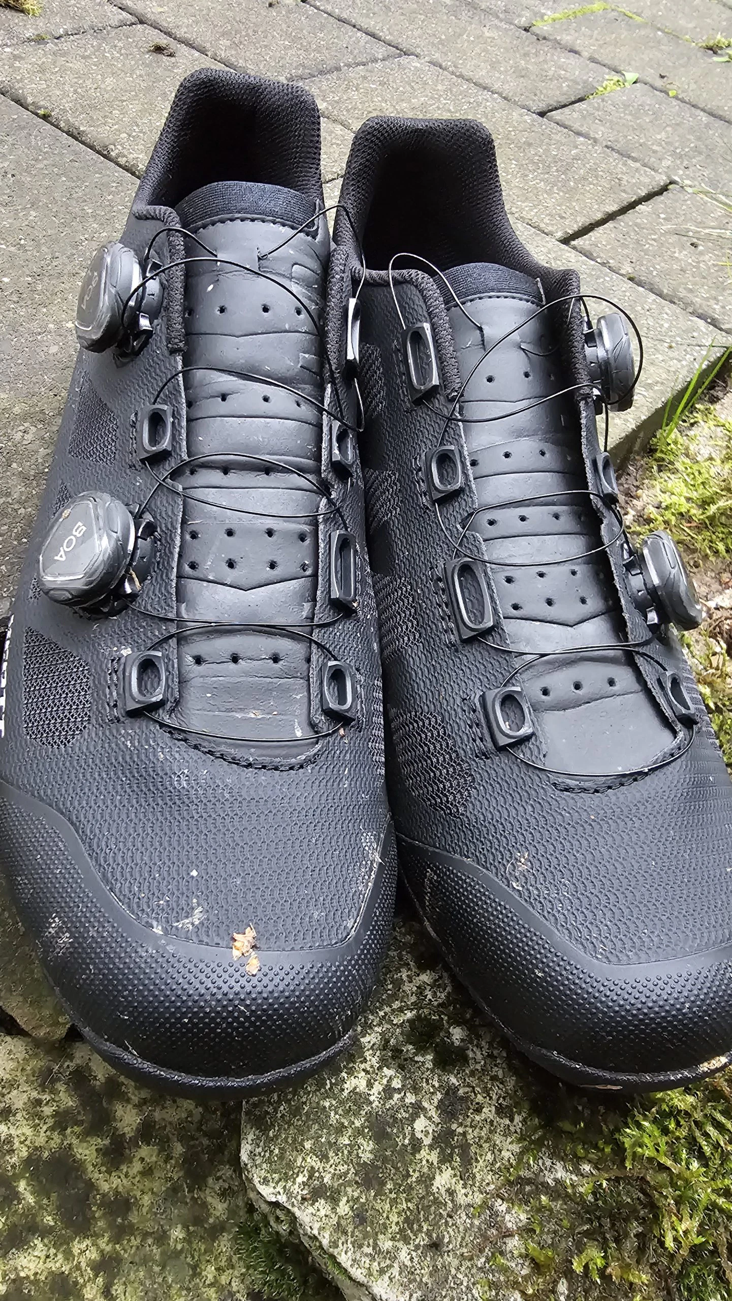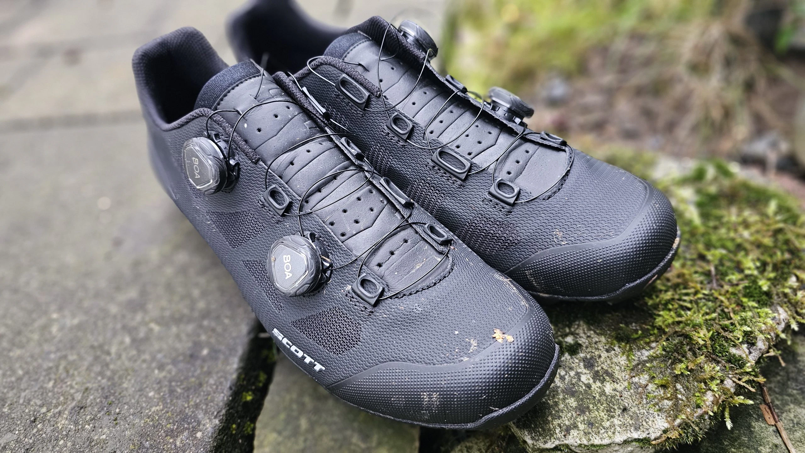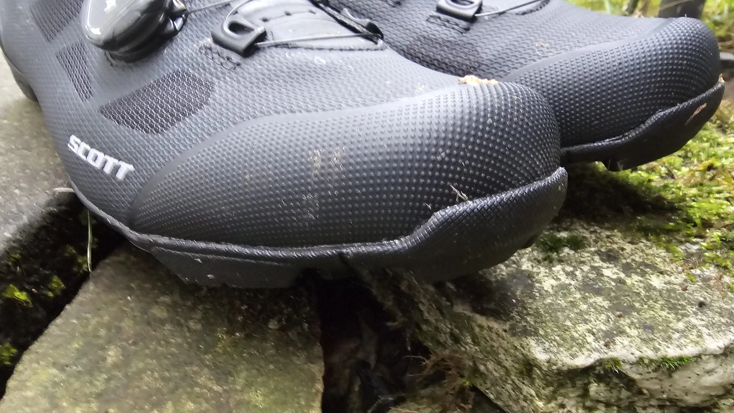 Schon beim Auspacken macht der SCOTT MTB Vertec einen sehr hochwertigen Eindruck. Die komplett schwarze Optik verleiht dem Schuh ein edles, unaufdringliches Design, das sowohl sportlich als auch clean wirkt. Besonders auffällig: das doppelte BOA®-System, das sofort den Anspruch an Präzision und Kontrolle unterstreicht. Die Materialien fühlen sich robust und gleichzeitig angenehm an – keine harten Kanten, keine sichtbaren Verarbeitungsmängel. Nähte und Übergänge sind sauber verarbeitet, das Obermaterial wirkt langlebig und funktional. Insgesamt vermittelt der Schuh schon auf den ersten Blick, dass er für harte Einsätze gebaut ist.