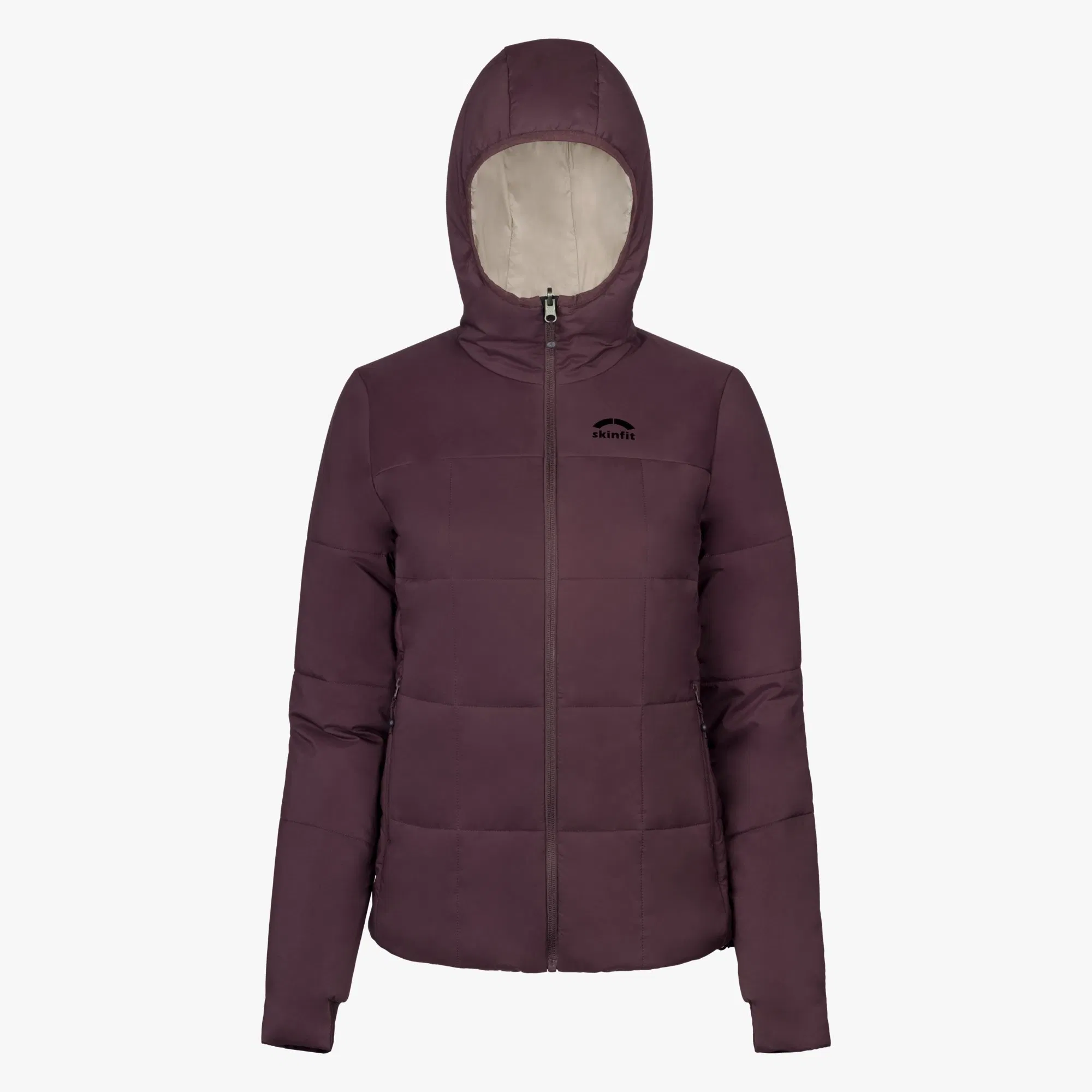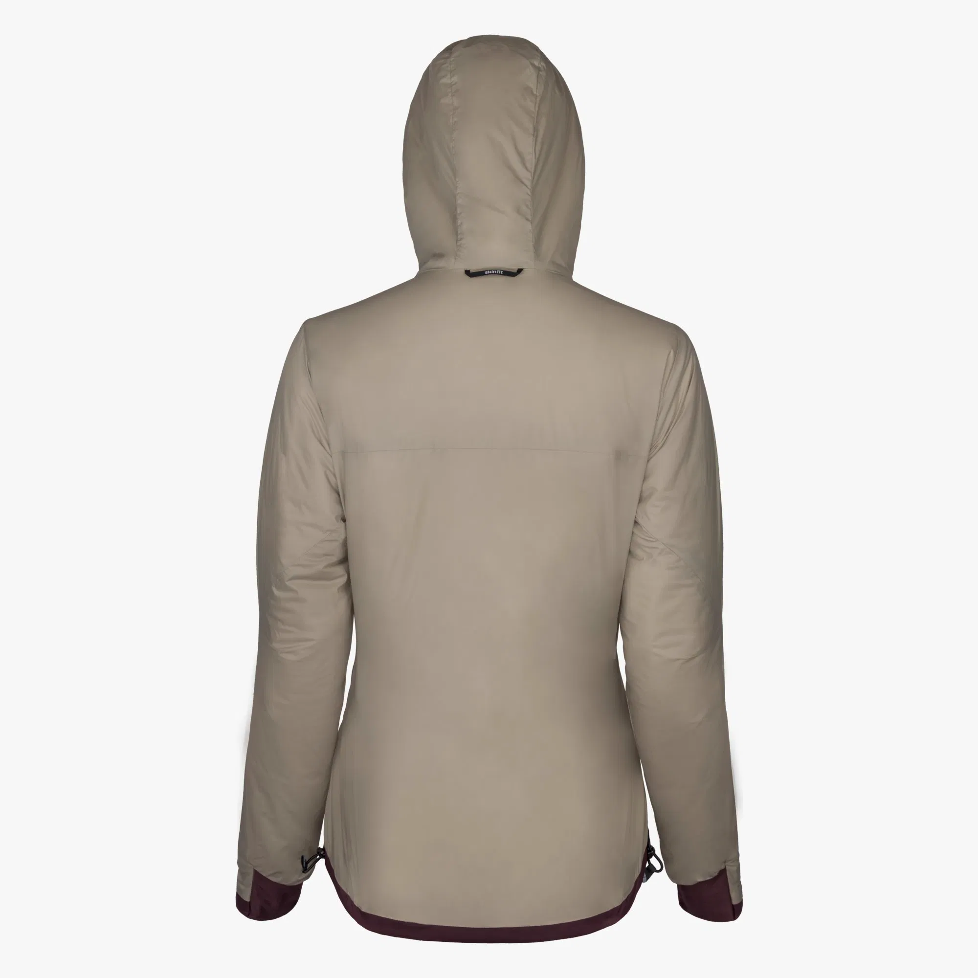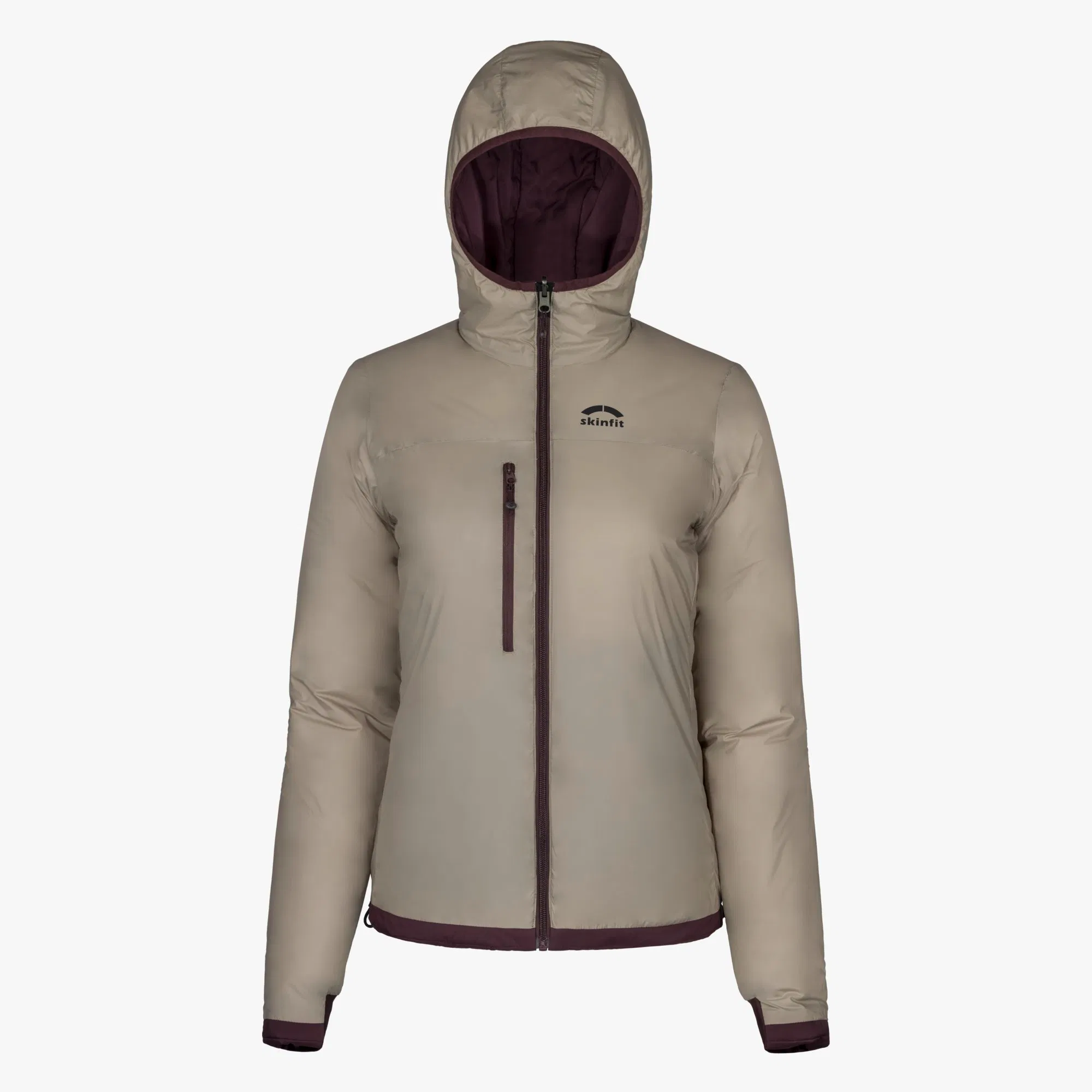 Diese Isolationsjacke von Skinfit ist als Damenmodell in vier verschiedenen Farbvarianten verfügbar. Lena erhält die Jacke in der Farbe „crysanthem“, einem dunklen rubinrot. Als erstes nützliches Feature entdeckt Lena, dass sie mit dieser Jacke gleich zwei verschiedene Looks tragen kann, denn die Clariden Jacke hat eine Wendefunktion. Die Jacke lässt sich damit ganz einfach auf die Farbe Beige wenden. Die weiteren Farben der Damenmodelle, ebenfalls mit praktischer Wendefunktion, sind Schwarz, Senfgelb und Dunkellila (viola). Das Herrenmodell bietet mit den Farben Schwarz, Senfgelb, Dunkelblau und Ocean auch jeweils einen zweiten Look dank Wendefunktion. Das Skinfit Logo ist dezent auf der linken Brust angebracht. Was Lena beim ersten Anprobieren direkt positiv auffällt sind die sehr weichen Innenseiten der Ärmelbündchen, die an der Handfläche für ein tolles Gefühl sorgen. Die Hauptseite scheint etwas robuster gestaltet und ist demnach etwas rauer. Die Qualität erscheint auf den ersten Blick hochwertig, alle Nähte sind sauber verarbeitet und sämtliche Reißverschlüsse lassen sich problemlos öffnen und schließen.