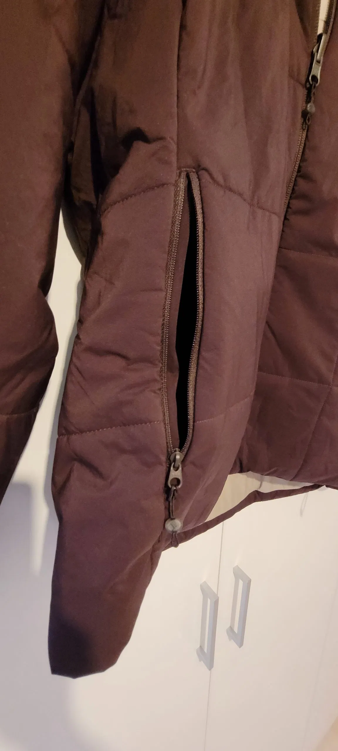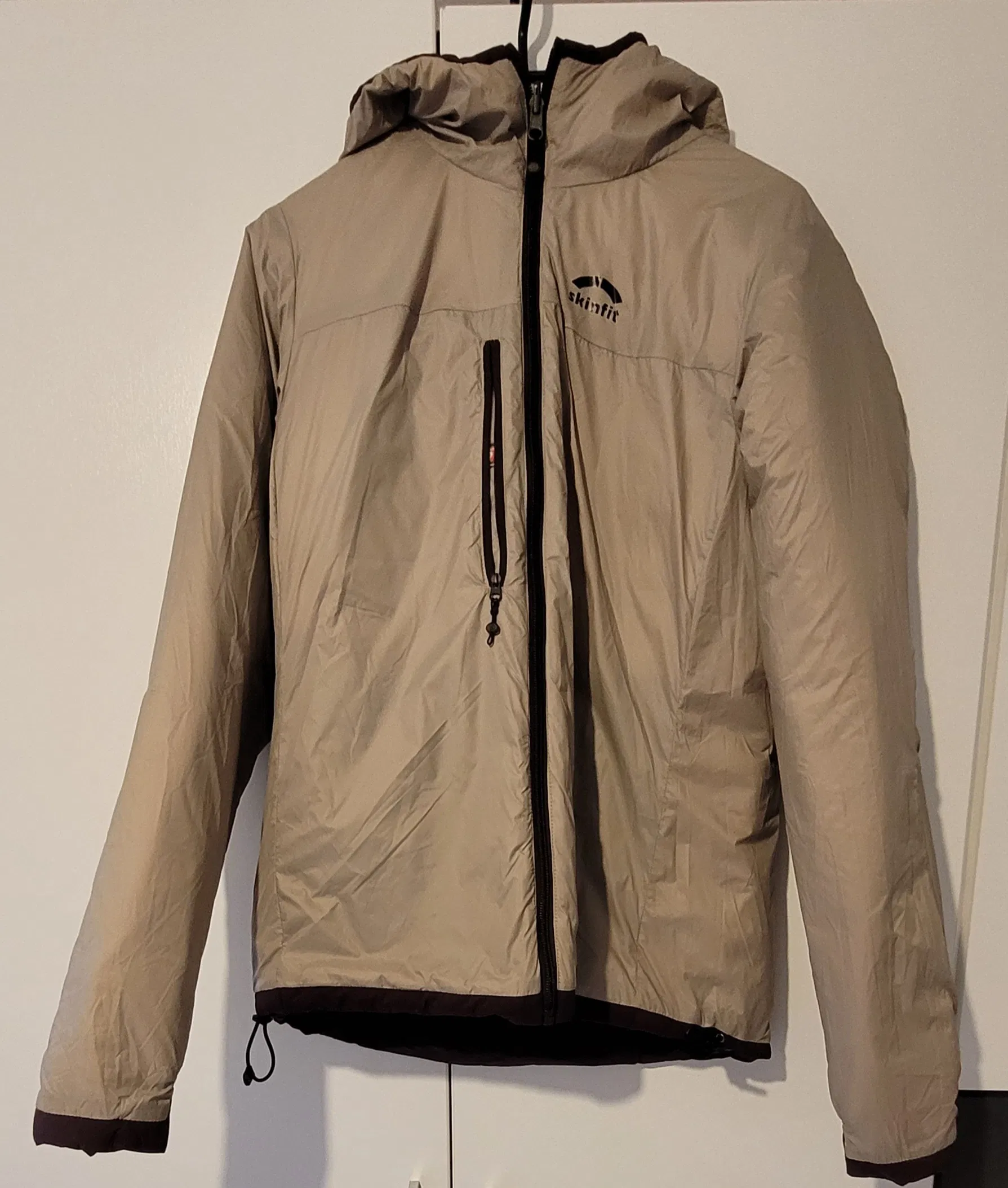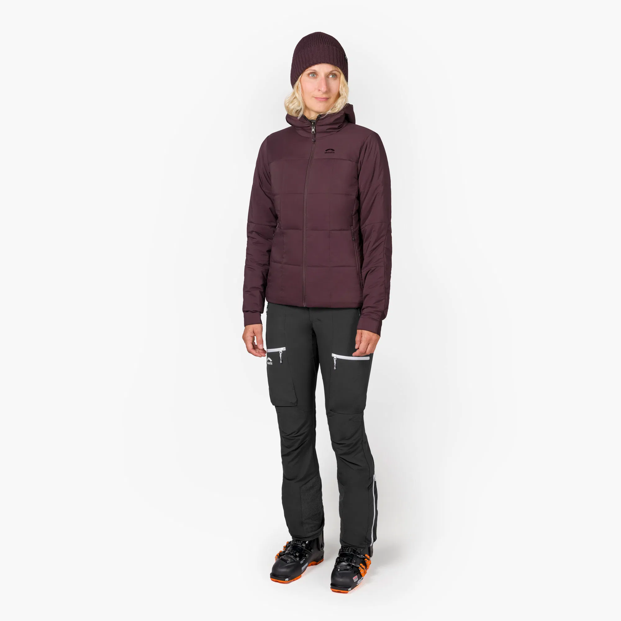 Diese Isolationsjacke von Skinfit ist als Damenmodell in vier verschiedenen Farbvarianten verfügbar. Lena erhält die Jacke in der Farbe „crysanthem“, einem dunklen rubinrot. Als erstes nützliches Feature entdeckt Lena, dass sie mit dieser Jacke gleich zwei verschiedene Looks tragen kann, denn die Clariden Jacke hat eine Wendefunktion. Die Jacke lässt sich damit ganz einfach auf die Farbe Beige wenden. Die weiteren Farben der Damenmodelle, ebenfalls mit praktischer Wendefunktion, sind Schwarz, Senfgelb und Dunkellila (viola). Das Herrenmodell bietet mit den Farben Schwarz, Senfgelb, Dunkelblau und Ocean auch jeweils einen zweiten Look dank Wendefunktion. Das Skinfit Logo ist dezent auf der linken Brust angebracht. Was Lena beim ersten Anprobieren direkt positiv auffällt sind die sehr weichen Innenseiten der Ärmelbündchen, die an der Handfläche für ein tolles Gefühl sorgen. Die Hauptseite scheint etwas robuster gestaltet und ist demnach etwas rauer. Die Qualität erscheint auf den ersten Blick hochwertig, alle Nähte sind sauber verarbeitet und sämtliche Reißverschlüsse lassen sich problemlos öffnen und schließen.