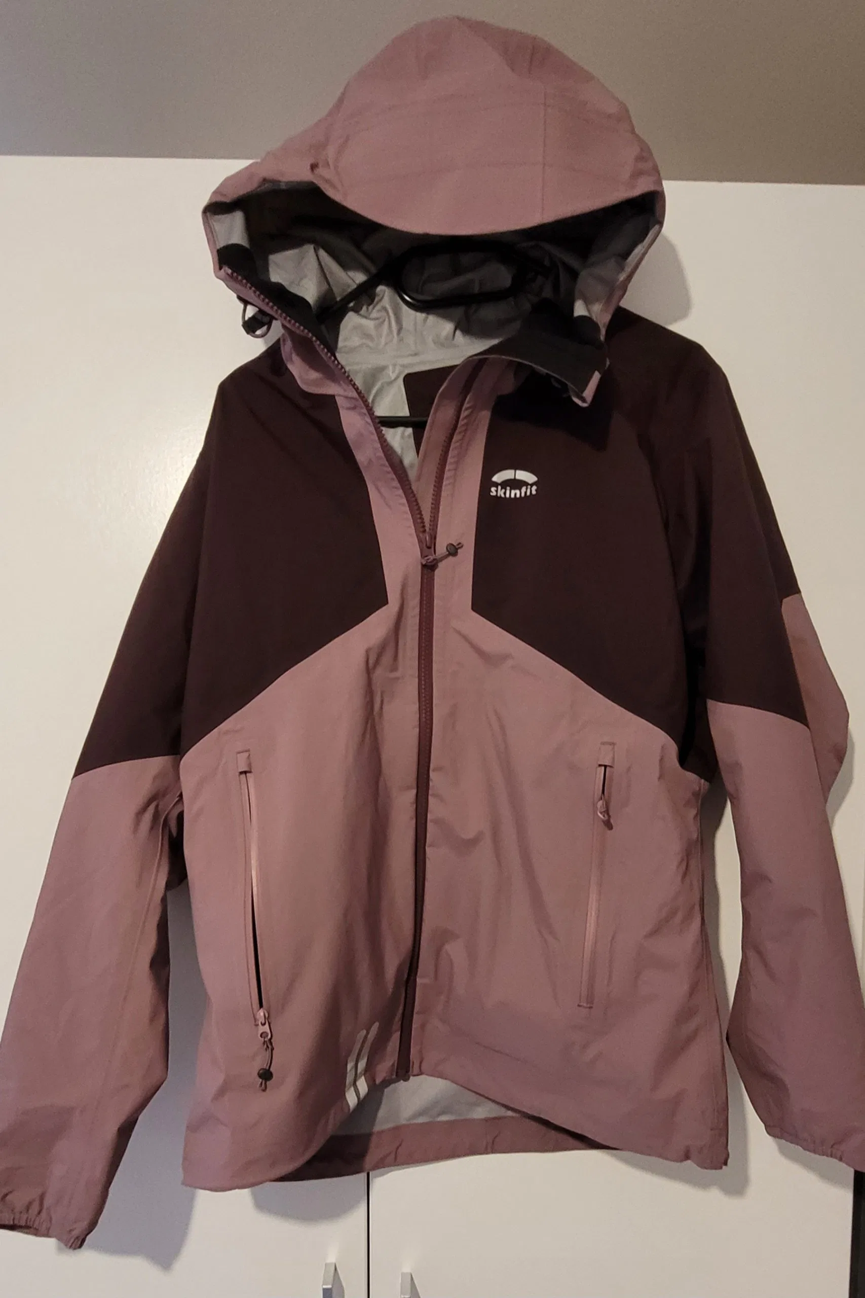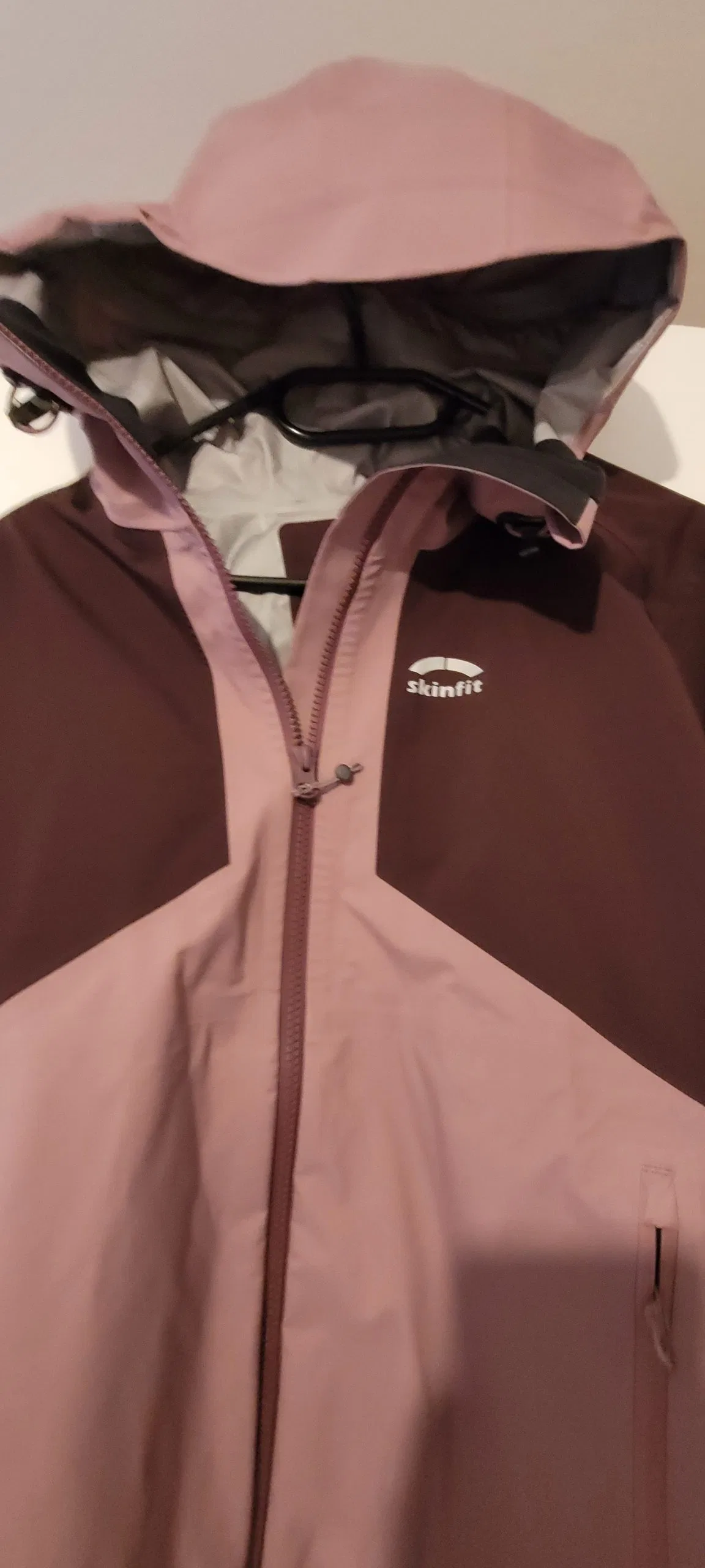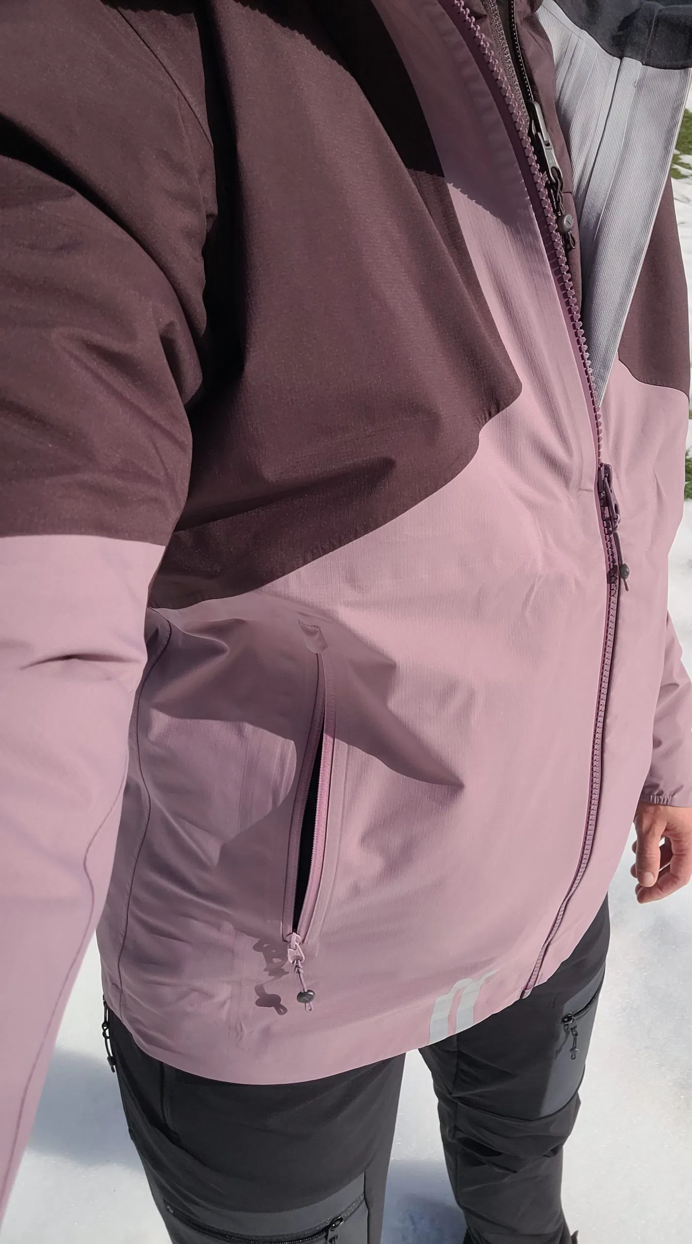 Die Damenvariante der Vermunt Hardshell Jacke kommt in der Farbe „Summersweet“ zur Testerin. Diese ist eine Kombination aus einem hellen und dunkleren Lila. Lena gefällt dieses Farbmodell sehr gut und sie lässt sich auch gut mit vielen anderen Farben kombinieren. Die Herrenvariante der Jacke, auch als Unisex Modell geeignet, bietet Skinfit dagegen in vier Farbvarianten an. Zur Auswahl stehen eine Kombination aus Dunkelgrün und Schwarz oder Schwarz, Sand und Senffarben. Das Skinfit-Logo ist gut sichtbar, aber dennoch dezent auf der linken Brust aufgedruckt. Dieser Aufdruck fungiert zugleich als Reflektor. Zudem sind am rechten Jackenrand vorne und an der Rückseite am linken Jackenrand jeweils weitere Reflektordrucke angebracht. Die Jacke ist mit zwei seitlichen Taschen ausgestattet, die sich mittels Reißverschluss gut verschließen lassen und relativ viel Platz bieten. Die Hardshell Jacke macht einen sehr hochwertigen Eindruck und alle Nähte scheinen sehr gut verarbeitet.