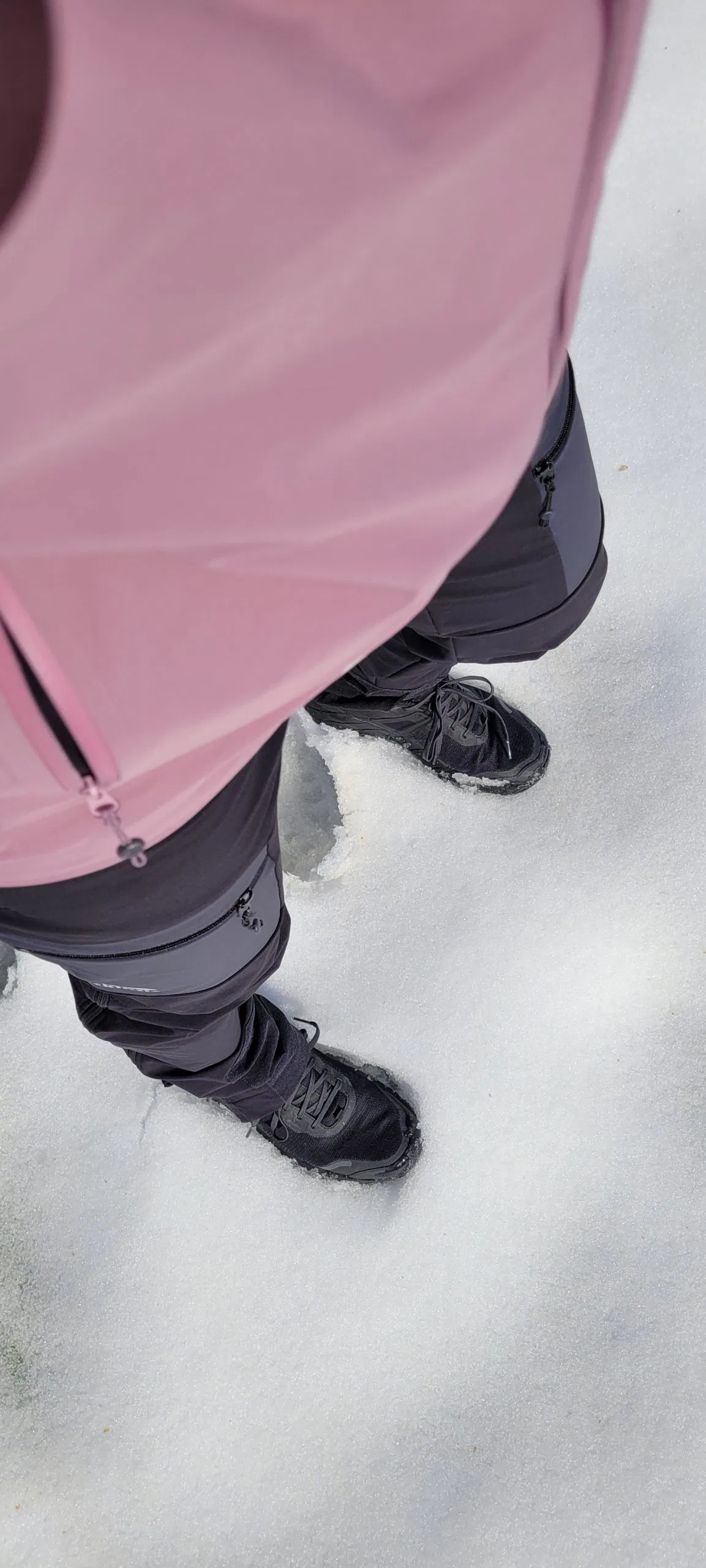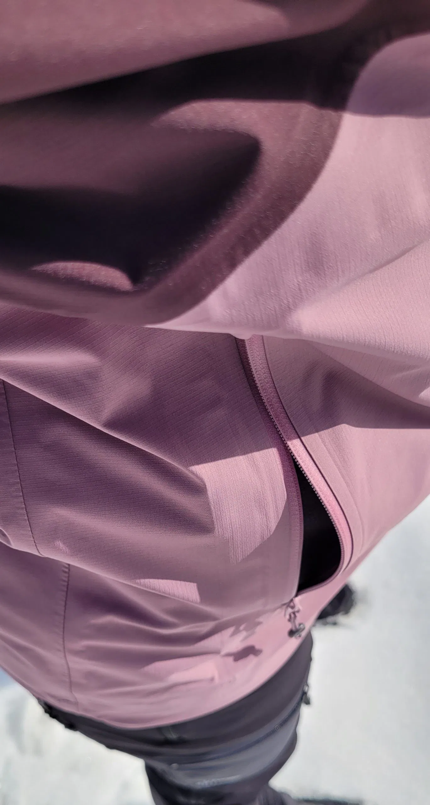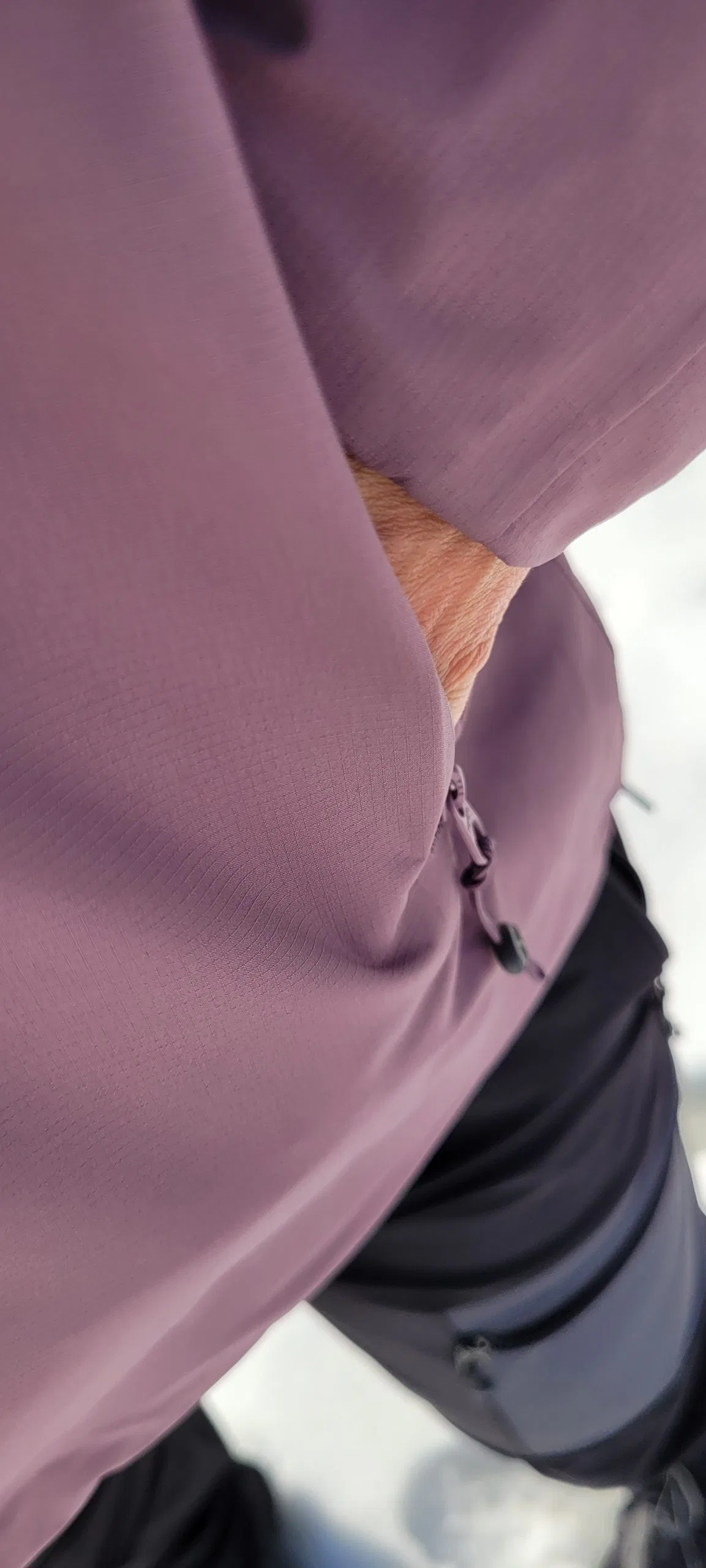 Die Vermunt Hardshell Jacke von Skinfit wird in der Größe M geliefert. Die Jacke fällt normal aus und passt Lena daher sehr gut. Das Damenmodell der Jacke ist an sich etwas schmal und feminin geschnitten. Mit Größe M hat Lena dennoch ausreichend Spielraum, um mehrere Schichten darunter zu tragen und die Hardshell-Jacke mit einer Daunenjacke zu kombinieren. Möchte man die Jacke enger tragen, so lässt sie sich durch die integrierte Kordel am Bund auf den gewünschten Tragekomfort anpassen. So ist man zusätzlich gut vor eindringender Kälte geschützt. Sehr angenehm empfindet Lena auch, dass die Jacke an der Rückseite etwas länger geschnitten ist und auch über den Po ragt. Außerdem sind die Ärmelbündchen mit einem Gummizug versehen, sodass sich die Jacke auch bequem über bereits angezogene Handschuhe ziehen lässt. Schließt man den Reißverschluss der Jacke vollständig, ragt der Kragen der Jacke bis über das Kinn. Da die Innenseite der Jacke im Bereich des Kinns jedoch mit einem sehr weichen Fleece versehen ist, kommt es zu keiner Zeit zu Scheuerstellen – das erhöht den Tragekomfort zusätzlich. Der Stehkragen und die Kapuze lassen sich ebenfalls mithilfe eines integrierten Kordelzugs anpassen. Das weiche und elastische Funktionsmaterial der Jacke sorgt für ein sehr angenehmes Tragegefühl, sogar direkt auf der Haut.