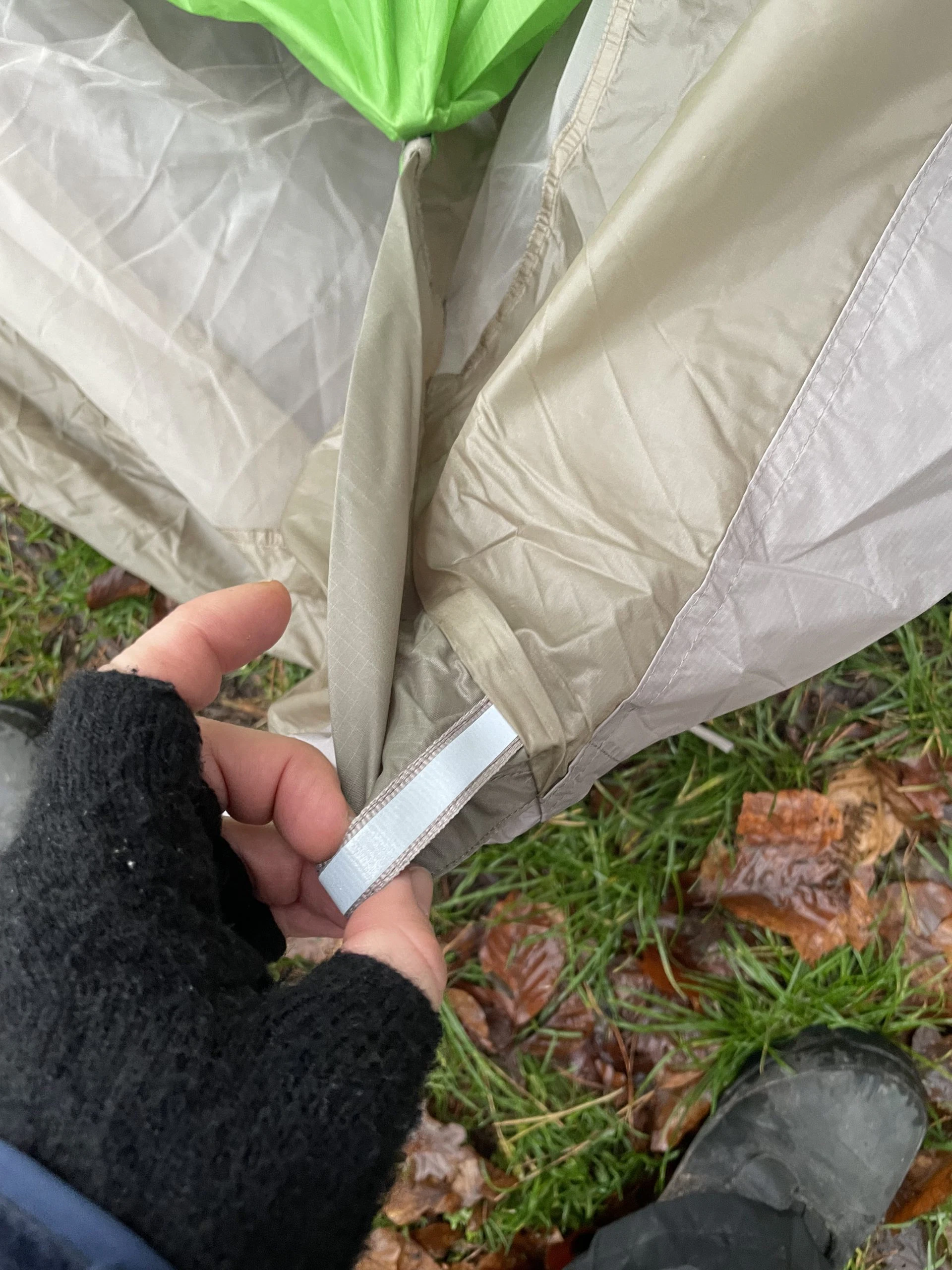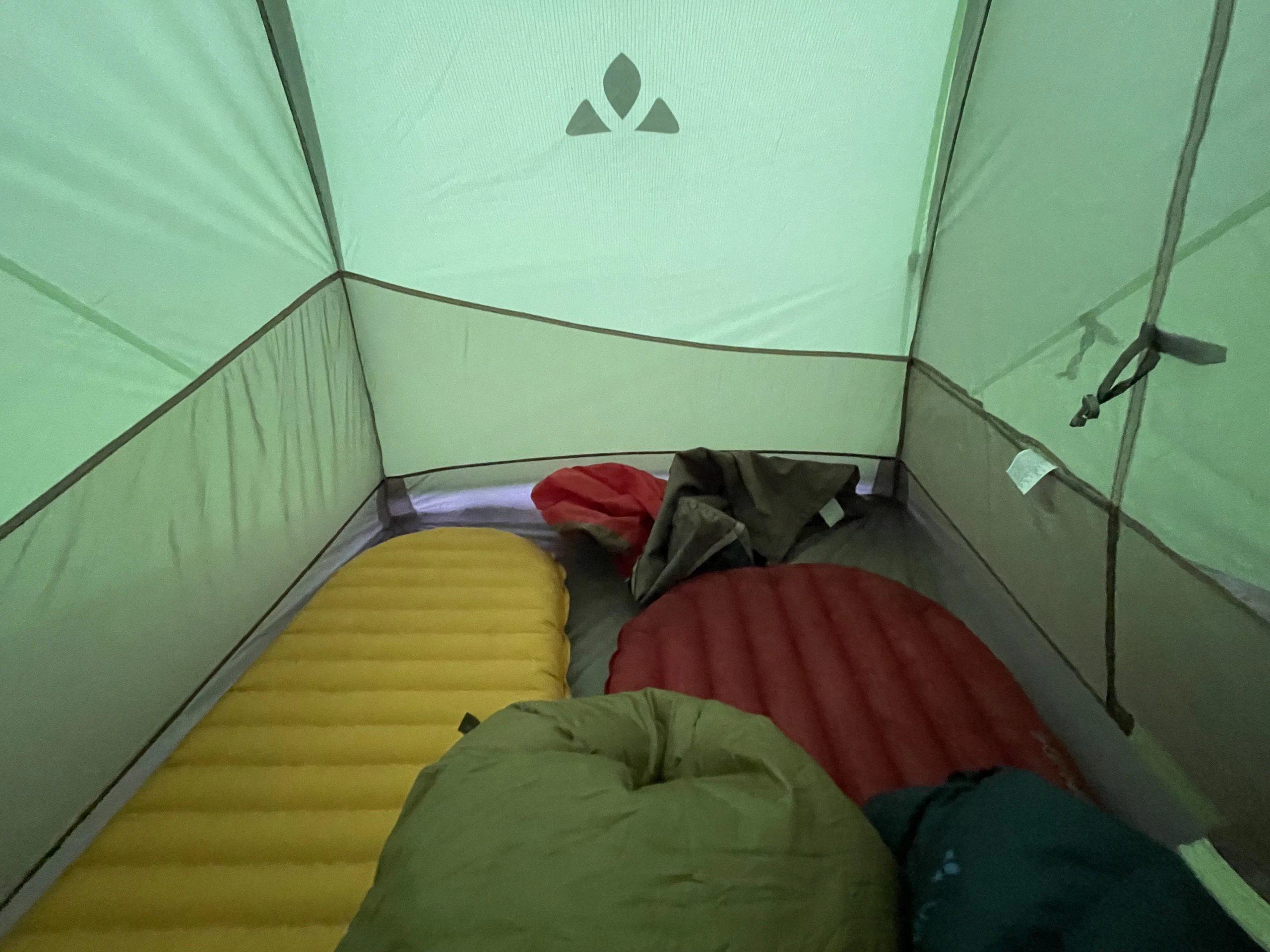 Der Transport des Vaude Space Seamless 1-2 Personen im dazugehörigen Packsack war für Christian zunächst etwas gewöhnungsbedürftig, da die große seitliche Öffnung immer mal wieder aufging. Mit etwas Übung hat Christian dann die Tasche zuverlässig und fest verschließen können und zur Sicherheit noch ein Bändsel um die Tasche gebunden. Das Auspacken und Aufbauen des Zeltes während der Touren, ging auch bei Regen und Wind einfach und schnell – sobald die zwei langen Streben im Zelt eingeführt und eingehakt waren, mussten nur noch die Heringe eingesteckt werden, damit das Zelt stabil und verankert stand. Zu zweit ging das noch schneller als alleine. Insgesamt hat das Außenzelt in Sachen Regenfestigkeit einen super Job gemacht. Der Schnitt des Zeltes sowie die “Regenrinne” am Zelteingang hat abtropfendes Wasser beim Ein- und Aussteigen draußen gehalten und die Lüftung am Giebel war auch bei schräg fallendem Regen geschützt.