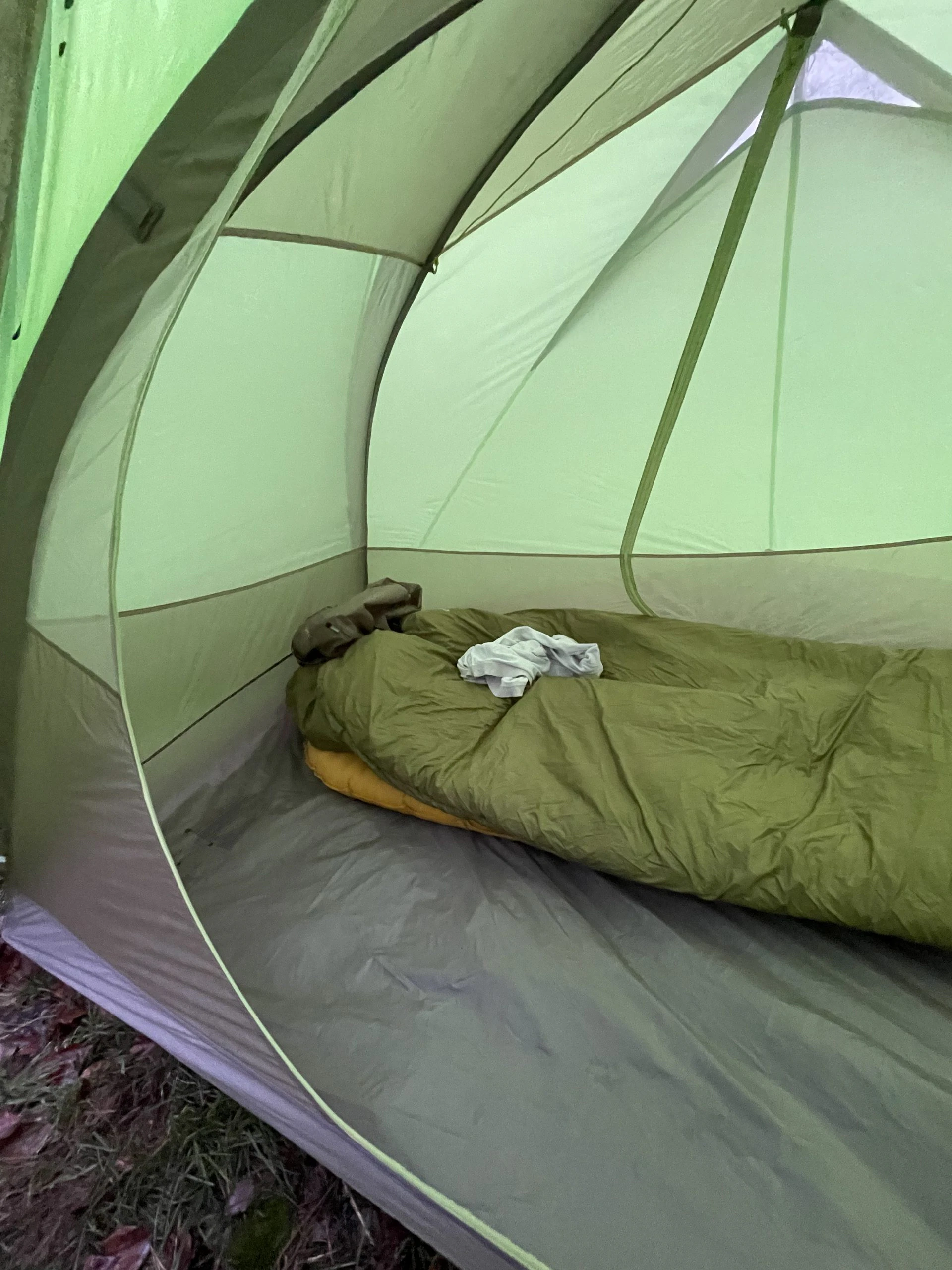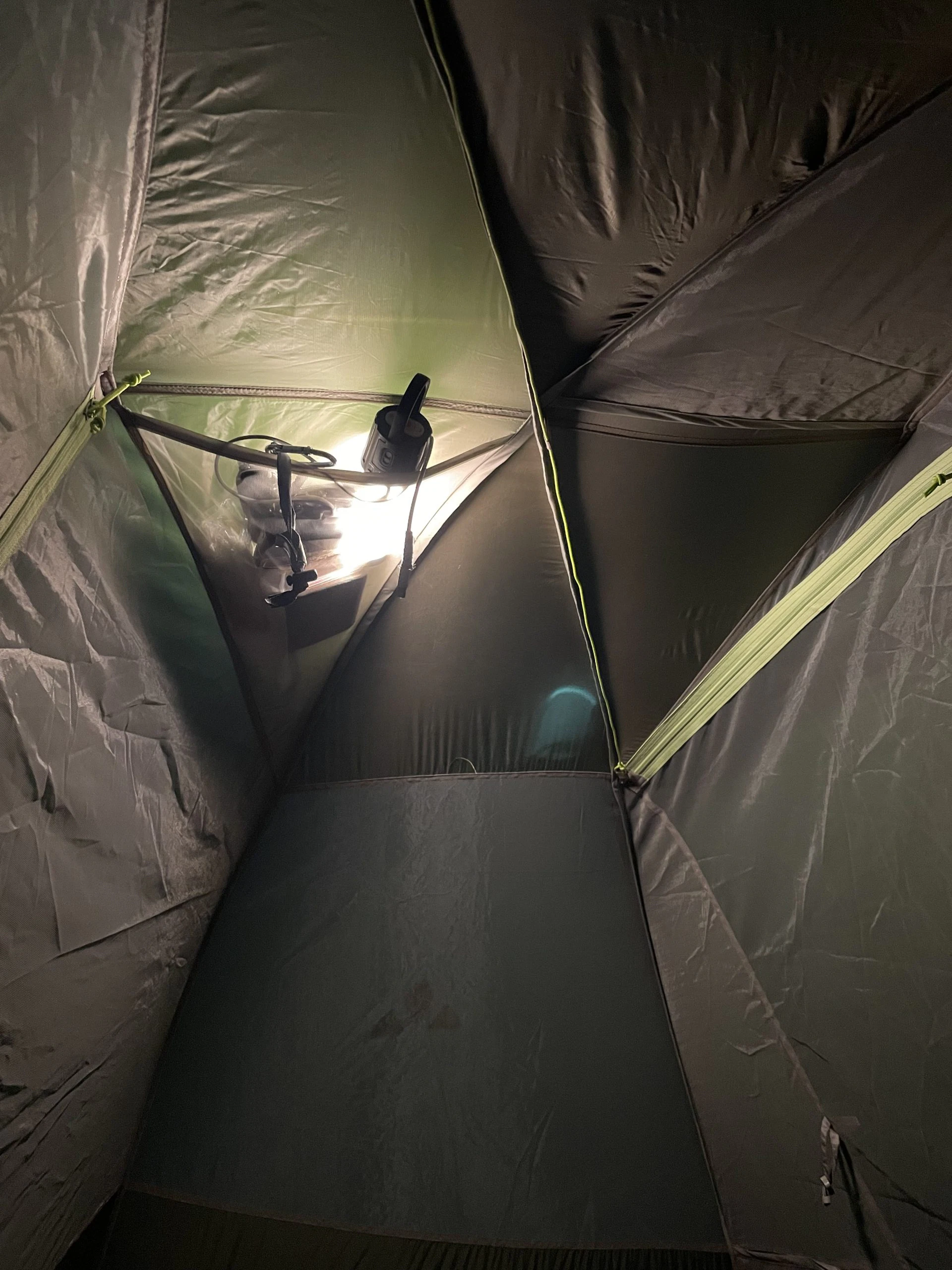 Vom Inneren des Zeltes war Christian begeistert. Das Space Seamless bietet ausreichend viele Verstaumöglichkeiten für zwei Personen, sowohl über dem Kopf als auch an den Seiten. Hier haben die beiden Insassen Kleidung wie Mützen, Handschuhe sowie Verpflegung untergebracht. Zudem hängt eine vormontierte Leine quer durchs Zelt, an der Christian nachts seine Lampe aufgehängt hat.