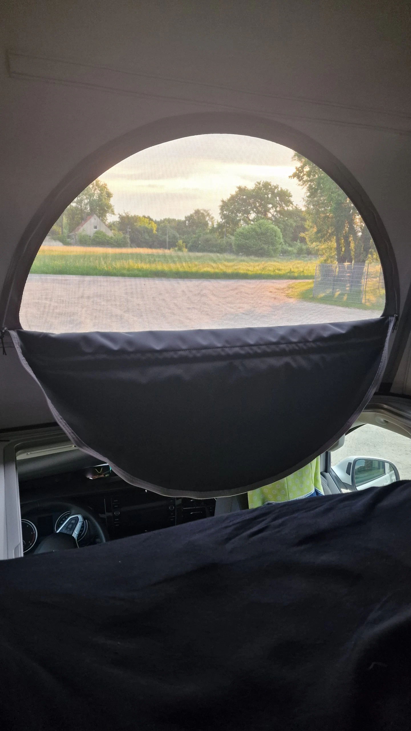 Schlafgelegenheiten gibt es im Bulli für 4 Personen, zwei unten und zwei im Dachbett. Da Björn unbedingt im Dachbett schlafen wollte, ließ er die Matratze für den unteren Bereich direkt beim Volkswagen Autohaus in Limburg. Schon voller Vorfreude ging es zuhause zum ersten Probeliegen. Also wurde ein Stellplatz gesucht, darauf geachtet, dass über dem Bulli ausreichend Platz ist, und dann über das Bedienelement, das Dach geöffnet. Zur Sicherheit fragt der Bulli hier immer nochmal nach, ob wirklich ausreichend Platz vorhanden ist. Dann muss man den Knopf gedrückt halten, bis das Dach vollständig geöffnet ist. Dies wird einem auch im Display angezeigt. Nun stellt sich die Frage, wie man am besten hoch in den Schlafbereich kommt. Für Björn mit seinen 2 Metern kein Problem, kleine Personen müssen hier einfach etwas mehr klettern. Man muss nur darauf achten, dass man nicht auf die Armlehne steigt, denn dafür sind diese nicht ausgelegt. Oben angekommen, lachte einem dann das Bett mit den Maßen 1,20 m × 2,00 m entgegen. Unter der Matratze entdeckten wir dann auch gleich die Federteller, die wir aus dem Caddy California kennen und auf diesen schlafen wir immer sehr gut. Zur Belüftung lassen sich in der Stoffwandung 3 halbrunde Fenster, die mit Moskitonetzen versehen sind, öffnen. Exklusiv beim Modell Ocean lässt sich zudem die gesamte Front öffnen. So lässt sich der Blick vom Bett aus perfekt genießen.