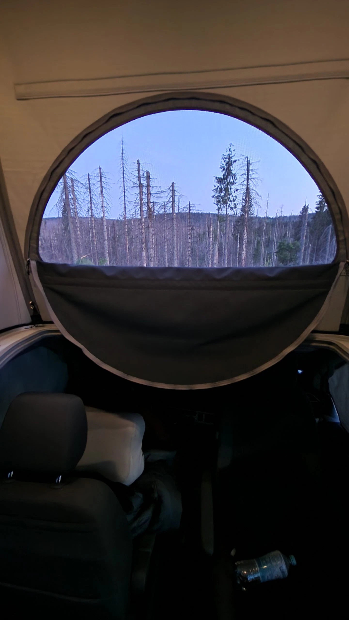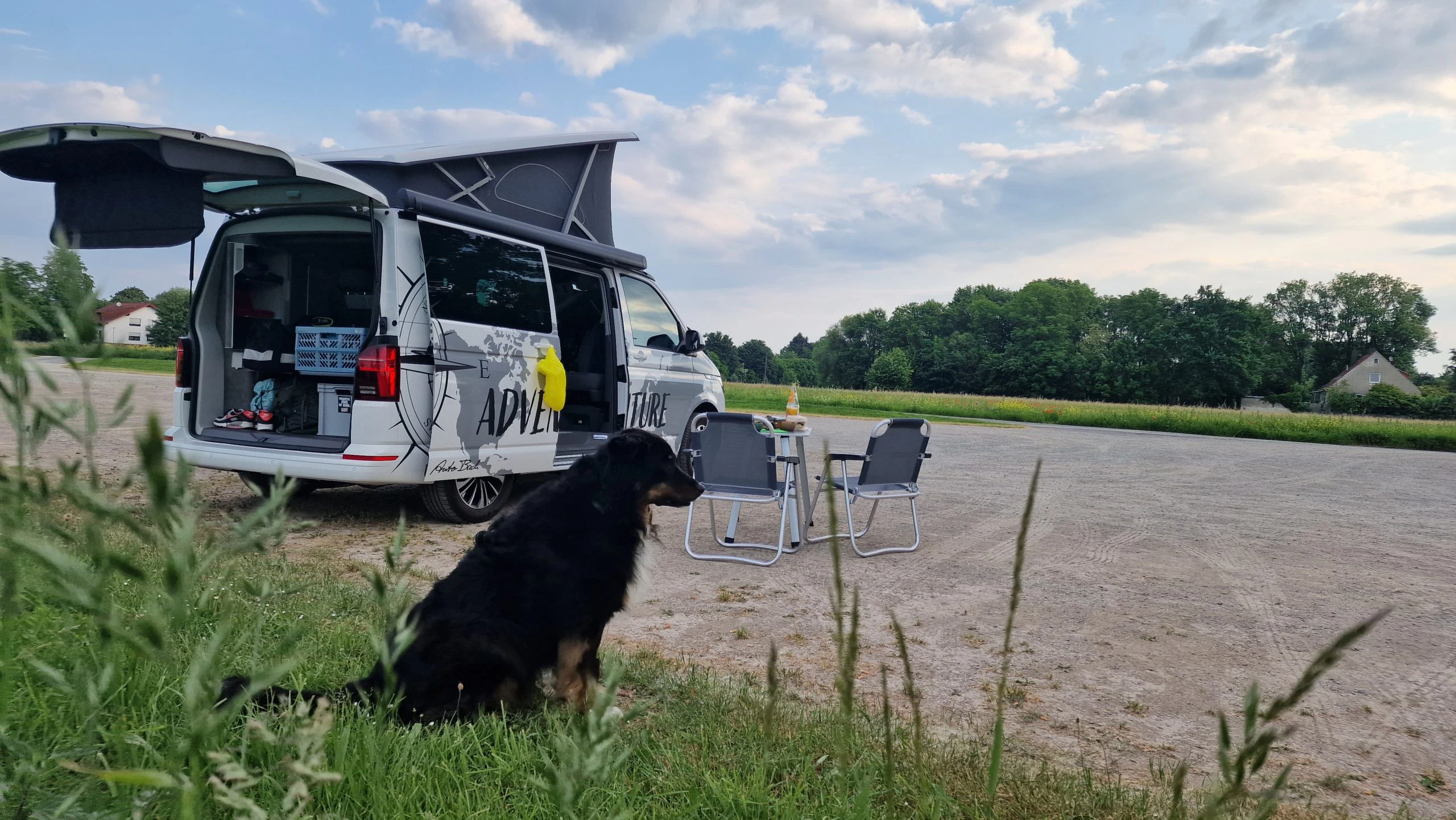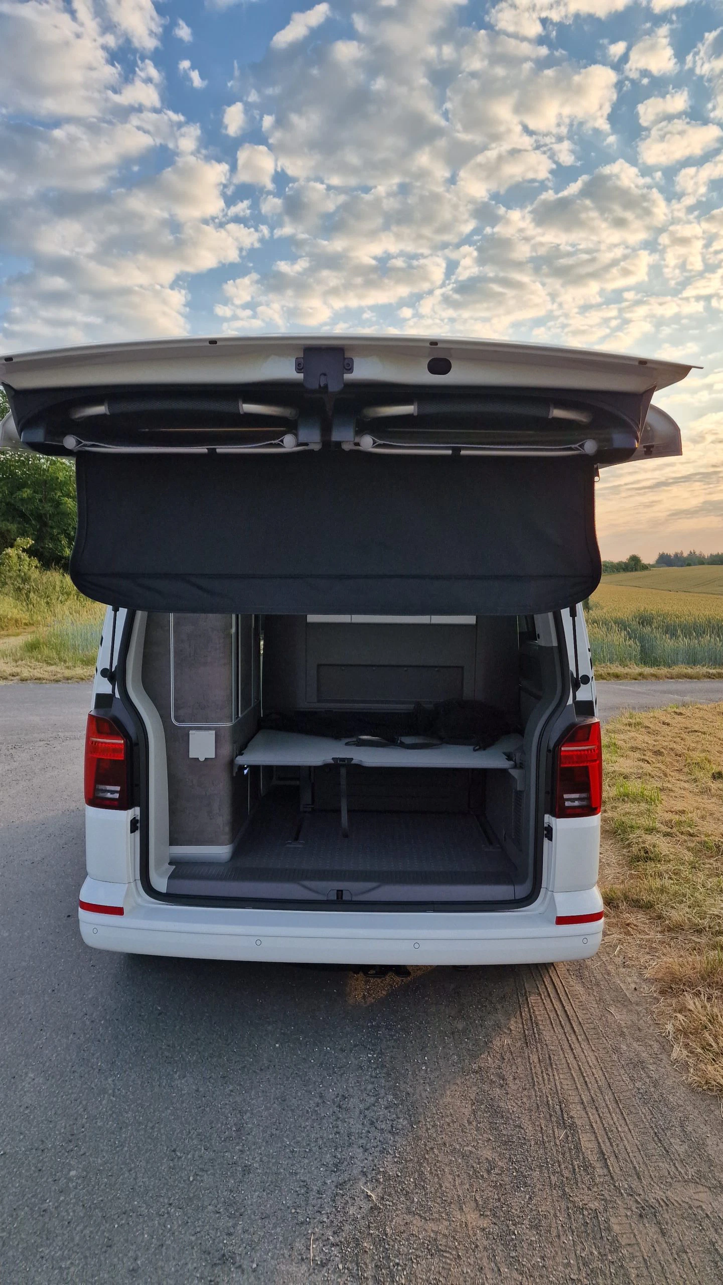 Voller Vorfreude ging es dann auf dem Weg in den Harz an einem Stellplatz bei Kassel in die erste Nacht. Auch ohne viel Übung und Routine, war das Bett schnell eingerichtet und konnte auch bezogen werden. Im Dachbett kam dann sofort das Zelt Feeling auf, ganz anders als wenn man im Auto schläft. Die Größe war für Björn in Ordnung, hätte aber gerne ein paar Zentimeter länger sein dürfen. Björn schlief die erste Nacht komplett durch und wurde erst am nächsten Morgen durch die Sonnenstrahlen geweckt. Nugget schlief ebenfalls durch, allerdings unten im geräumigen Mittelteil des Bullis. Am Morgen gab es dann erstmal einen Kaffee ans Bett mit Blick auf die gegenüberliegende Wiese. Lässt man die Beine durch die Aufstiegsluke baumeln, kann man auch bequem im Dachbett sitzen. In der Nacht lag die Außentemperatur bei ca. 10 Grad. Durch den Zeltstoff war für Björn nur eine Decke nötig. Benötigt man nachts Licht, ist dafür im Dachbett natürlich gesorgt und auch eine USB Ladebuchse ist vorhanden.