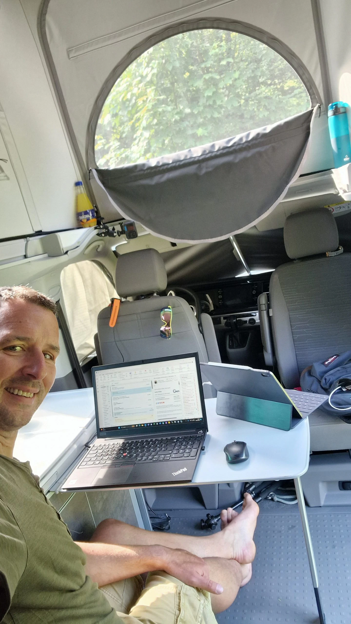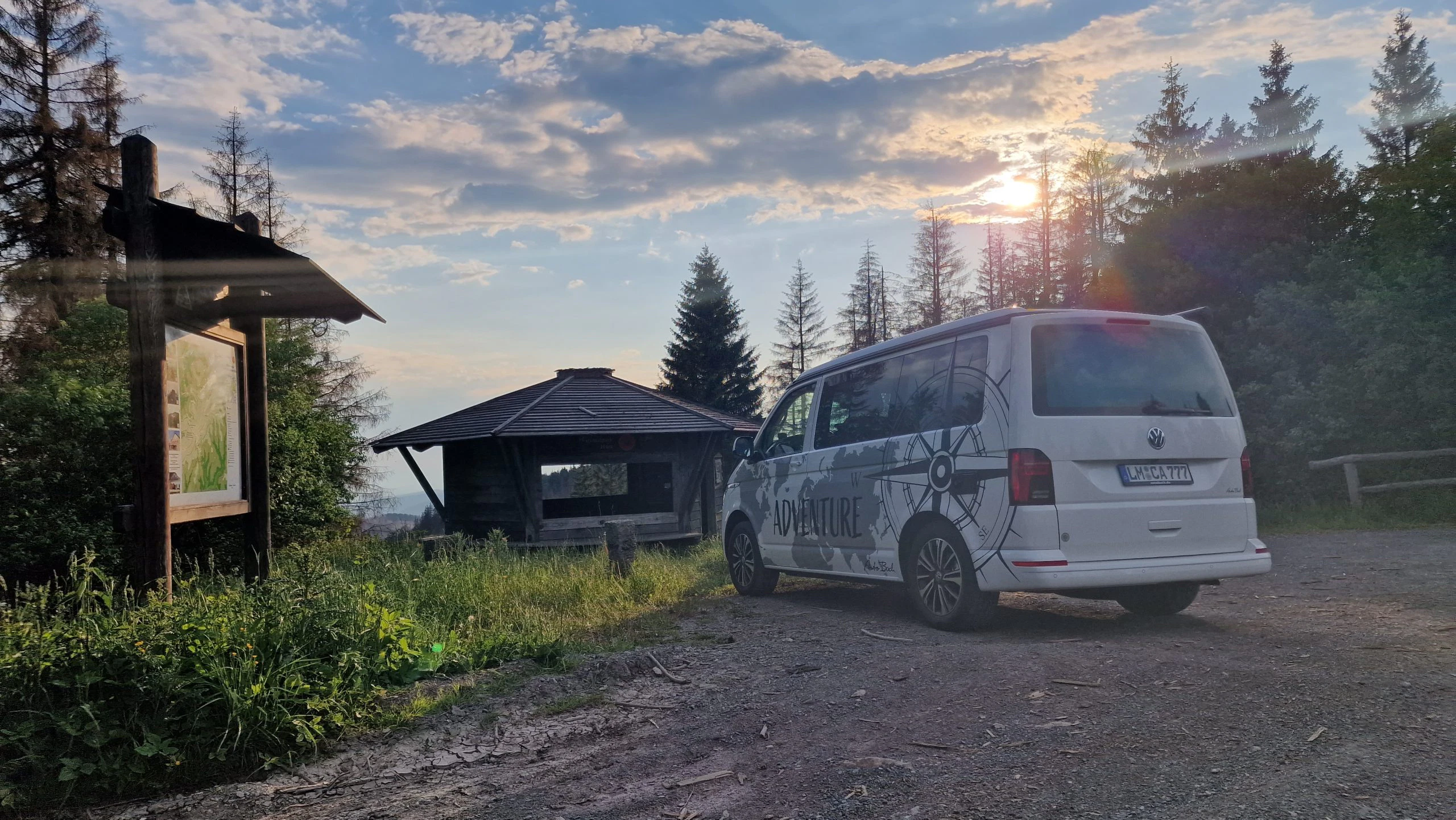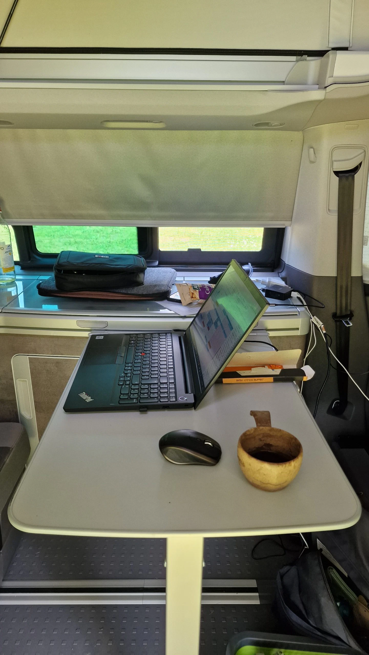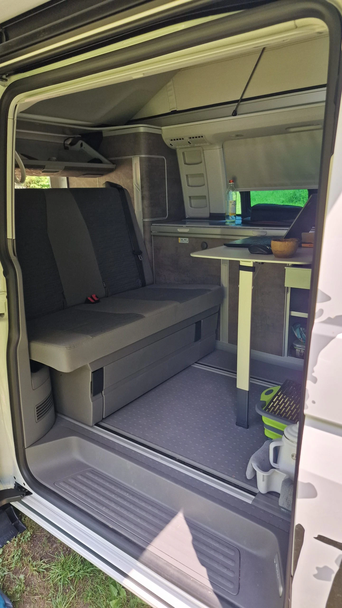 Björn wollte unbedingt wissen wie es ist von unterwegs zu arbeiten, also nutzte er den Brückentag bei seinem Roadtrip im mobilen Homeoffice. Eine ideale Station dafür war der Campingplatz Harz Hideaway, da es hier WLAN gab. Zum Arbeiten wurde kurzerhand das Bett nach oben geklappt, der Tisch in den Küchenblock eingehängt und der Laptop an die 230V Steckdose im Bulli angeschlossen. WLAN gab es in Form eines ausleihbaren Cubes vom Campingplatz, dieser lieferte dann zuverlässige 50Mbit. Auch wenn der Tisch im Bulli nicht den Schreibtisch im Büro ersetzte, war das Arbeiten problemlos möglich. Durch die Rollos konnte man es im Bulli sehr gut abdunkeln, so dass es sich gut arbeiten ließ. Auf der zweiten Sitzreihe konnte Björn problemlos über mehrere Stunden sitzen und arbeiten. Als Alternative bot sich noch der Beifahrersitz. Dieser war zwar etwas bequemer, dafür kommt man aber nicht an den Tisch und muss den Laptop auf den Schoß nehmen.