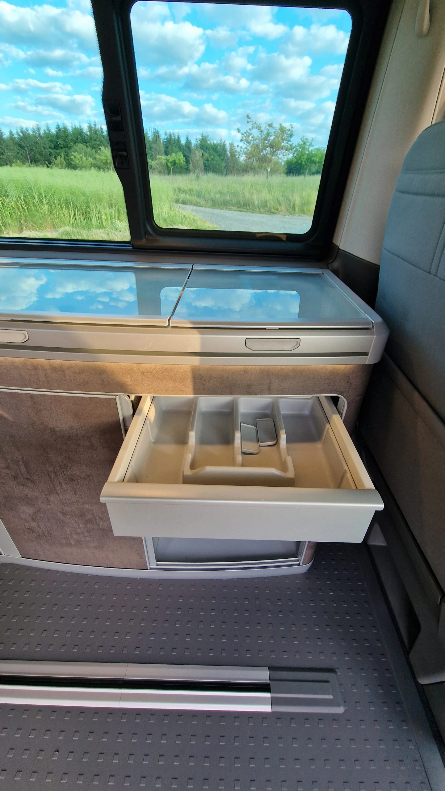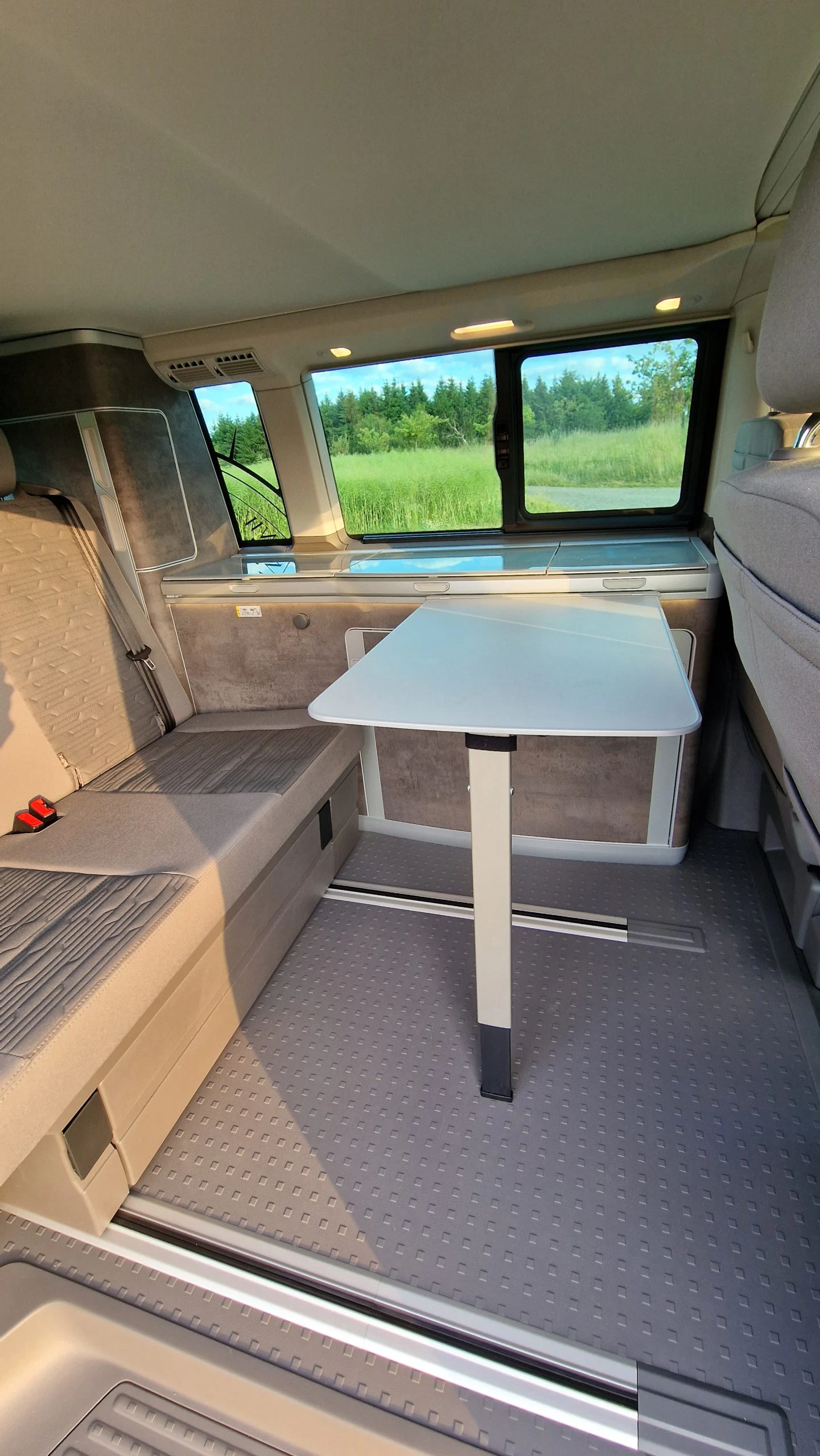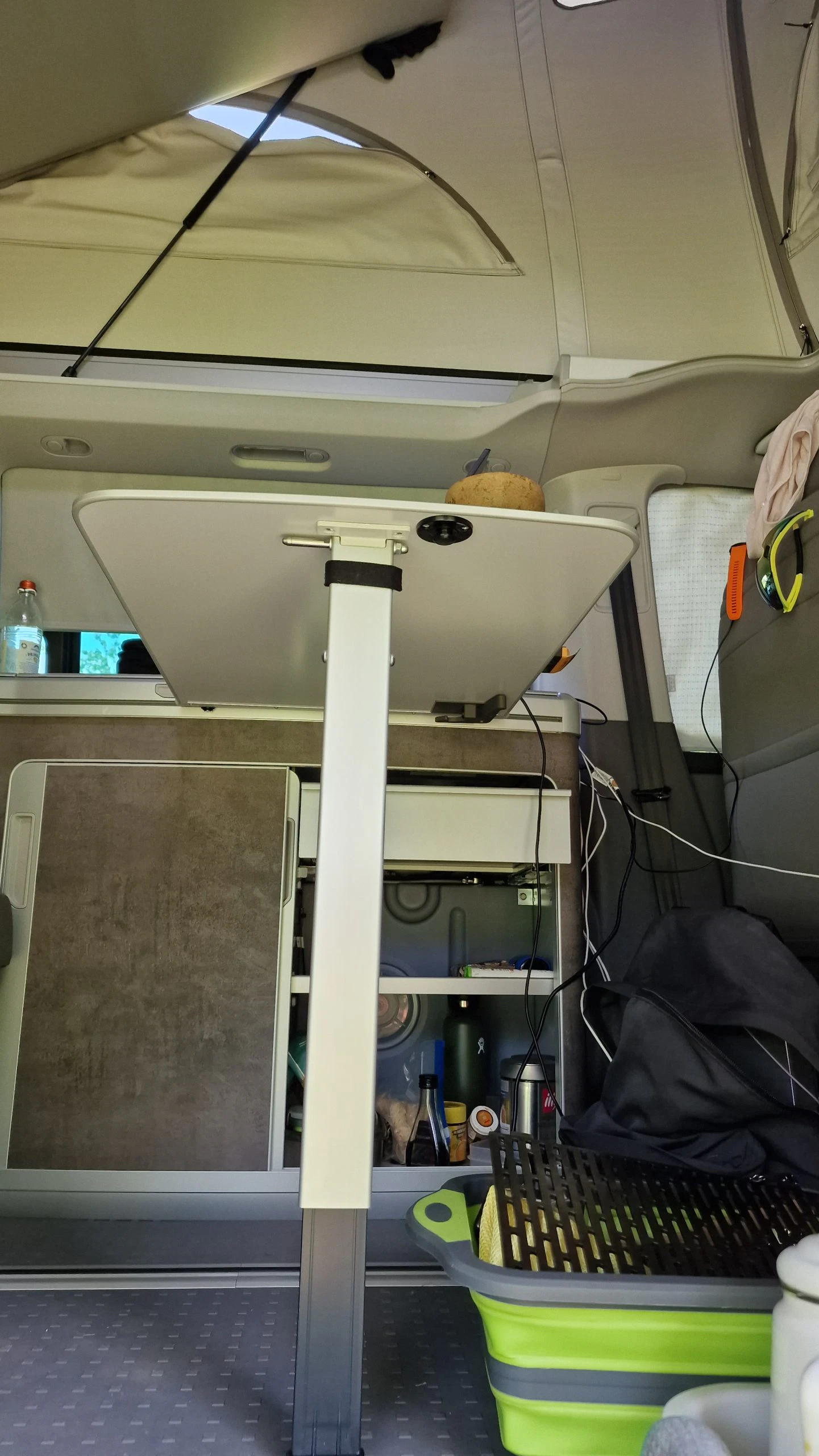 Einen weiteren Tisch gibt es im Bulli selbst. Dieser ist mit der Küchenzeile verbunden und lässt sich bei Bedarf ausklappen. An diesem Tisch kann man bequem arbeiten oder zu zweit gemütlich essen. Wird der Tisch nicht benötigt, wird er zwischen Küchenzeile und Sitzreihe verstaut.