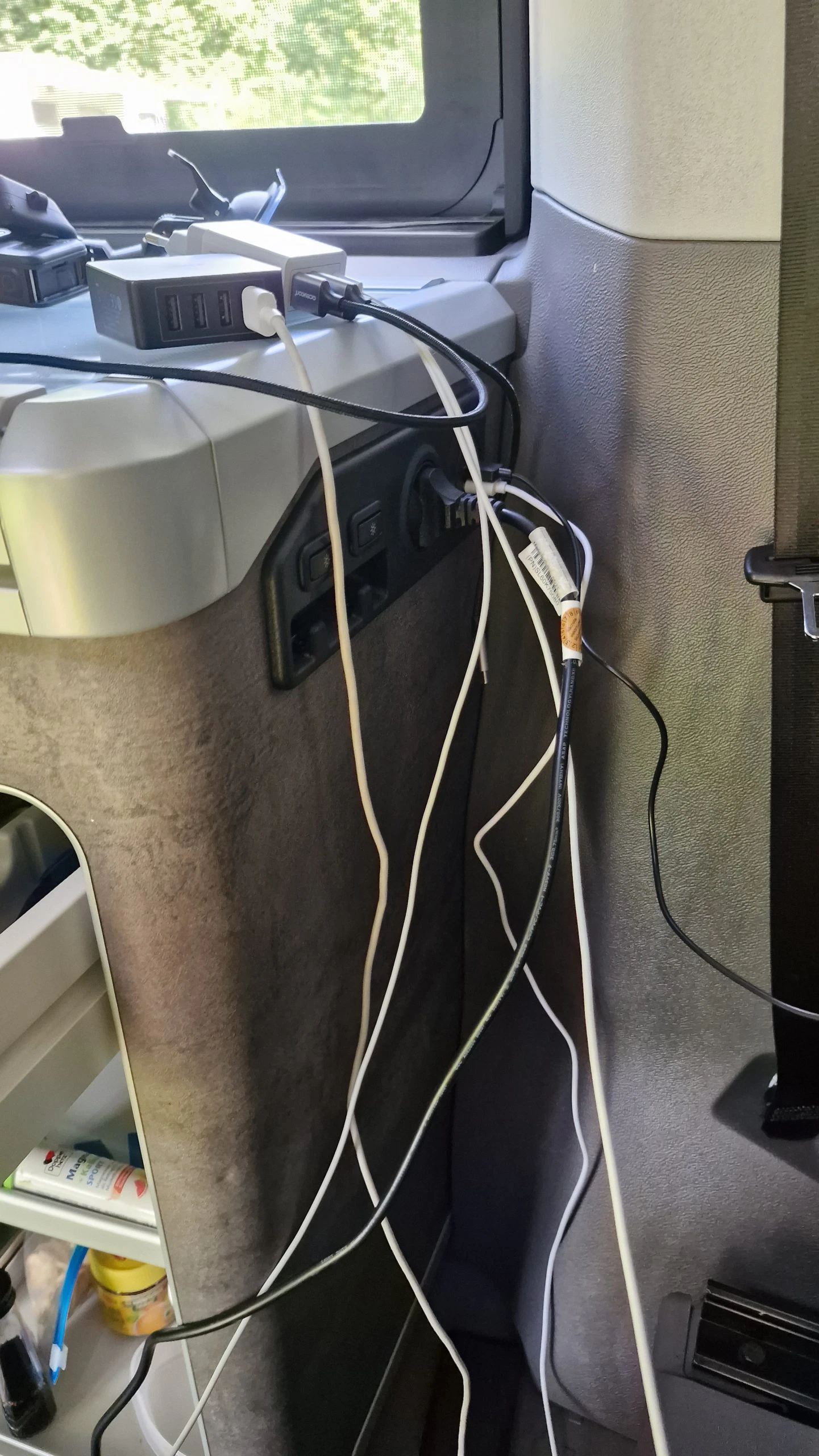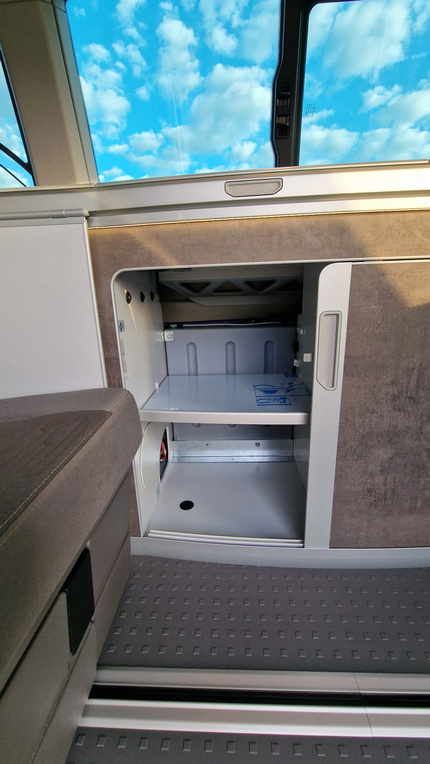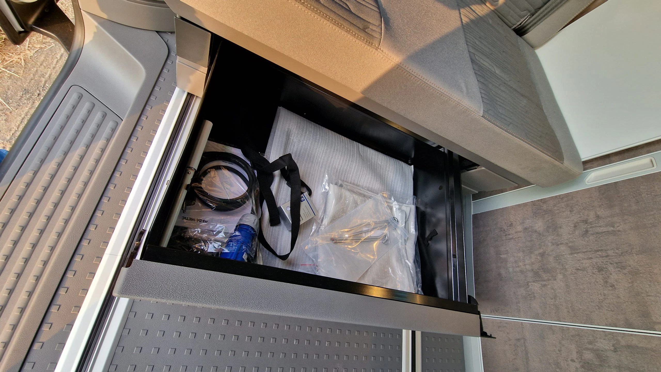 Ein weiteres großes Fach hat der Bulli unter der zweiten Sitzreihe. Hier ist standardmäßig die Kurbel für die Markise, das Fliegengitter und der Stromadapter verstaut. Björn konnte in dieser Box unter anderem den Skotti Grill, das Verlängerungskabel, Hundefutter und den Sichtschutz verstauen und damit war das Fach längst nicht voll bepackt. Die Box ist wirklich super groß und schnell zugänglich.