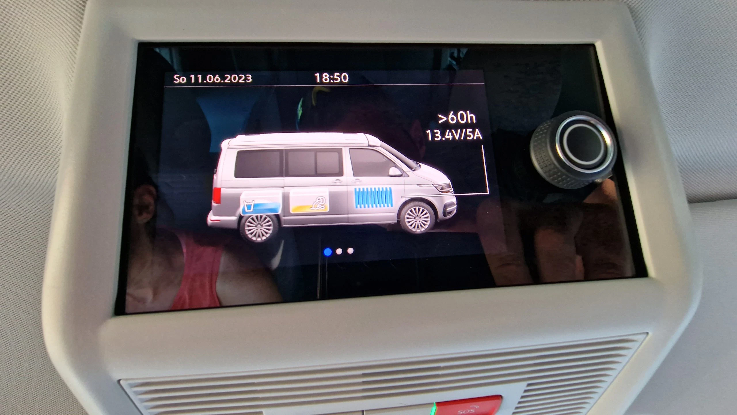 Im California 6.1 Ocean 2.0 sind insgesamt drei Batterien verbaut. Eine im Motorraum, eine unter dem Fahrersitz und eine neben dem Kühlschrank. Die Batterie im Motorraum wird ausschließlich als Starterbatterie verwendet. So ist gewährleistet, dass der Bulli immer anspringt. Die anderen beiden Batterien versorgen den Kühlschrank etc. mit Strom. Wenn man länger als 3 Tage an einer Stelle bleiben möchte, sollte man den Bulli an eine externe Stromquelle anschließen. Im Test war das aber nicht nötig, da wir mit dem Bulli jeden Tag den Platz gewechselt haben und so die Batterien beim Fahren geladen wurden. Den Ladezustand kann man sich auf der Bedieneinheit anzeigen lassen.