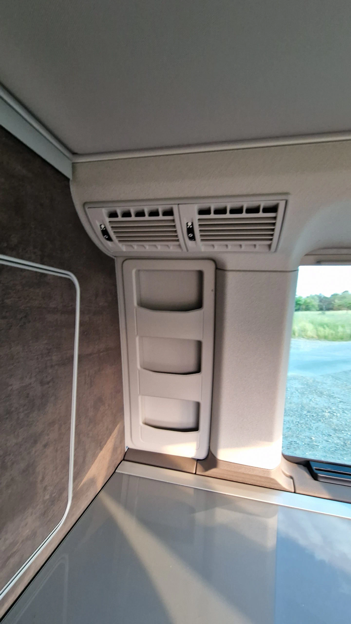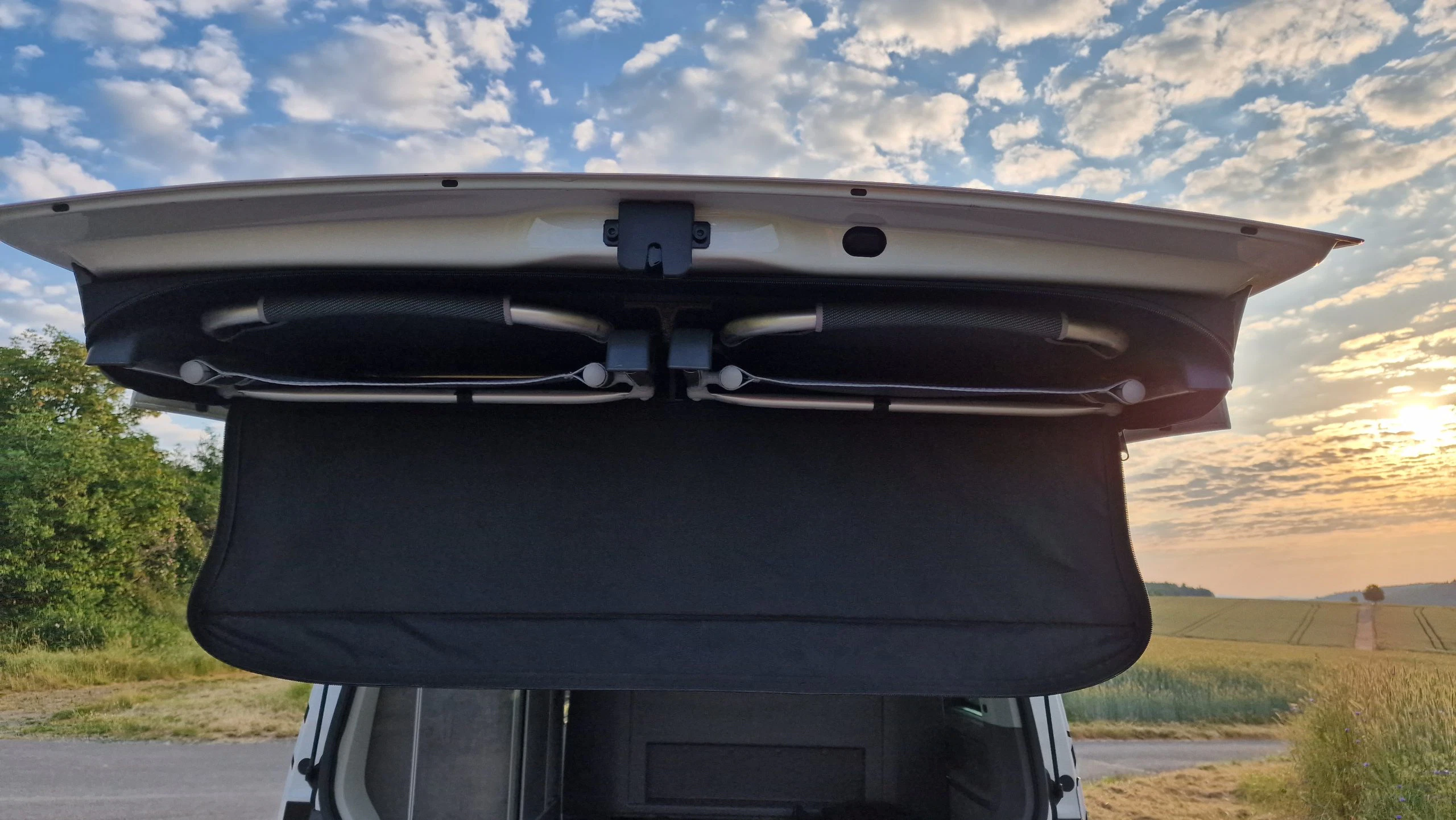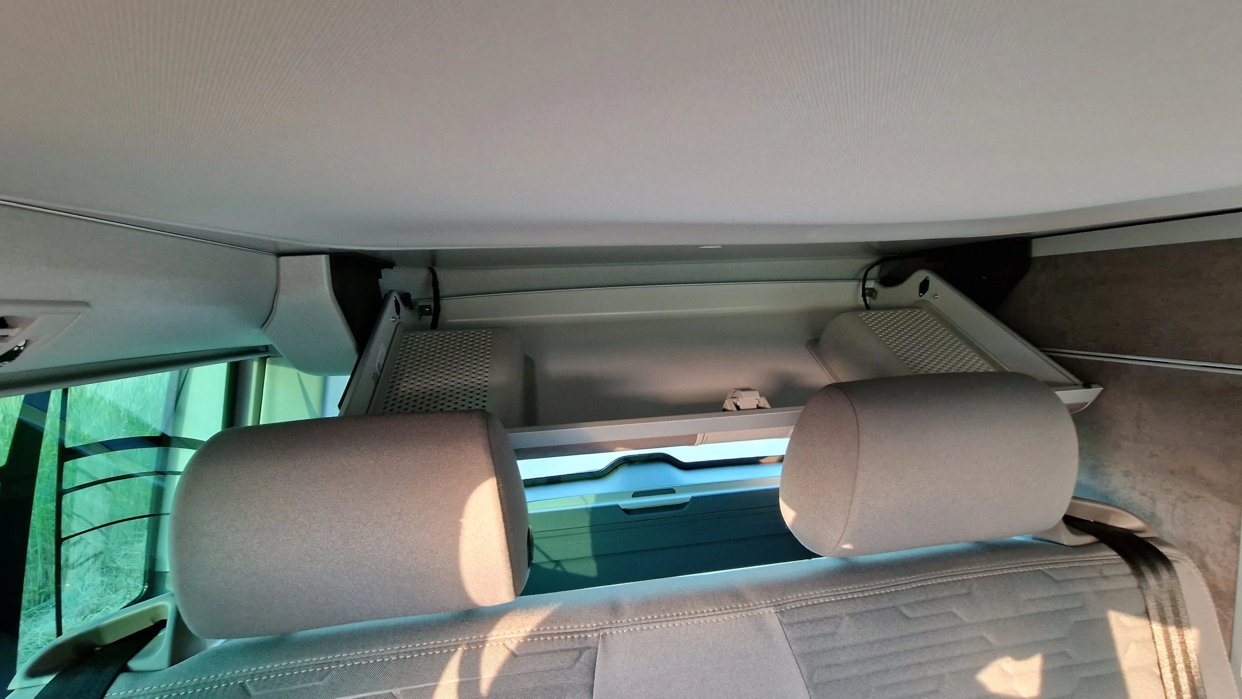 Zu guter Letzt gibt es am Himmel des Kofferraums noch ein weiteres großes Fach, das sich nur von Innen aufschieben lässt. Björn hatte das Fach zuerst gar nicht entdeckt, nutzte es dann aber für seinen Hygieneartikel und Handtücher.