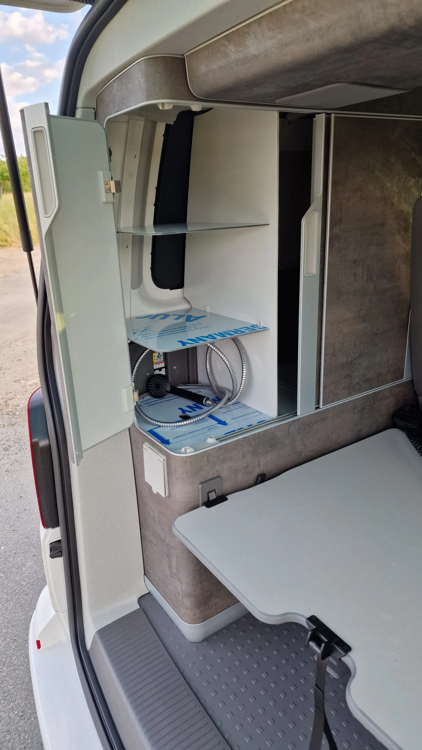 Angegliedert an den “Kleiderschrank” ist ein weiterer Schrank, der in Regalform aufgebaut ist. Hier kommt man nur über die Heckklappe ran. Also gut aufpassen, was man hier rein packt. In unserem Fall verstauten wir hier unsere Laufsachen und Kleinkram. Unter dem unteren Fach befindet sich zudem der Zugang zur Gasflasche und der Campingdusche. Hier am besten nicht allzu viel drauf legen. Da wir nicht so viel Gepäck hatten, konnten wir das untere Fach frei lassen, dort die Campingdusche dann einfach liegen lassen und mussten sie so nicht immer unter dem Fach verstauen.