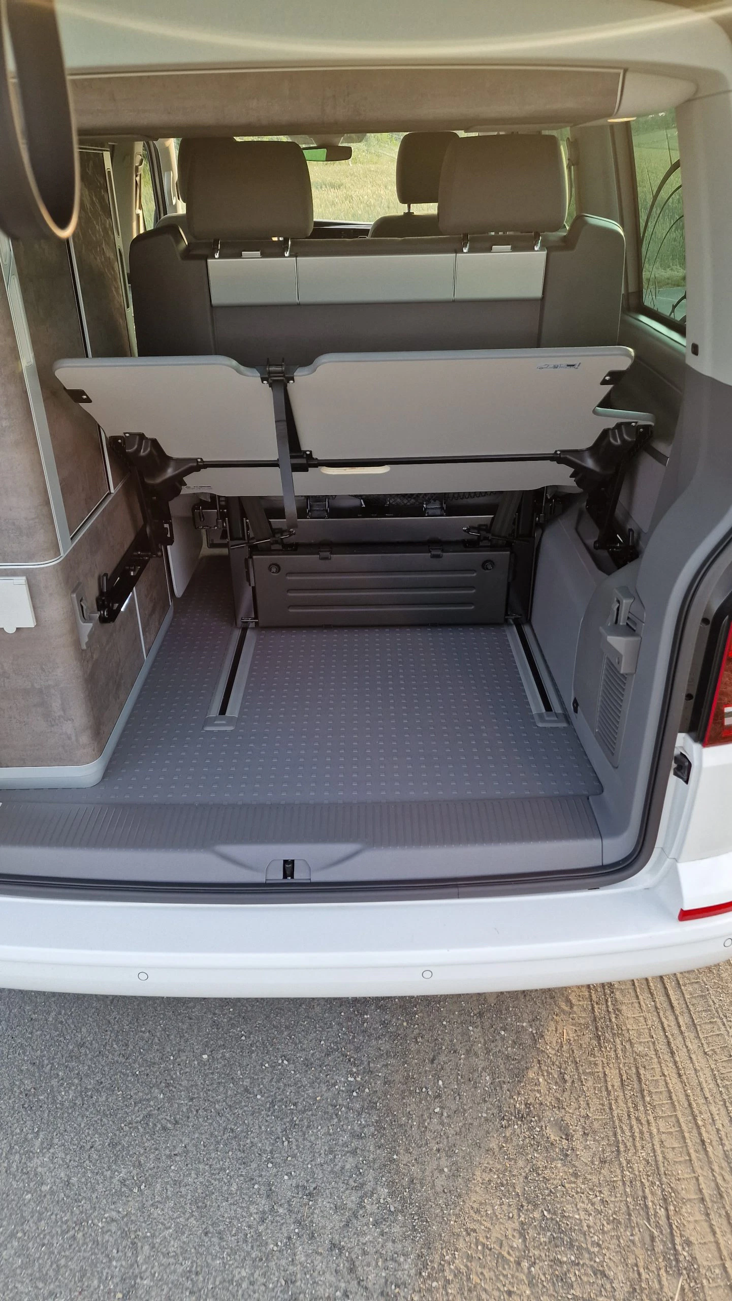 Im Heck oder Kofferraum selbst ist dann noch reichlich Platz für Taschen, Kisten, Zelte, Outdoor-Ausrüstung etc. Hier befindet sich zwar auch ein verstellbares Brett, das man für die Schlafmöglichkeit benötigt. Da wir aber auf die untere Schlafmöglichkeit verzichteten, wurde das Brett als zusätzliche Ablagemöglichkeit im Kofferraum genutzt.