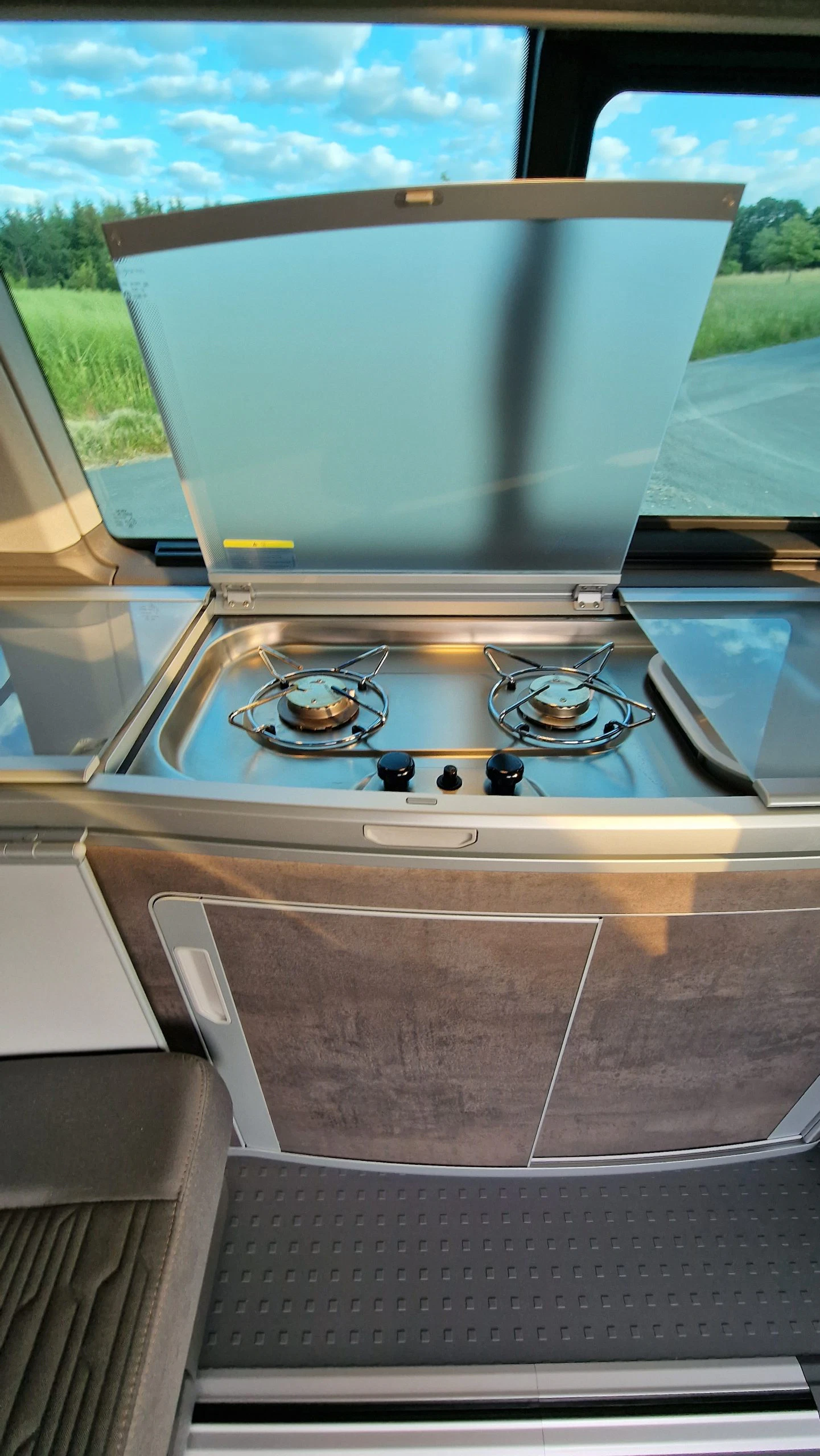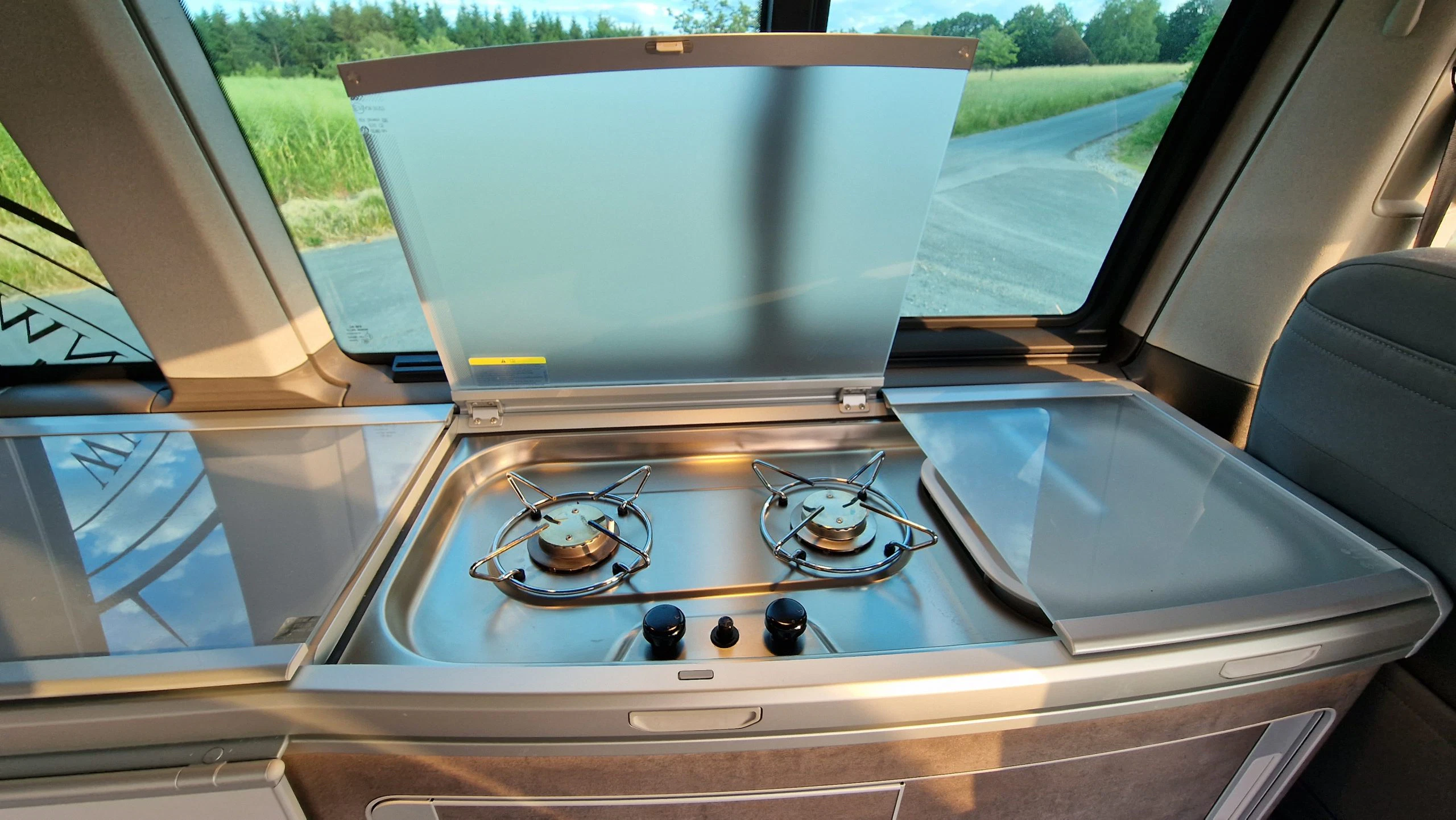 Das Kochfeld hat zwei Kochstellen, die über einen Piezo-Anzünder eingeschaltet werden. Der Sicherheitshahn für die Gasflasche befindet sich im Schrank darunter und dieser sollte nach dem Kochen auch wieder geschlossen werden. Uns gefiel die Kochstelle sehr gut, da man hier ausreichend Platz hat bequem mit beiden Flammen parallel zu kochen. Bei aufgestelltem Dach konnte Björn sogar beim Kochen stehen. Allerdings gefiel ihm die sitzende Variante besser.