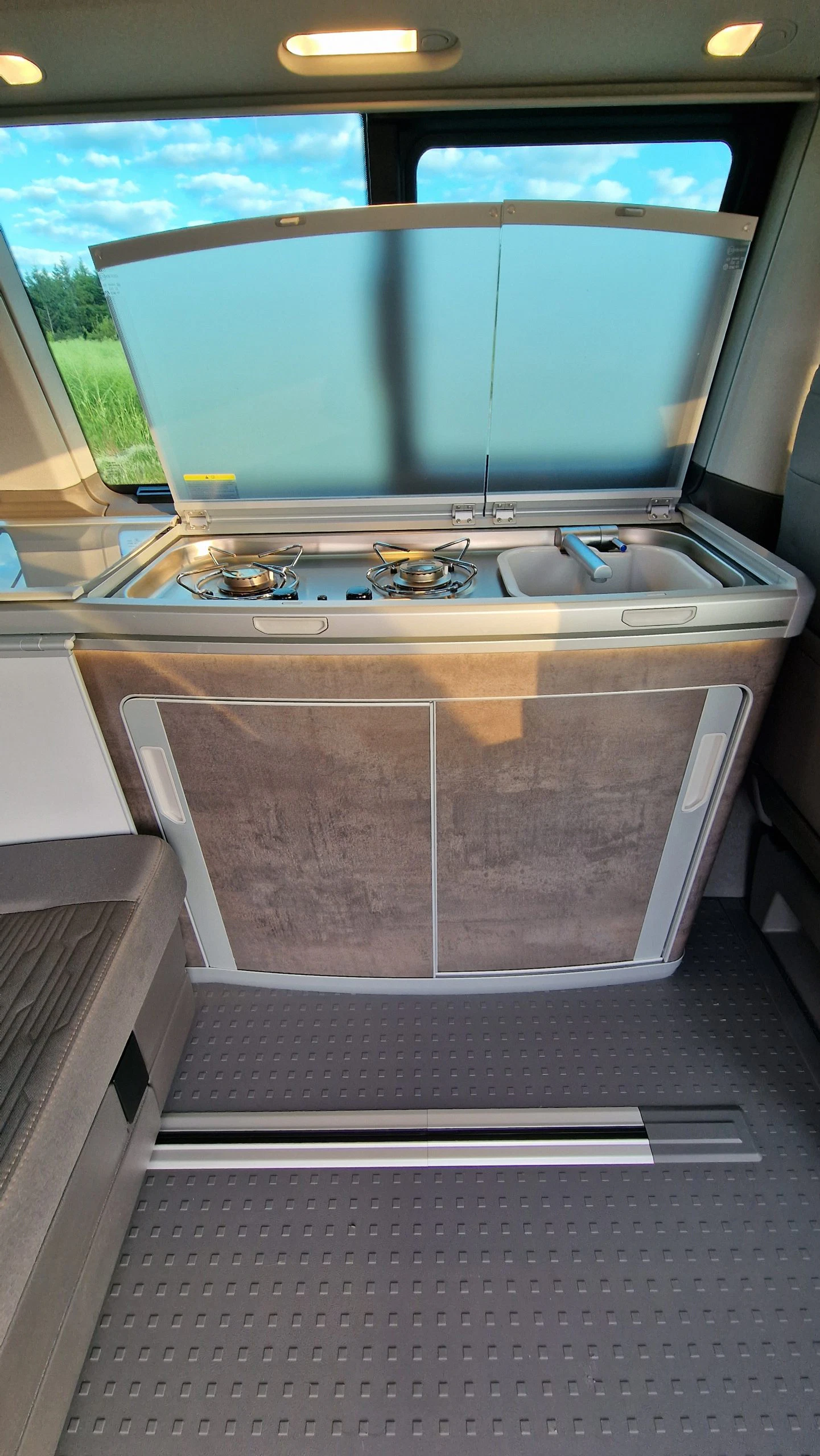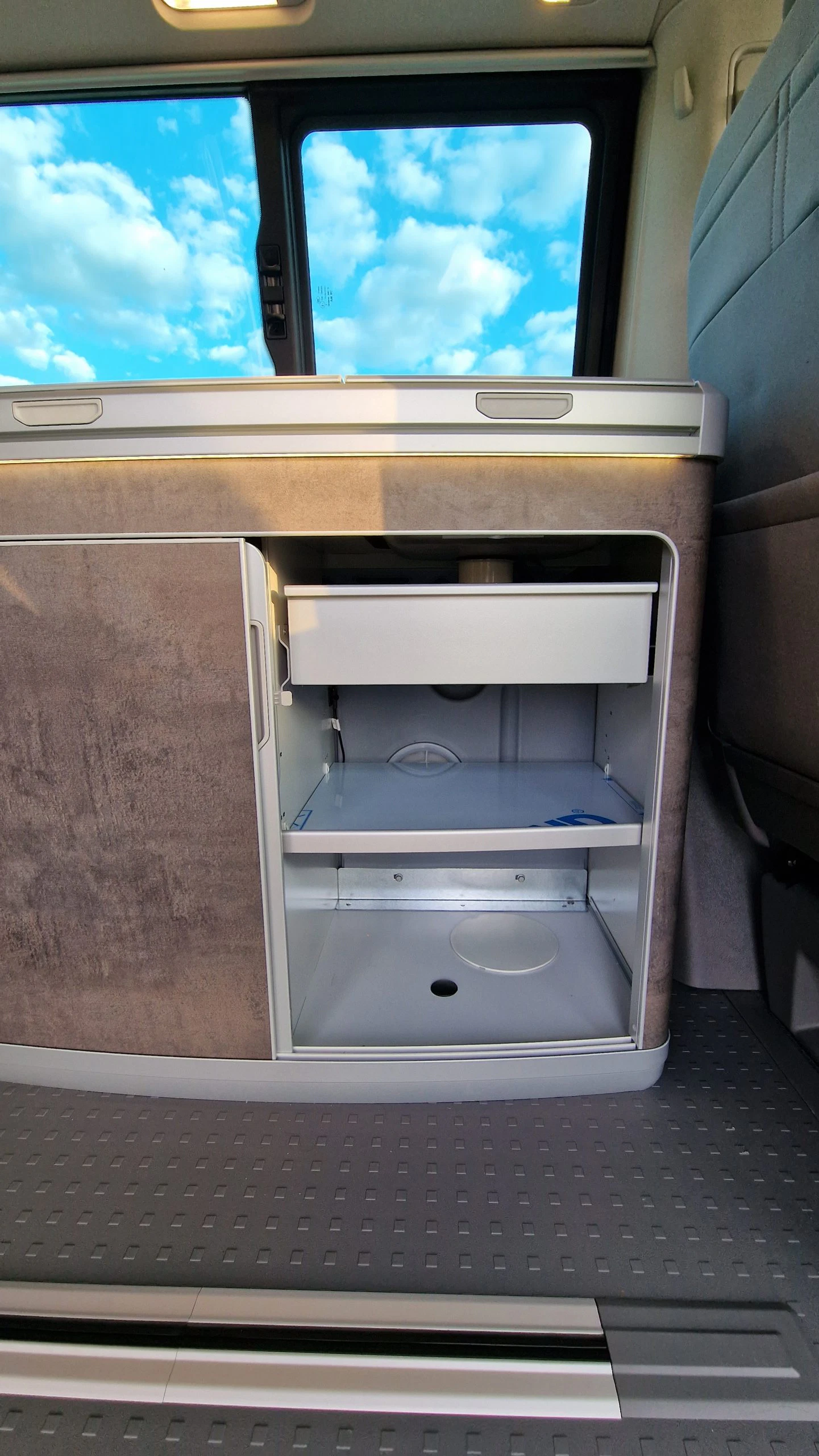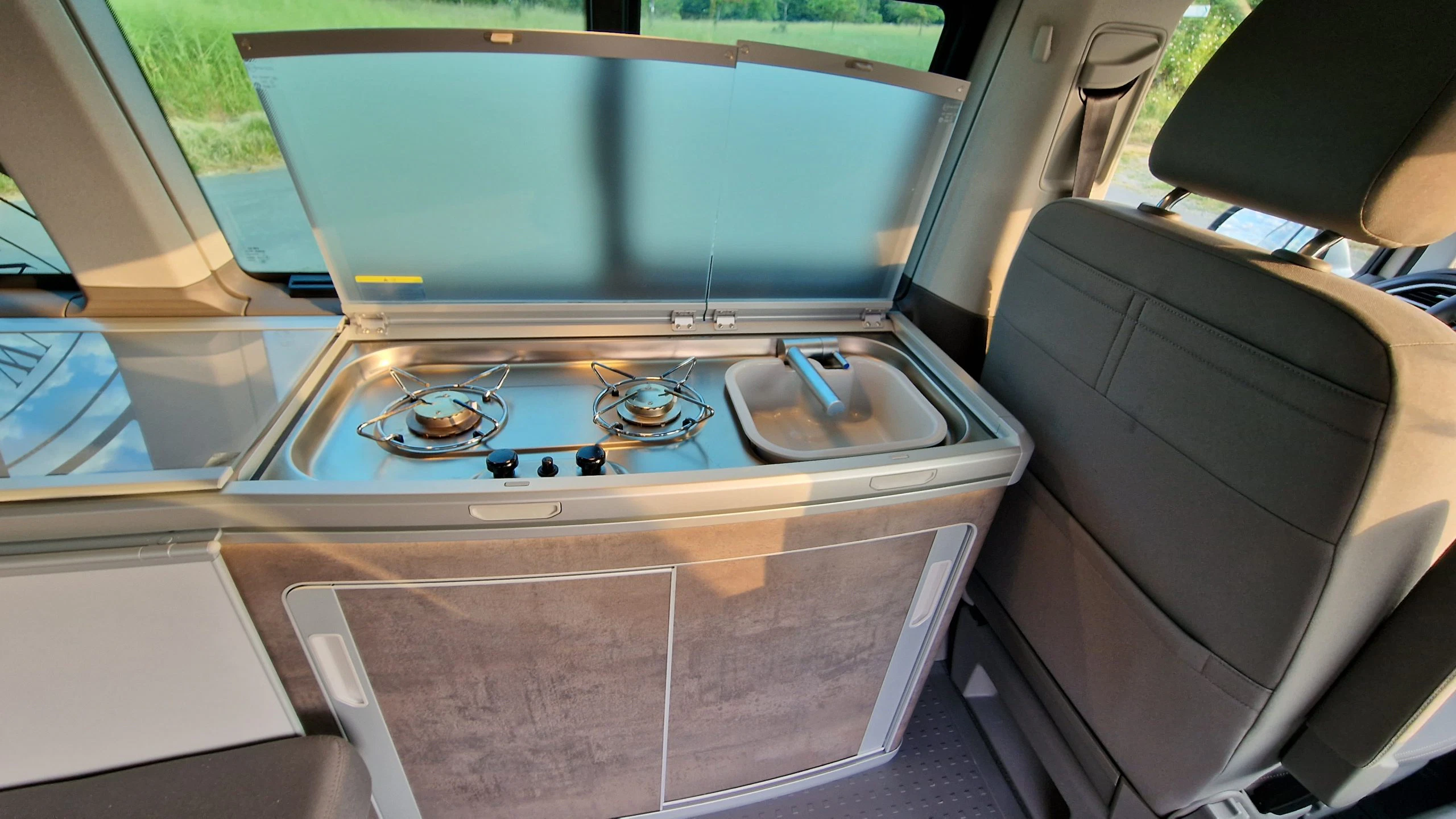 Die verbaute Spüle ist an einen 30 Liter Frischwassertank angeschlossen und das Brauchwasser fließt ebenfalls in einen 30 Liter Tank. Zur Nutzung muss der Wasserhahn aus der Spüle nach oben geklappt und über einen konventionellen Drehregler geöffnet werden. Vom Wasserdruck aus dem Hahn waren wir dann sehr überrascht, dieser war so stark, dass es aus der Spüle spritzte und die Rückenlehne des Fahrersitzes nass wurde. Dies ist auch ein kleines Manko aus unserer Sicht. Wenn man den Fahrersitz nicht dreht oder nach vorne schiebt, besteht immer die Gefahr, dass die Lehne nass oder sogar verschmutzt wird beim Spülen, da diese einfach zu nah am Spülbecken ist. Auch wenn die Spüle sicherlich clever verbaut ist, für richtiges Spülen ist sie zu klein. Daher nutzten wir die alt bekannte Spülwanne vor dem Bulli. Für ein schnelles Gläser spülen oder Zähneputzen ist das Spülbecken aber ideal und das Brauchwasser läuft schnell ab.